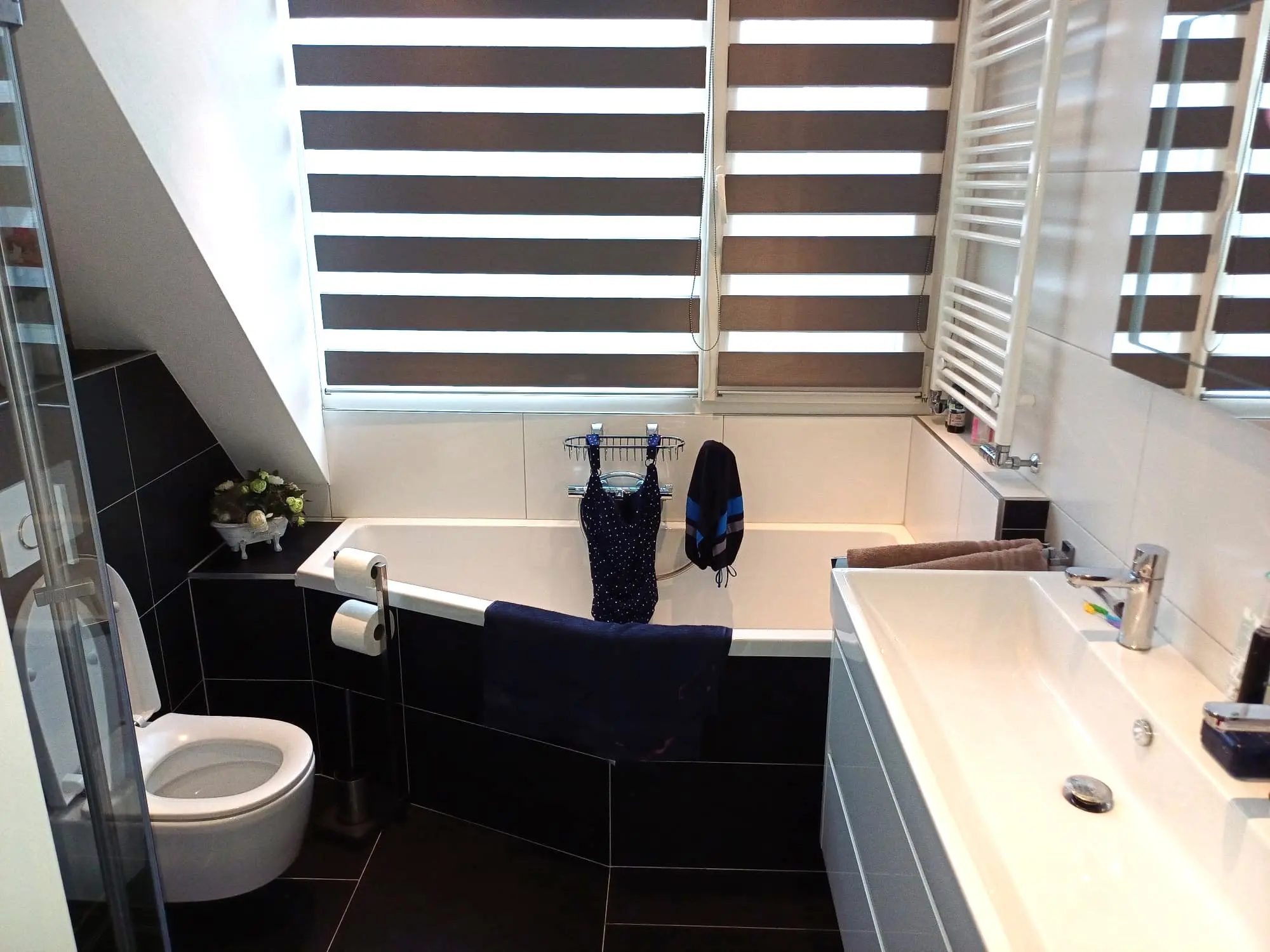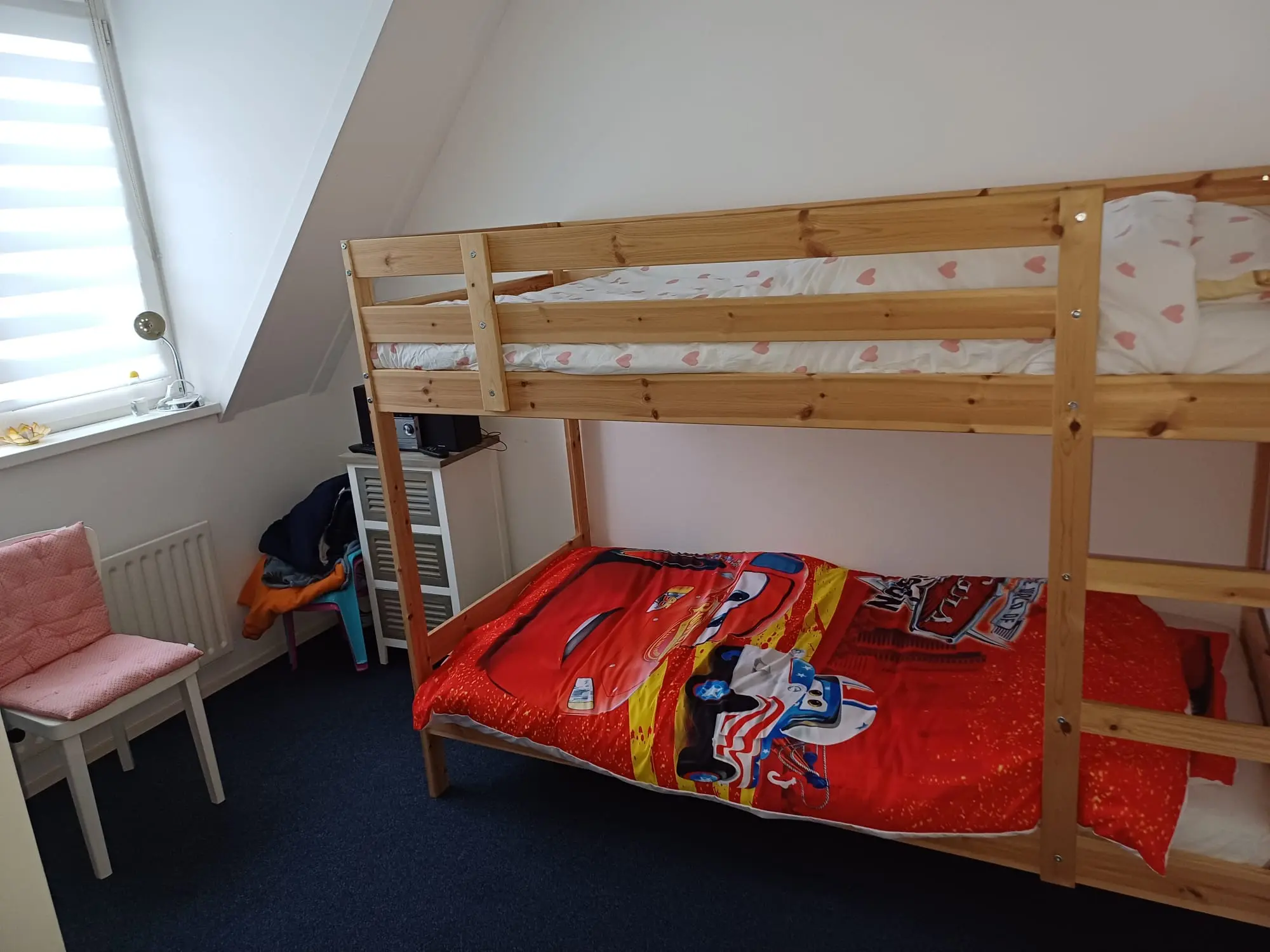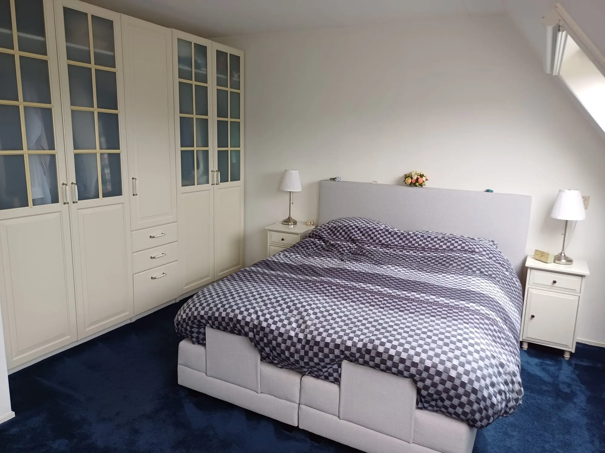 Overloop, riante ouderslaapkamer aan de voorzijde (voorheen 2 kamers) met inbouwkasten en twee dakramen. Slaapkamer aan de achterzijde voorzien van een stapelbed. Luxe badkamer met een ligbad, separate douche, 2e toilet en een wastafelmeubel met twee kranen.
