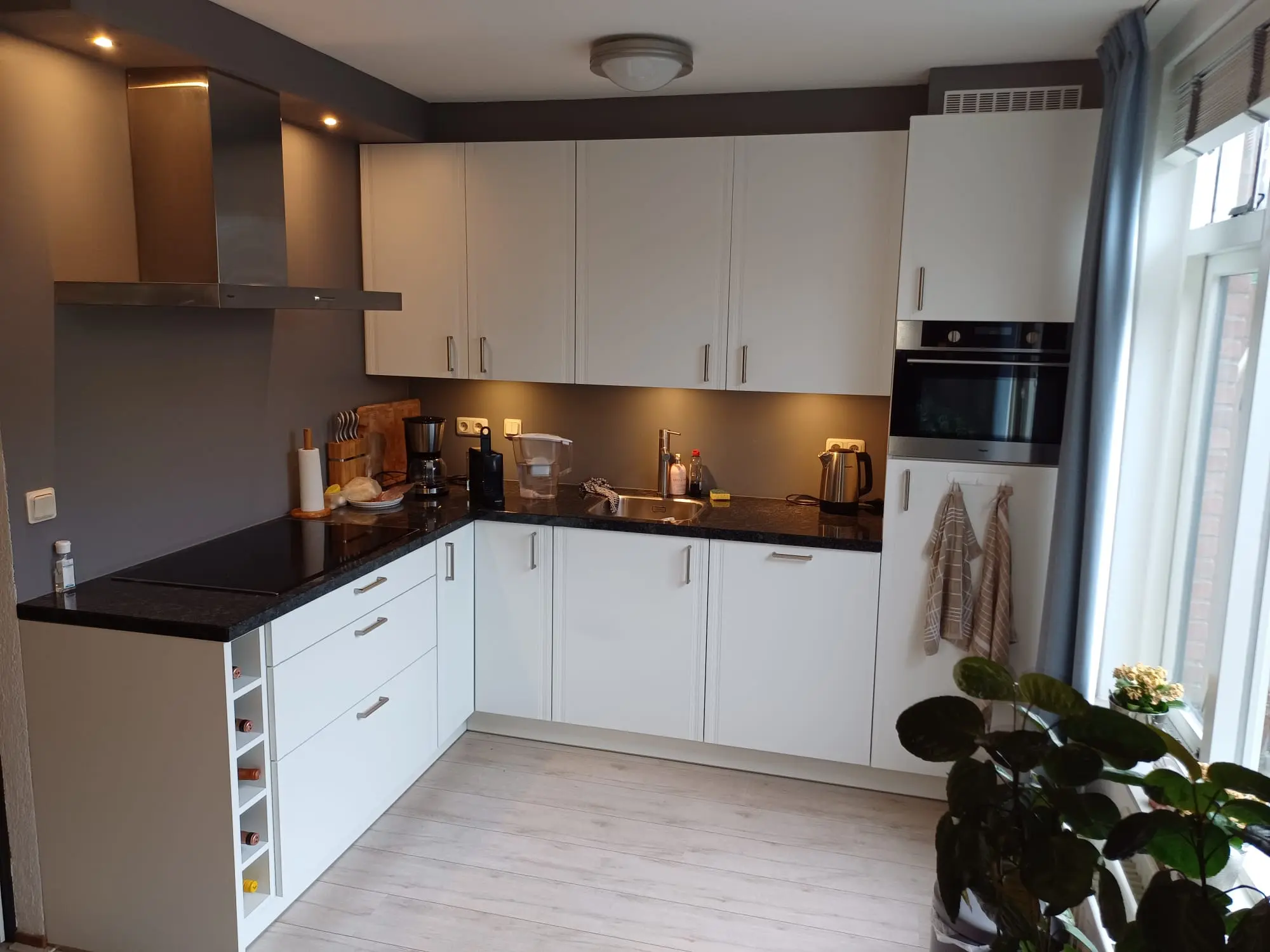 Entree/hal met de meterkast. Woonkamer met open keuken. De keuken is gesitueerd in een hoekopstelling en beschikt over inbouwapparatuur waaronder: vaatwasser, koelkast, inductiekookplaat met afzuigkap.