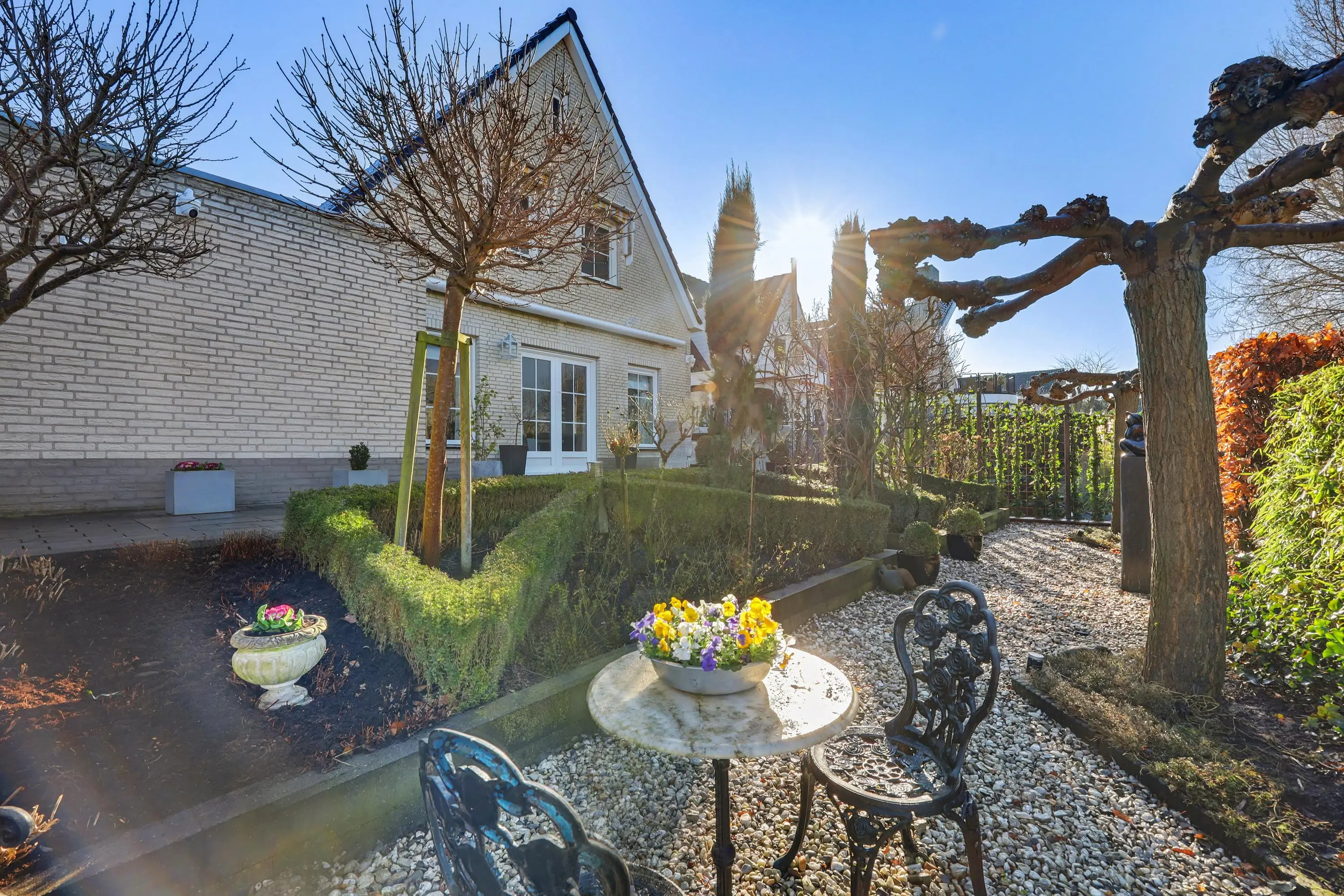 Fraai aangelegde op het zuidwesten gelegen zonovergoten tuin voorzien van meerdere terrassen grenzend aan een waterpartij. Tuinverlichting, waterkraan, borders met vaste beplanting. Afsluitbaar hekwerk aan zijkant woning. Ruime tuin aan de voorzijde met zitgelegenheid. Ruime onderheide oprit, voorzien van onderheid elektronisch hekwerk en afsluitbaar inloophek met dranger.
