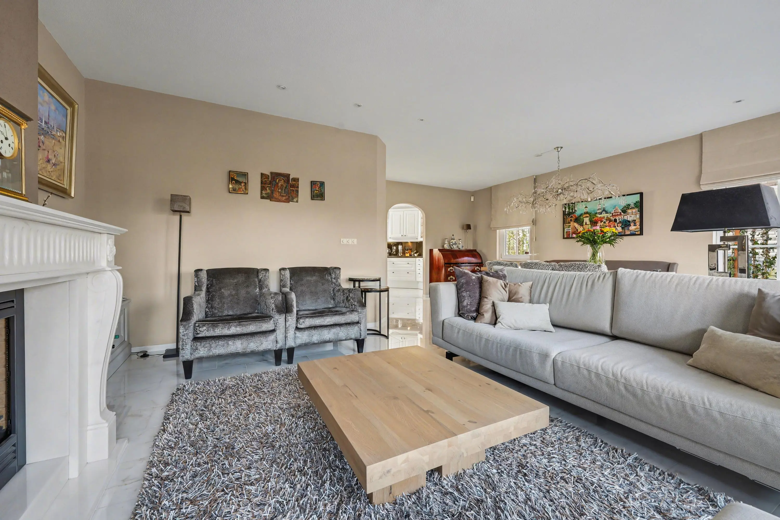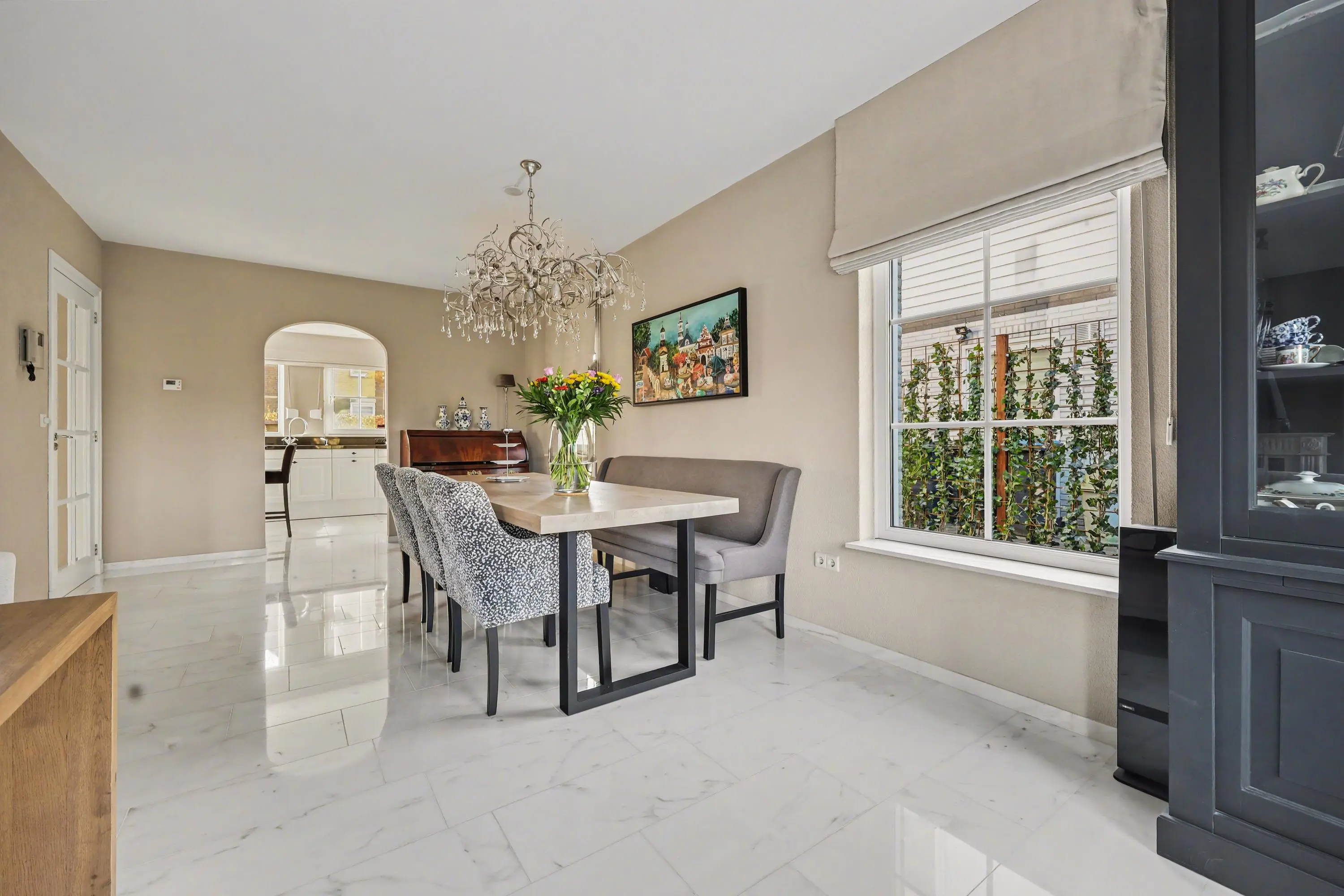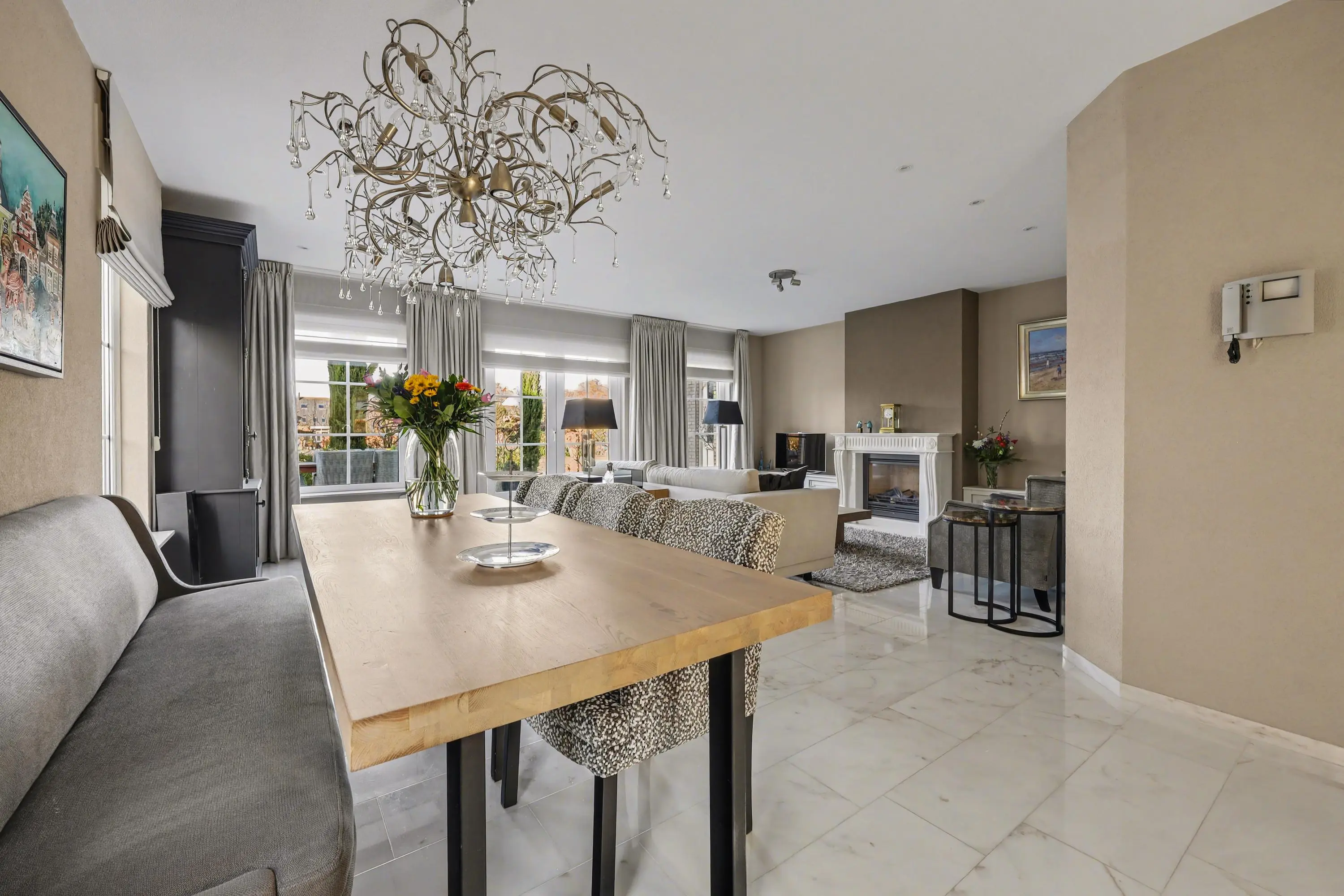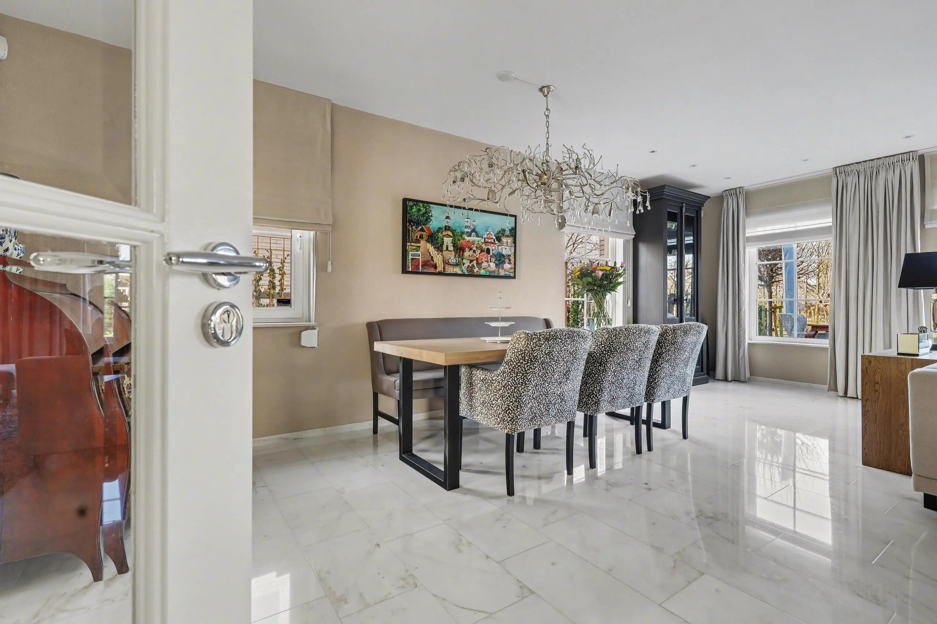 Royale woonkamer met veel daglichtinval, sfeervolle Faber gashaard met marmeren schouw, op maat gemaakte dressoirs en strakke plafondafwerking. Bij het zitgedeelte van de woonkamer een set openslaande deuren naar de tuin. Aansluitend de halfopen keuken in lichte hoogglans kleurstelling uitgevoerd met granieten aanrechtblad, Dornbracht kraan, inductie kookplaat, afzuigkap, combi-oven, koel-/vriescombinatie, vaatwasmachine, dubbele spoelbak en kastruimte. Keukenapparatuur grotendeels uit 2023/24. Tevens beschikt de keuken over een werkeiland met granieten blad voorzien van drie hoge stoelen en aan weerszijden twee regaalkasten. Woonkamer en keuken voorzien van marmeren vloerafwerking.