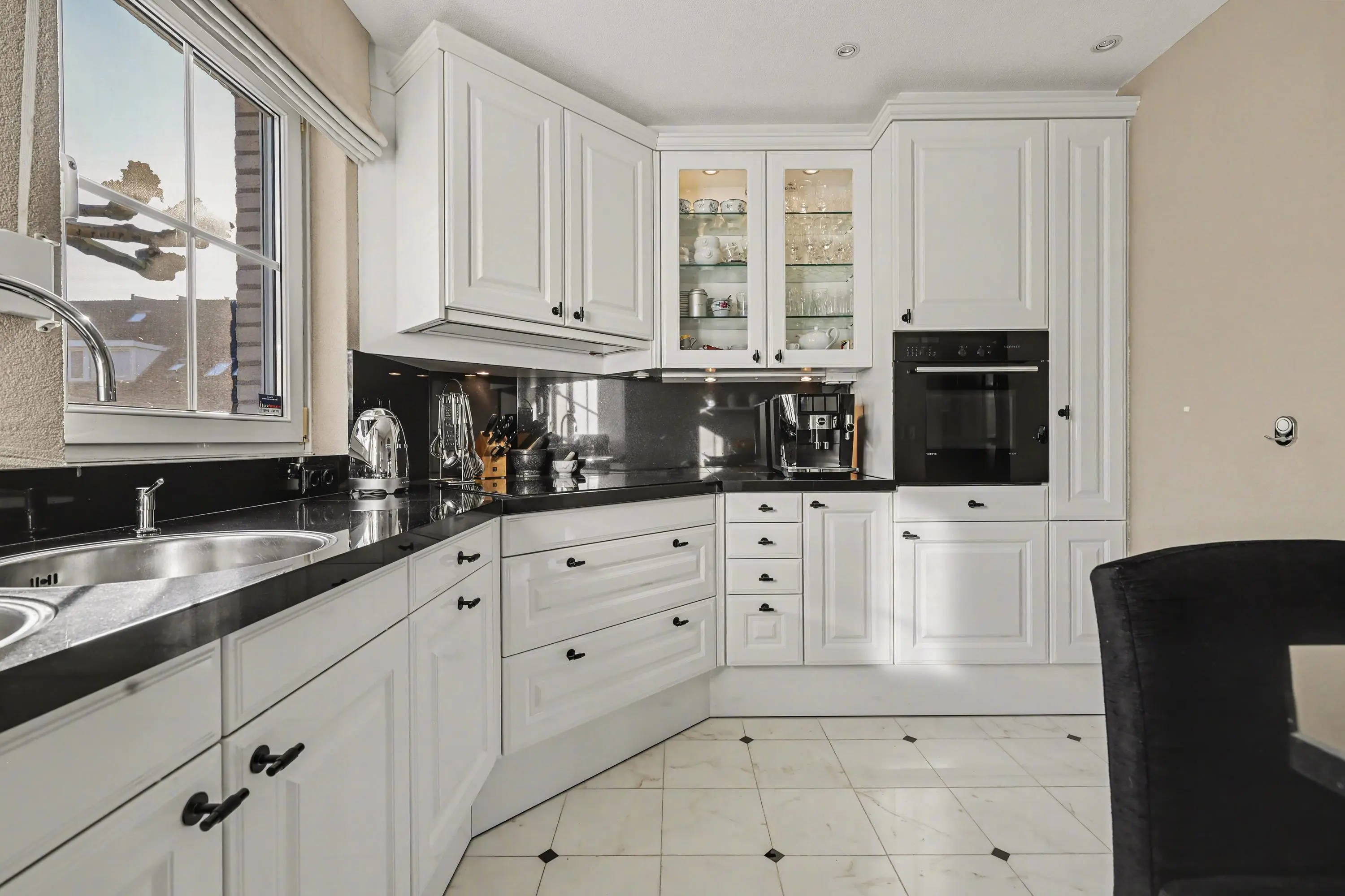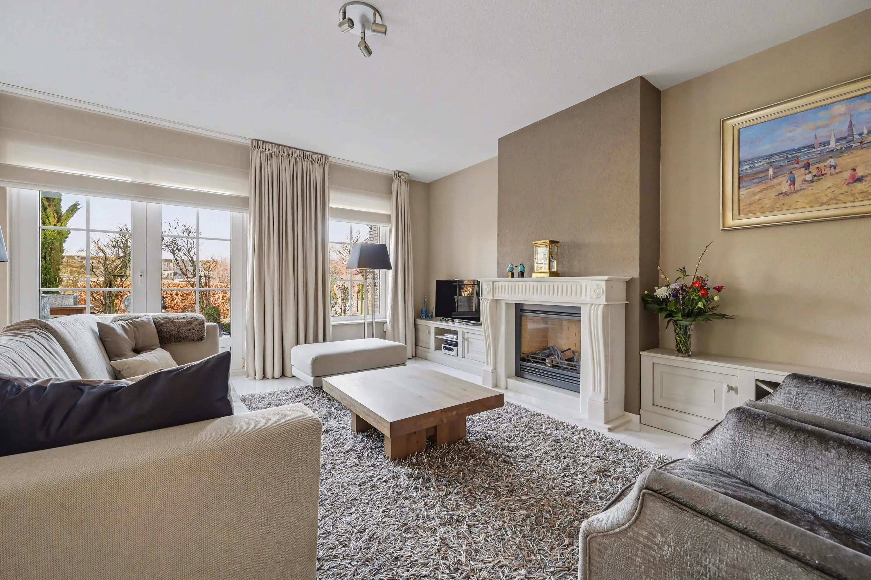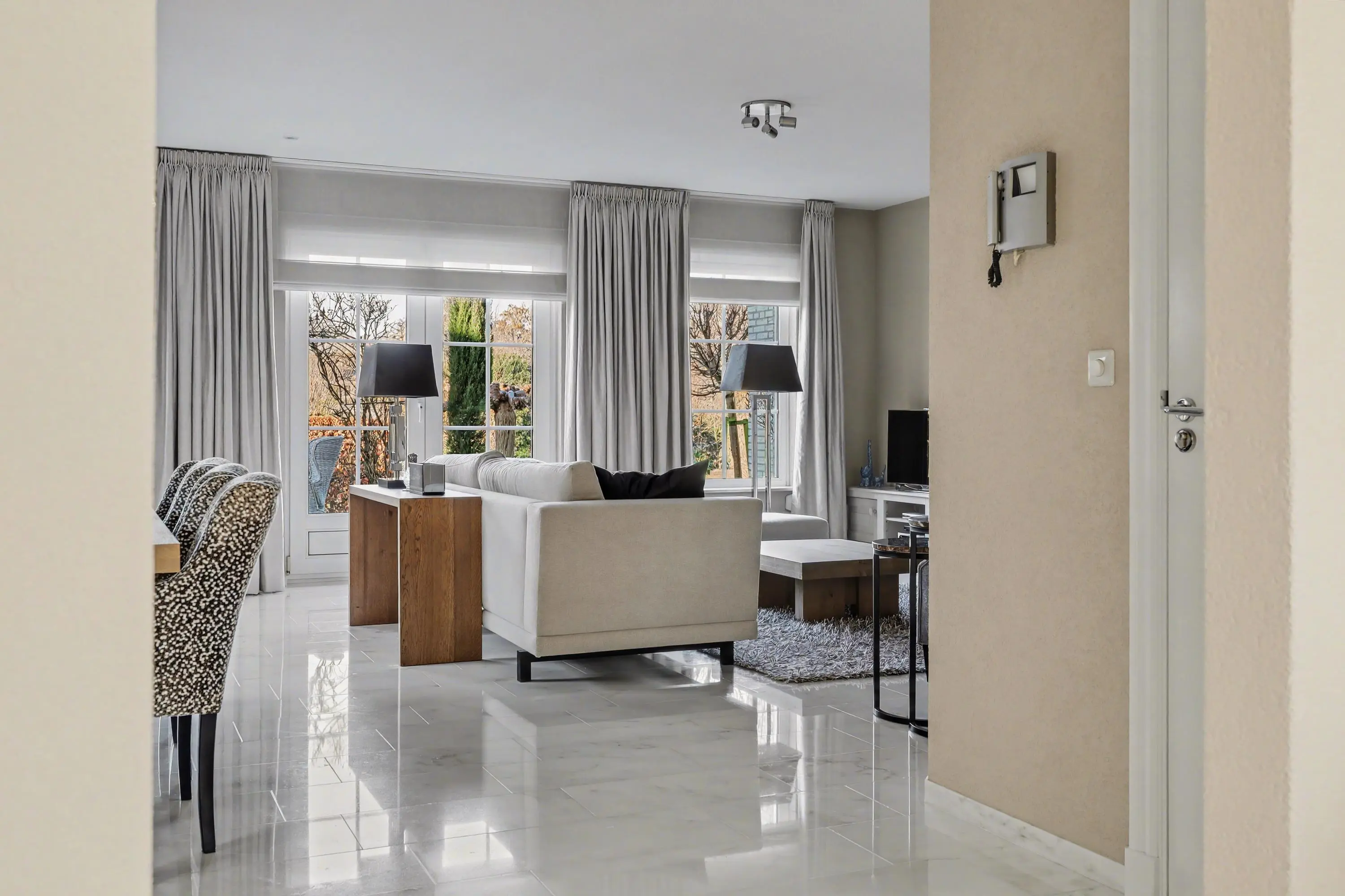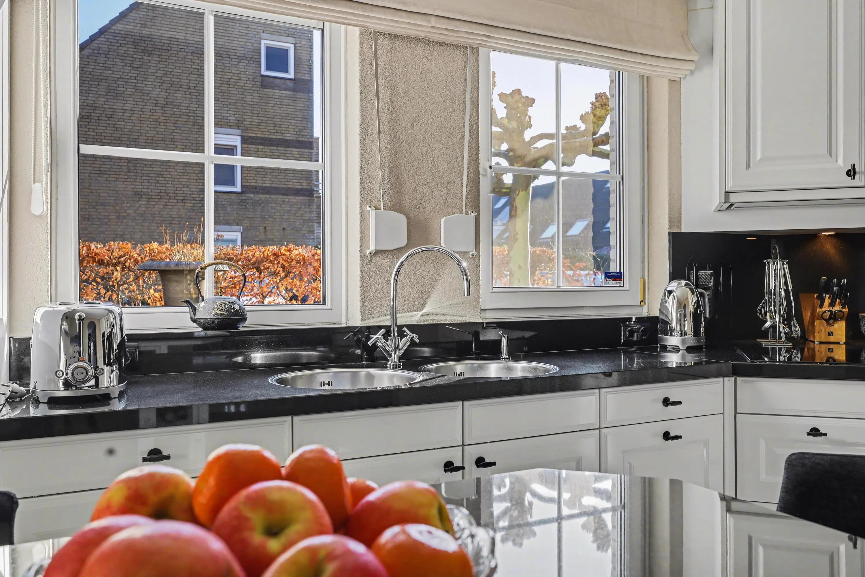 Royale woonkamer met veel daglichtinval, sfeervolle Faber gashaard met marmeren schouw, op maat gemaakte dressoirs en strakke plafondafwerking. Bij het zitgedeelte van de woonkamer een set openslaande deuren naar de tuin. Aansluitend de halfopen keuken in lichte hoogglans kleurstelling uitgevoerd met granieten aanrechtblad, Dornbracht kraan, inductie kookplaat, afzuigkap, combi-oven, koel-/vriescombinatie, vaatwasmachine, dubbele spoelbak en kastruimte. Keukenapparatuur grotendeels uit 2023/24. Tevens beschikt de keuken over een werkeiland met granieten blad voorzien van drie hoge stoelen en aan weerszijden twee regaalkasten. Woonkamer en keuken voorzien van marmeren vloerafwerking.