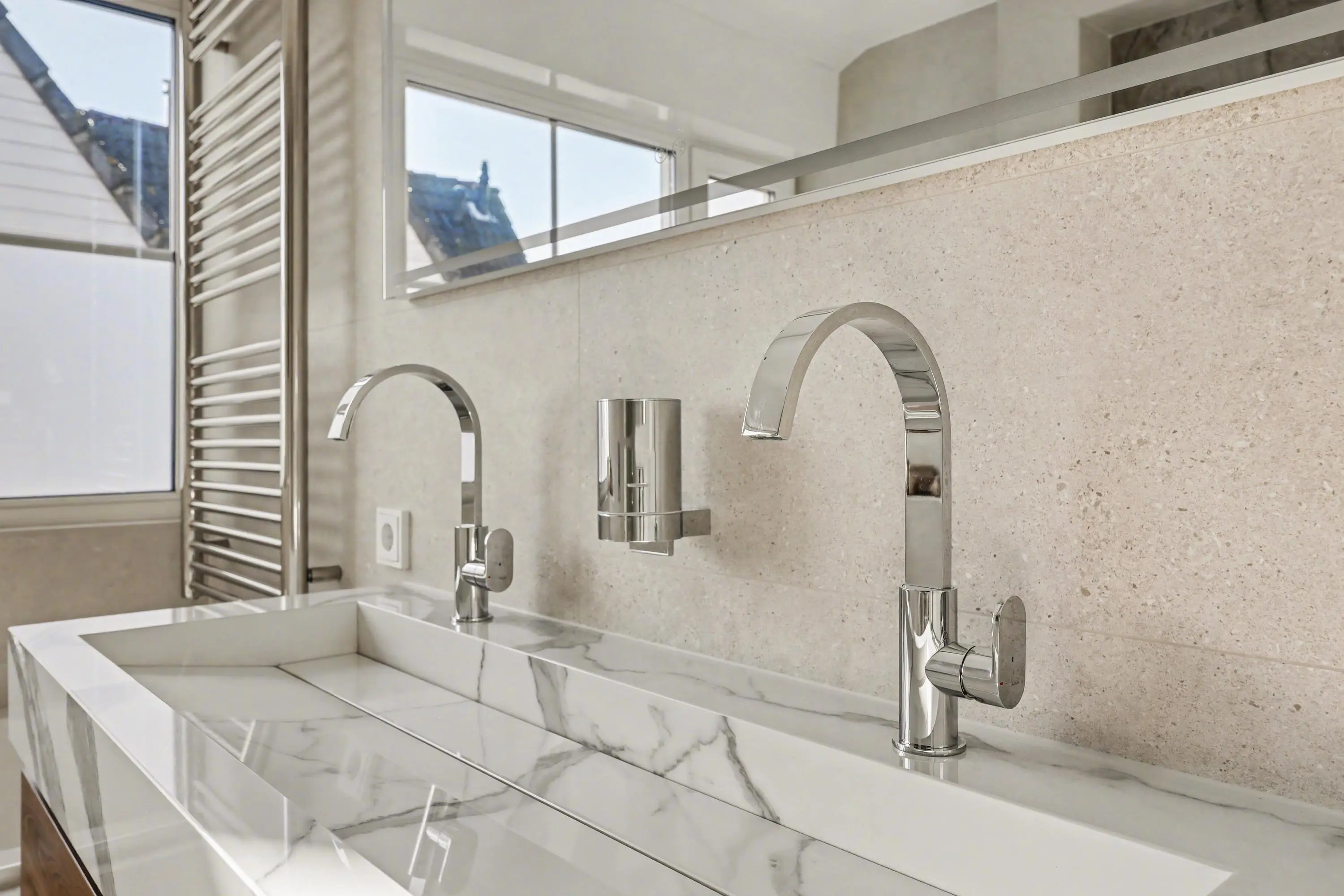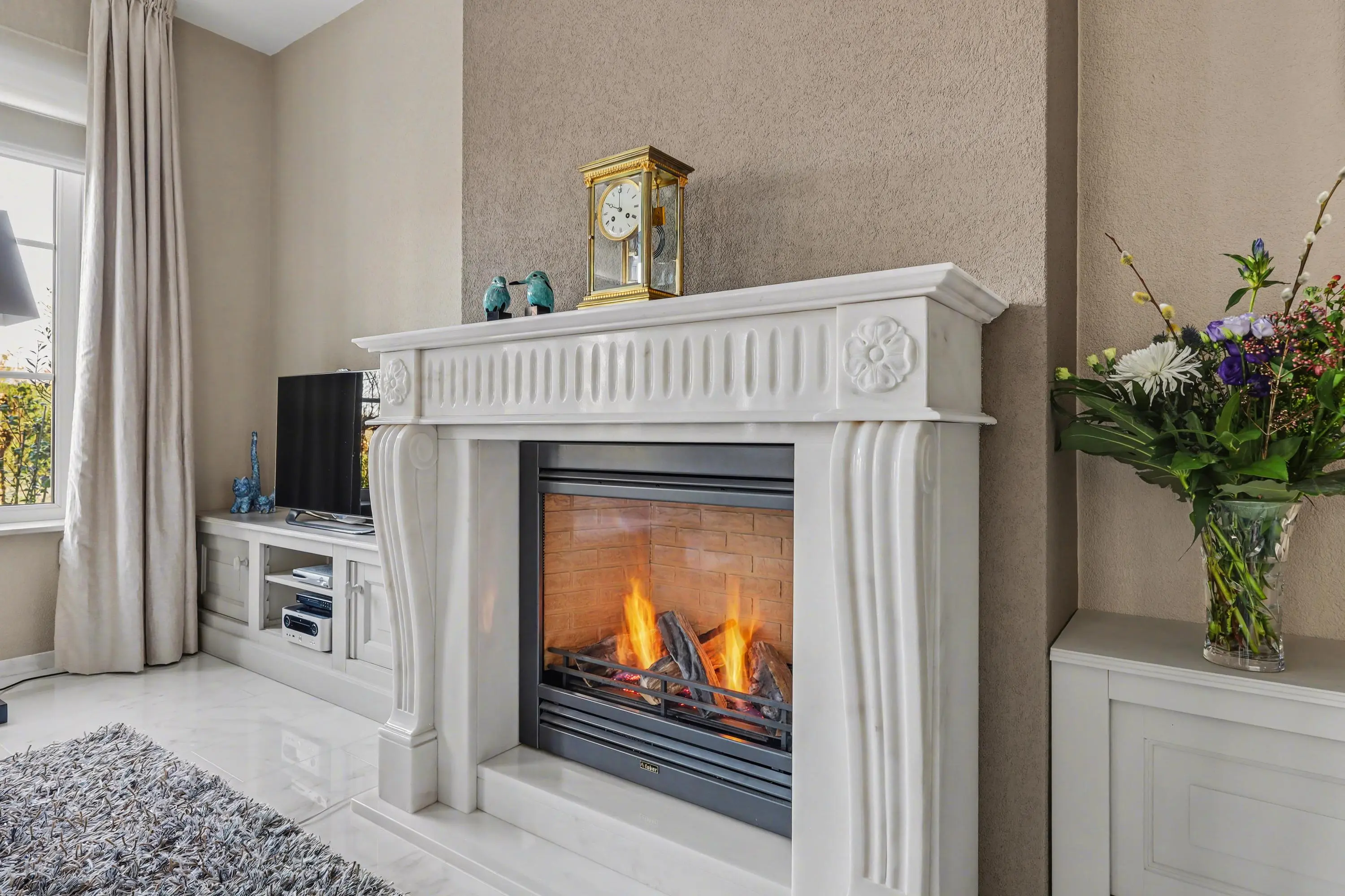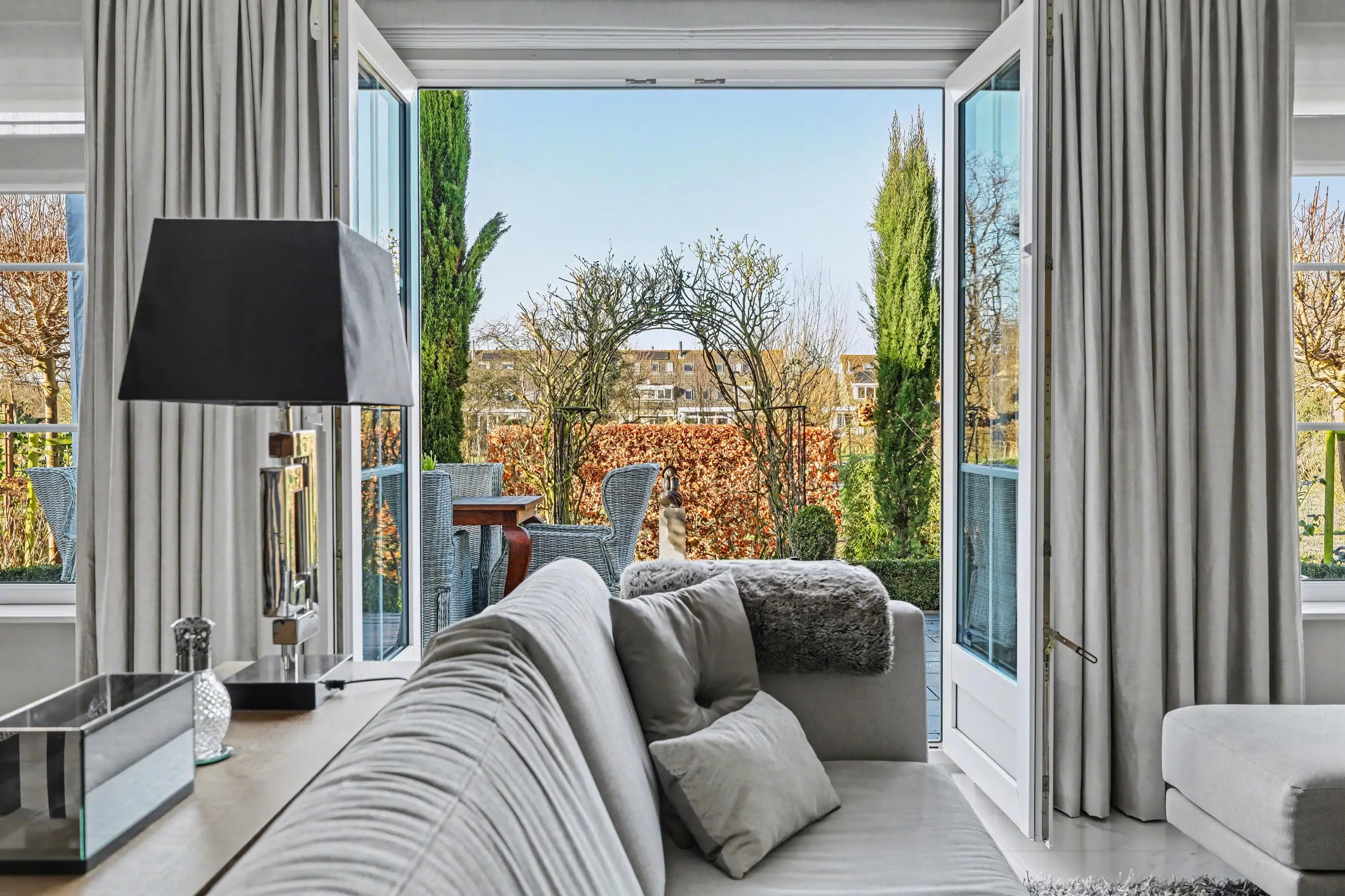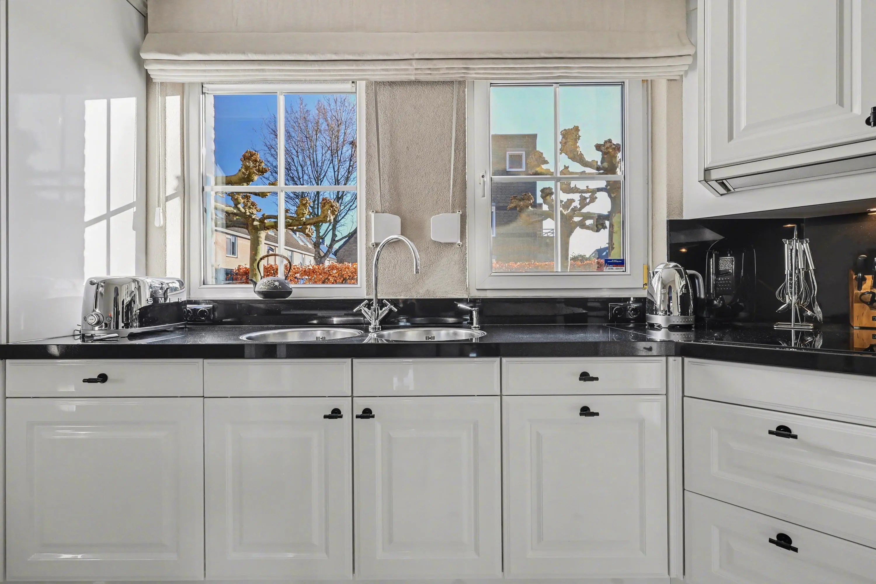 Royale woonkamer met veel daglichtinval, sfeervolle Faber gashaard met marmeren schouw, op maat gemaakte dressoirs en strakke plafondafwerking. Bij het zitgedeelte van de woonkamer een set openslaande deuren naar de tuin. Aansluitend de halfopen keuken in lichte hoogglans kleurstelling uitgevoerd met granieten aanrechtblad, Dornbracht kraan, inductie kookplaat, afzuigkap, combi-oven, koel-/vriescombinatie, vaatwasmachine, dubbele spoelbak en kastruimte. Keukenapparatuur grotendeels uit 2023/24. Tevens beschikt de keuken over een werkeiland met granieten blad voorzien van drie hoge stoelen en aan weerszijden twee regaalkasten. Woonkamer en keuken voorzien van marmeren vloerafwerking.