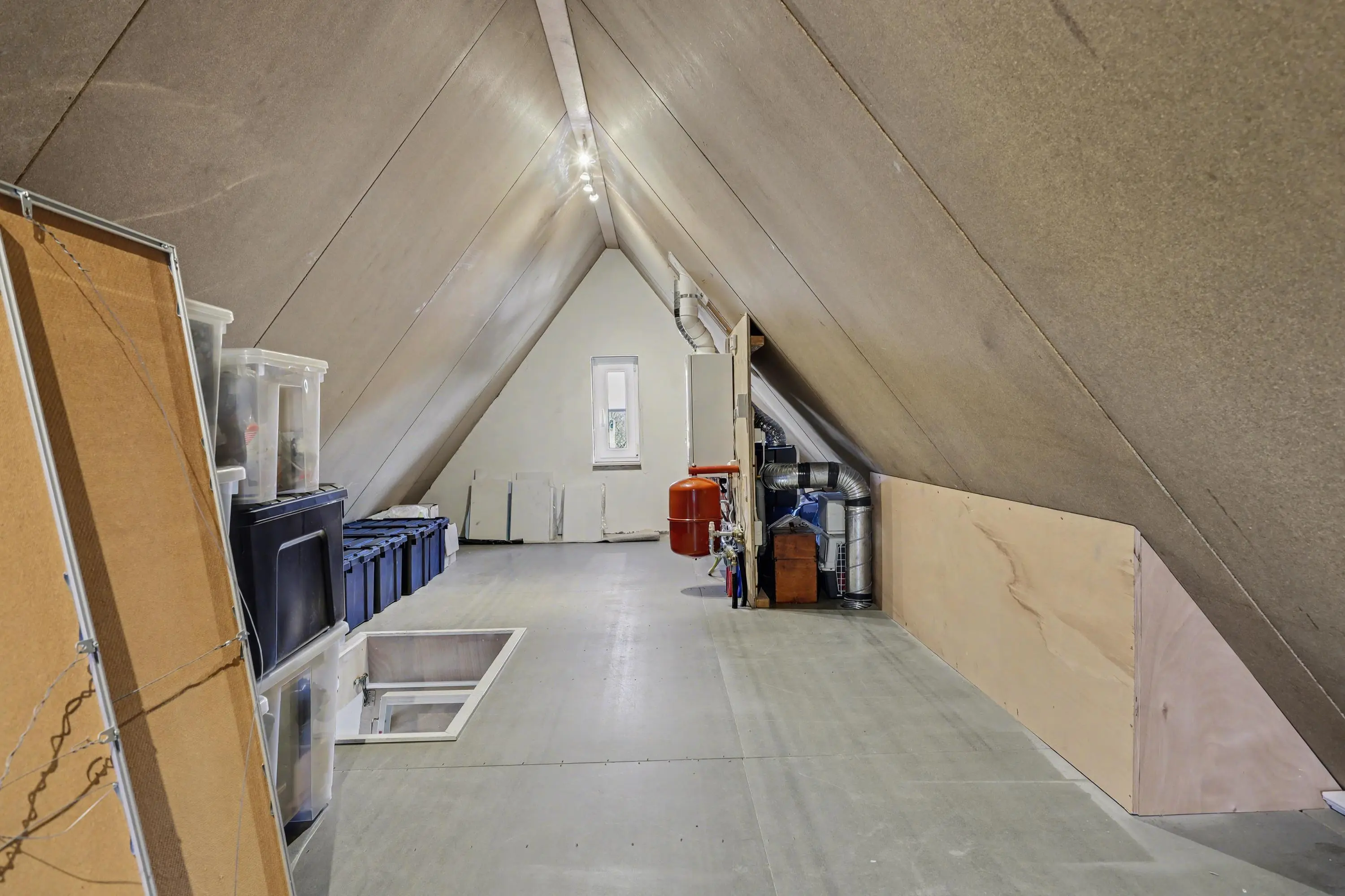 Bergzolder over de gehele lengte van de woning, voorzien van twee ramen. Deze is middels een stalen vlizotrap te bereiken. Opstelling van de CV combiketel (2026, warmtepomp/waterstof ready). CO2 melder.