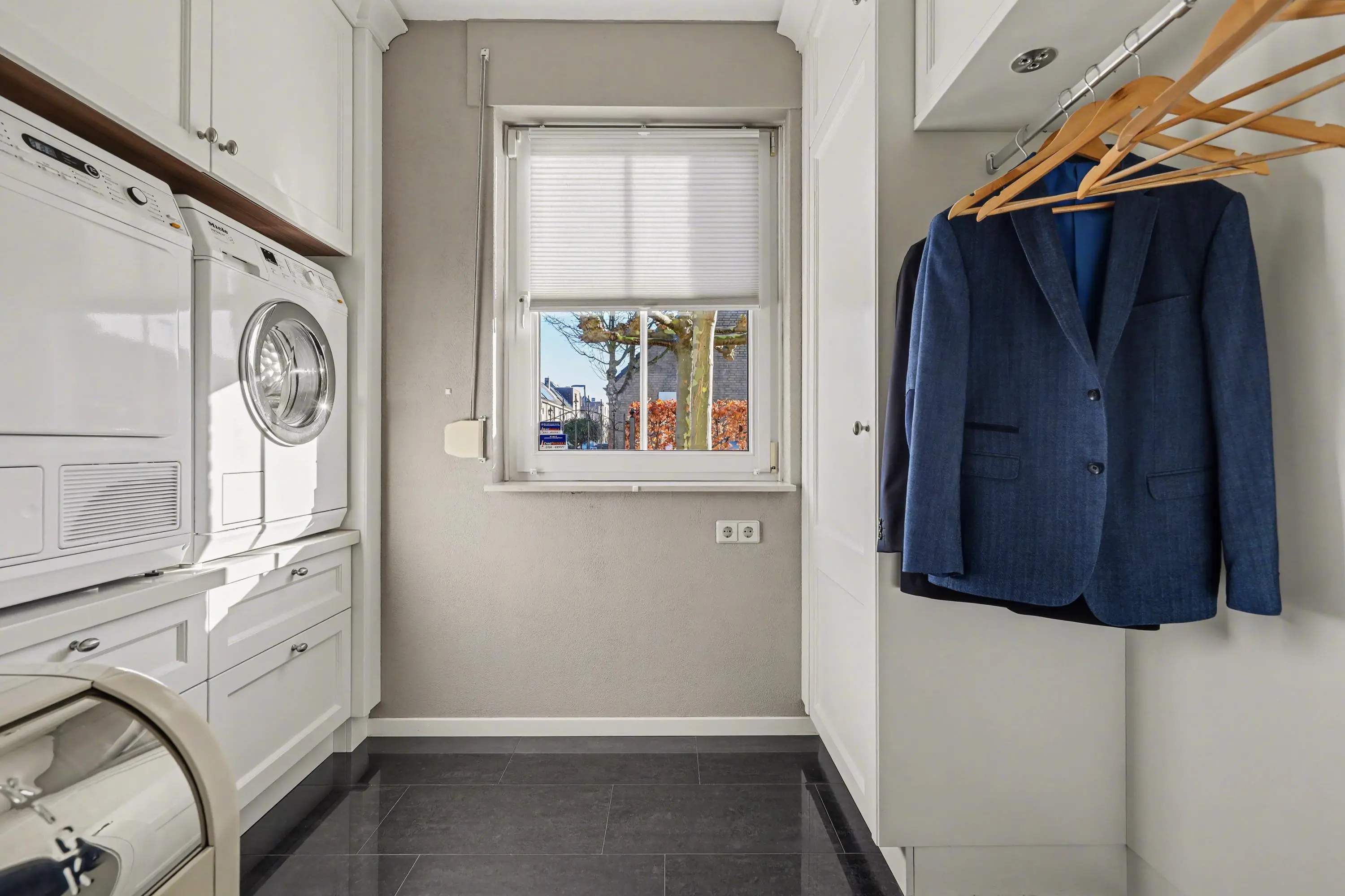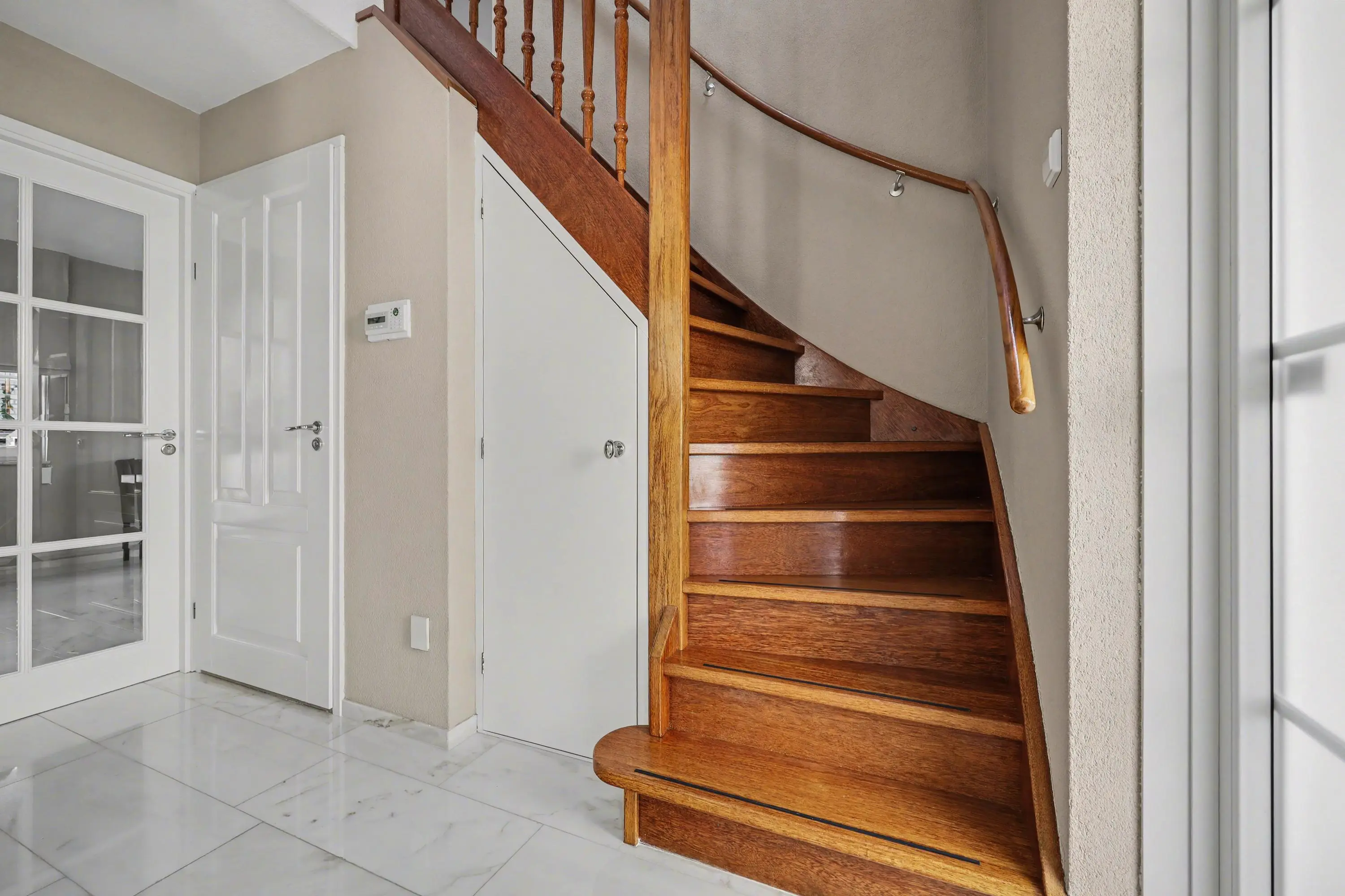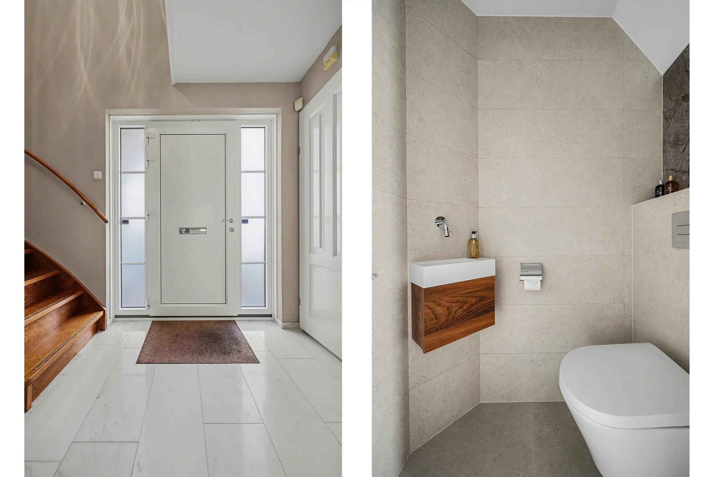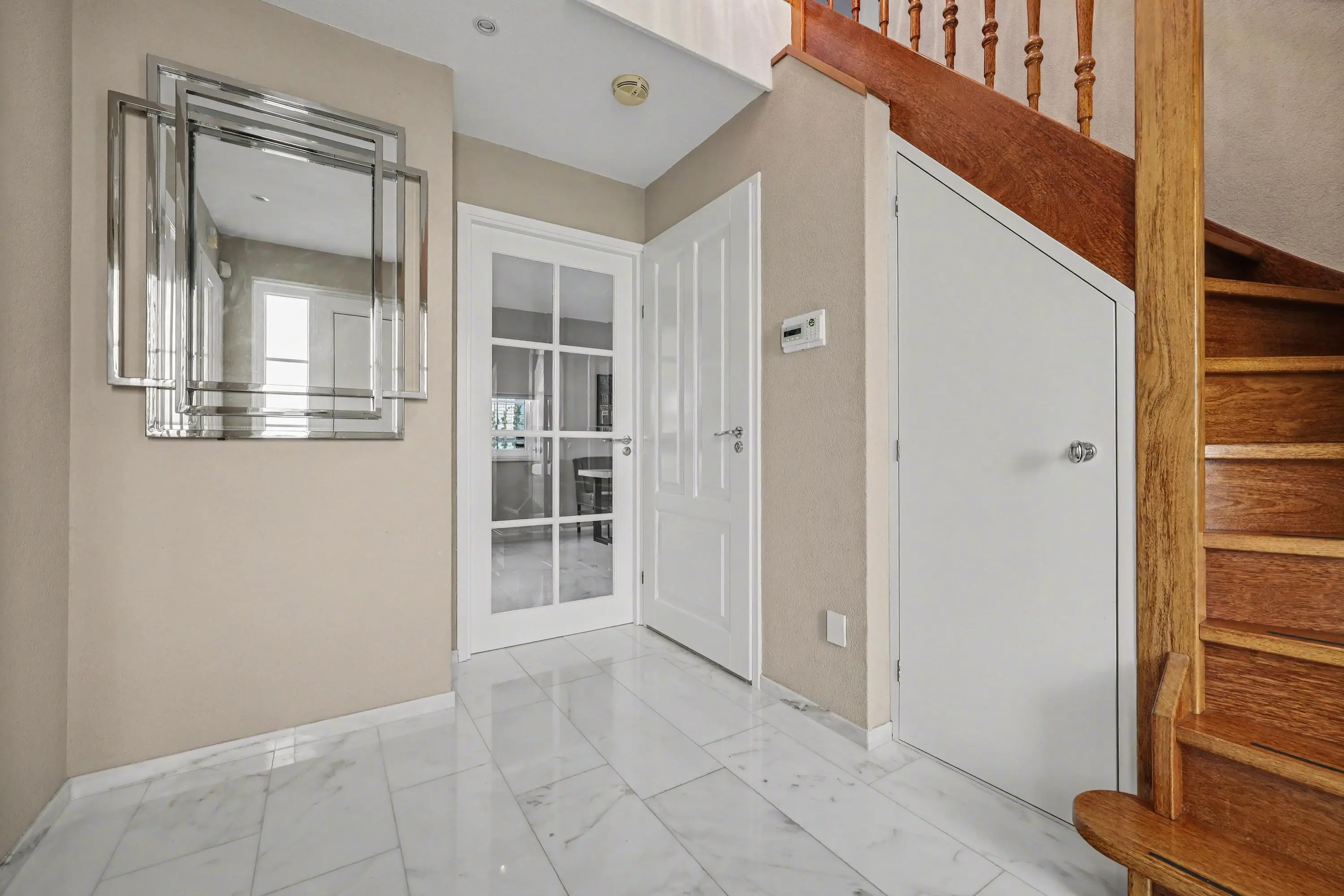 Royale hal/entree met een vloerafwerking van marmer en open trapopgang naar de verdieping/vide. Toegang tot kruipruimte. Moderne toiletruimte (2023) met strak tegelwerk, een wandcloset met fontein en mechanische afzuiging. Trap-/bergkast met de unit t.b.v. de vloerverwarming (5 groepen). Meterkast met 10 groepen en 2 aardlekschakelaars, Aquacell waterontharder en hydrofoor. Toegang naar de garderobe/bijkeuken met ingebouwde maatwerkkastruimte, aansluiting t.b.v. wasmachine en droger op stahoogte en ingebouwde koelkast met vriesvak en nulgradenzone. Mechanische afzuiging. Vloerverwarming over de gehele begane grond.