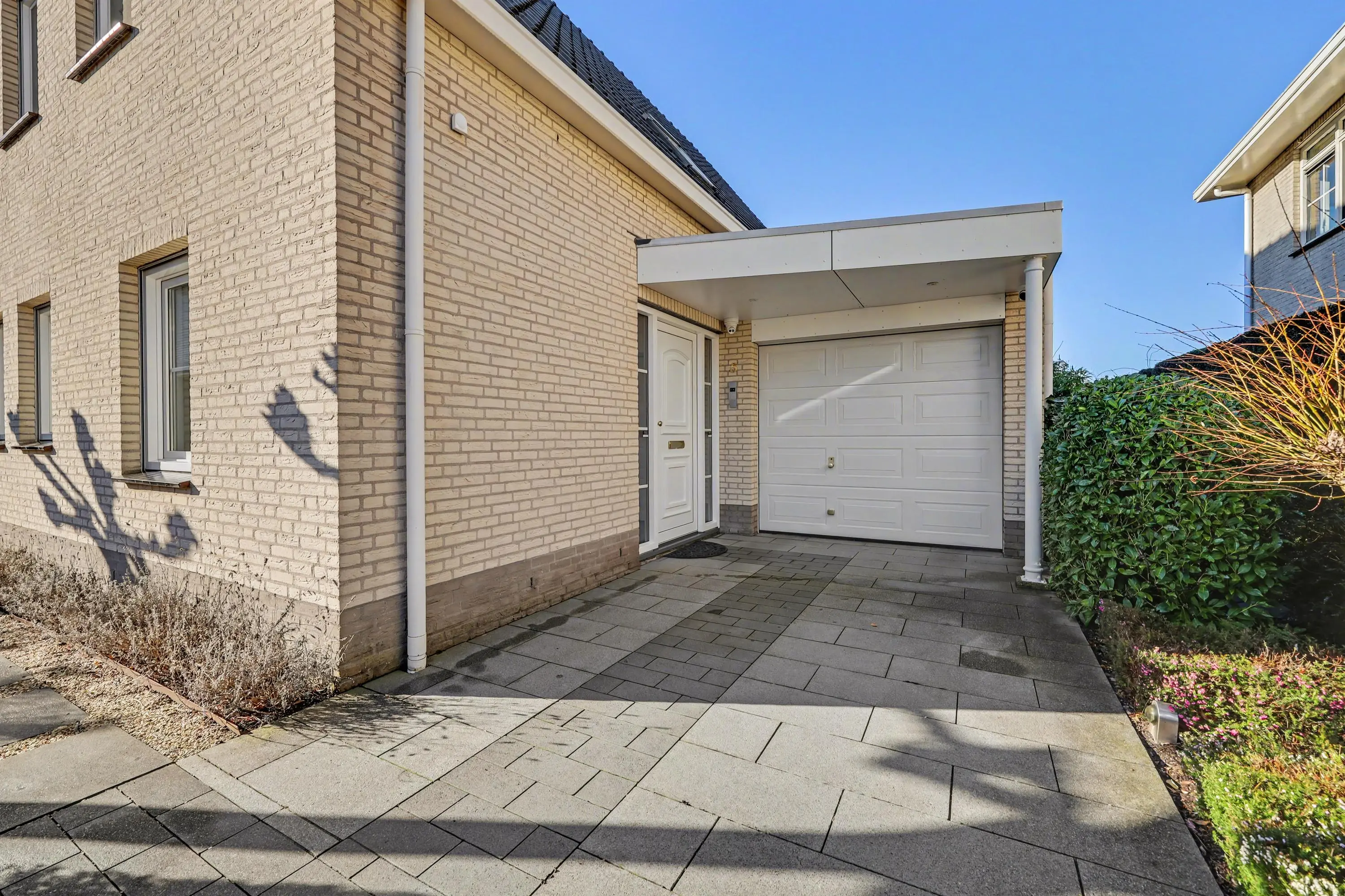 Aangebouwde garage met betonvloer, waterkraan, verwarming, stofzuigunit centraal stofzuigersysteem, elektrisch bedienbare sectionaal Hörmann garagedeur en achterdeur naar de tuin.