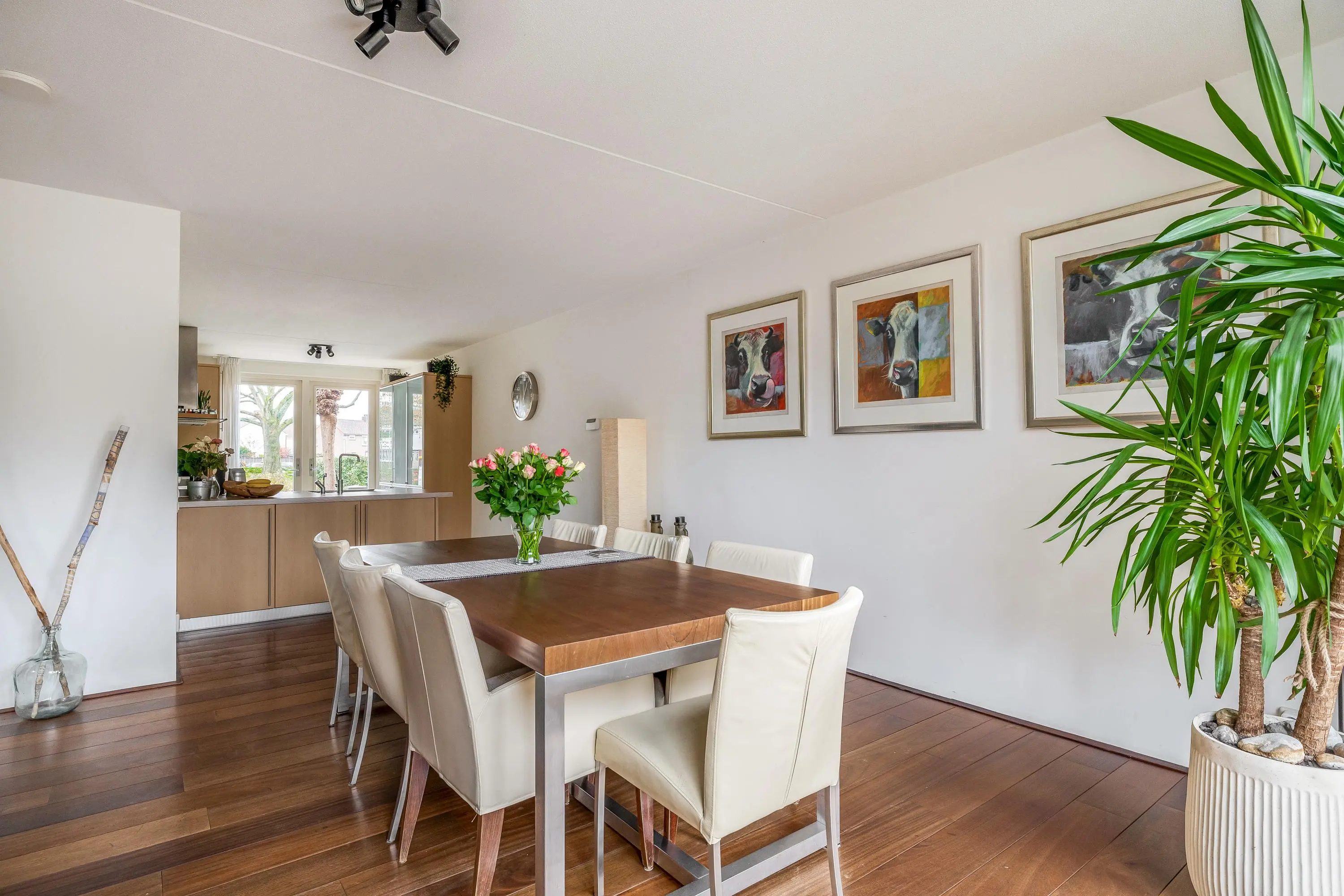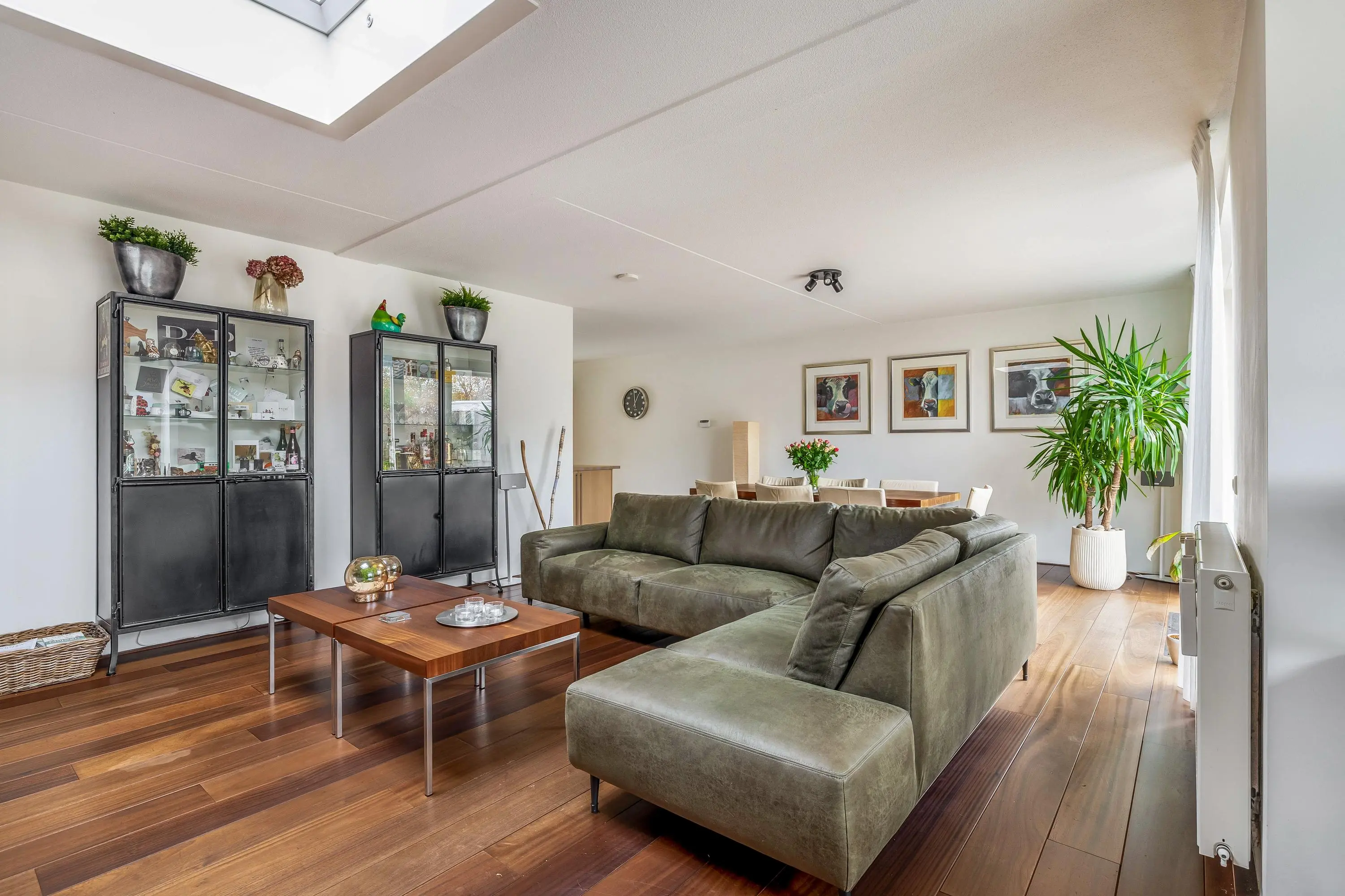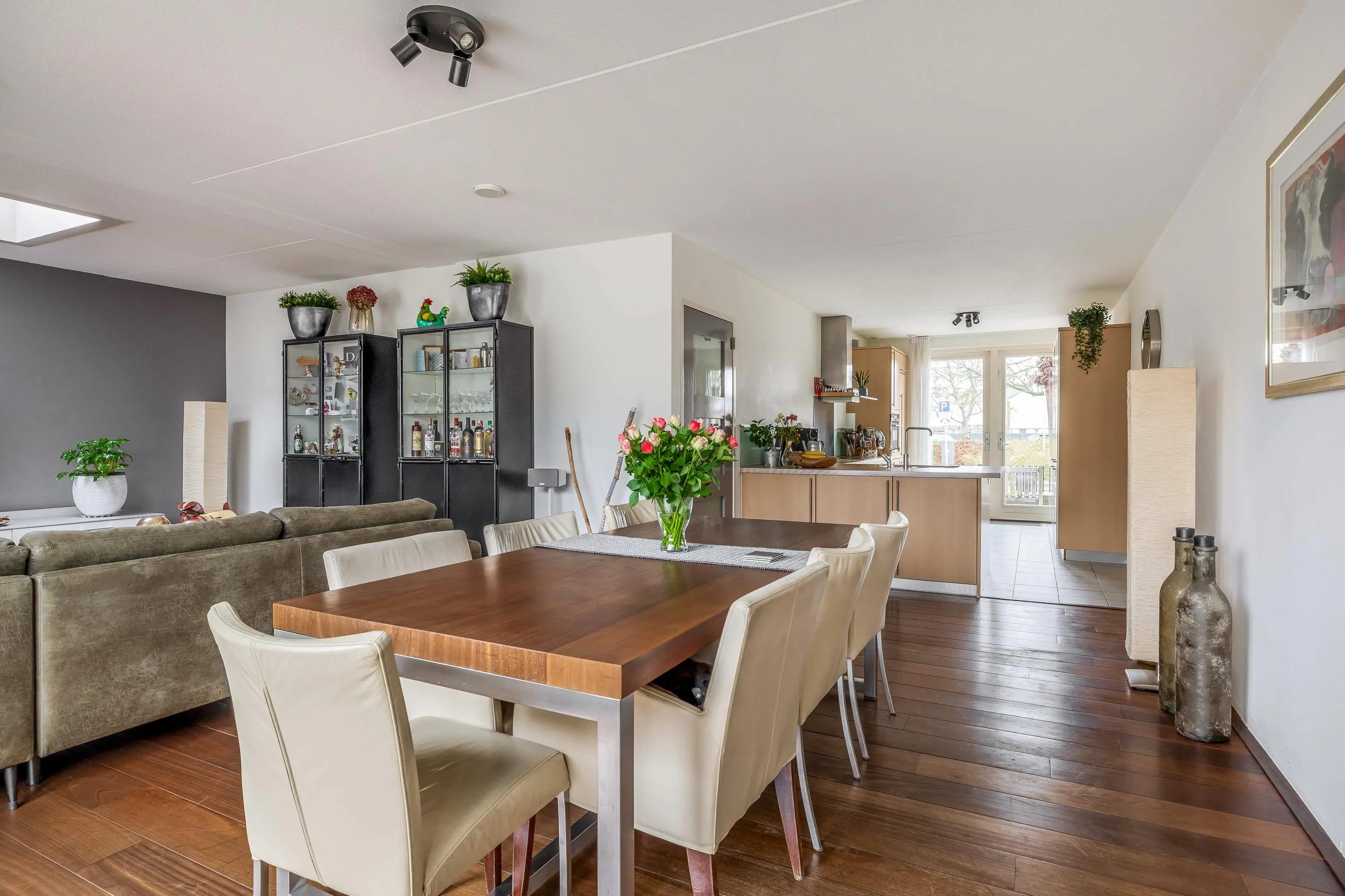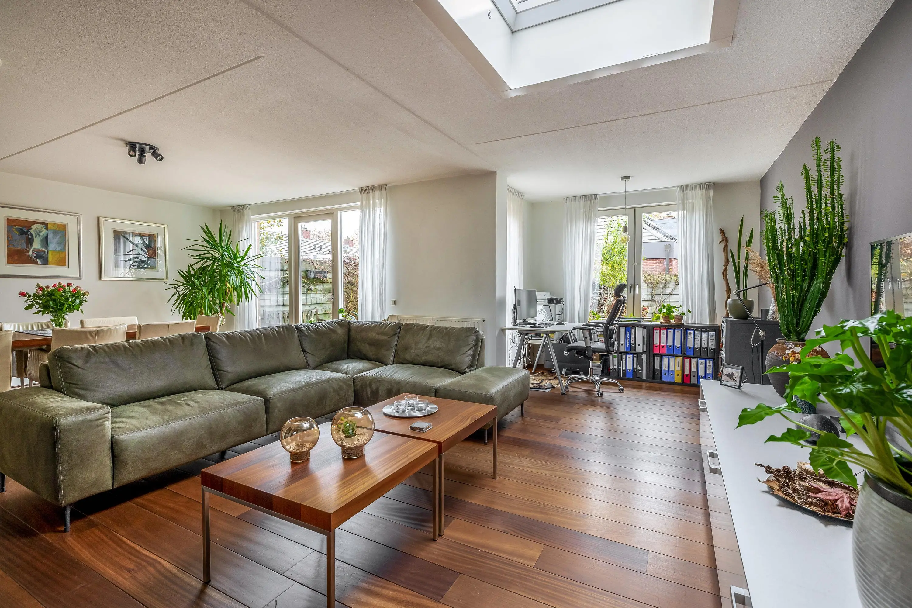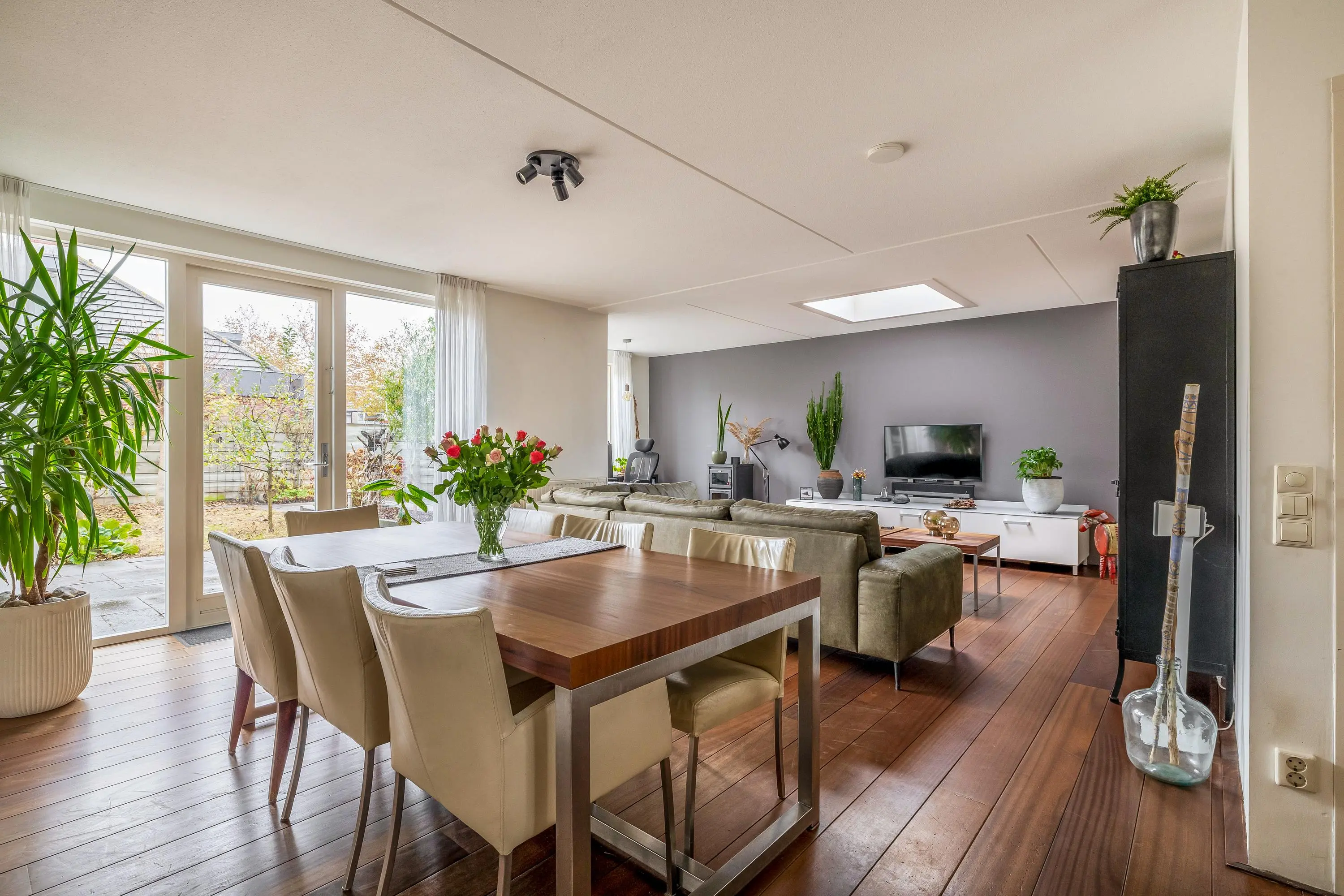 De tuingerichte woonkamer is ruim van opzet en beschikt over een houten vloer, een lichtkoepel en de deur naar de achtertuin. De grote raampartijen zorgen voor een prettige lichtinval en een goede verbinding met buiten.