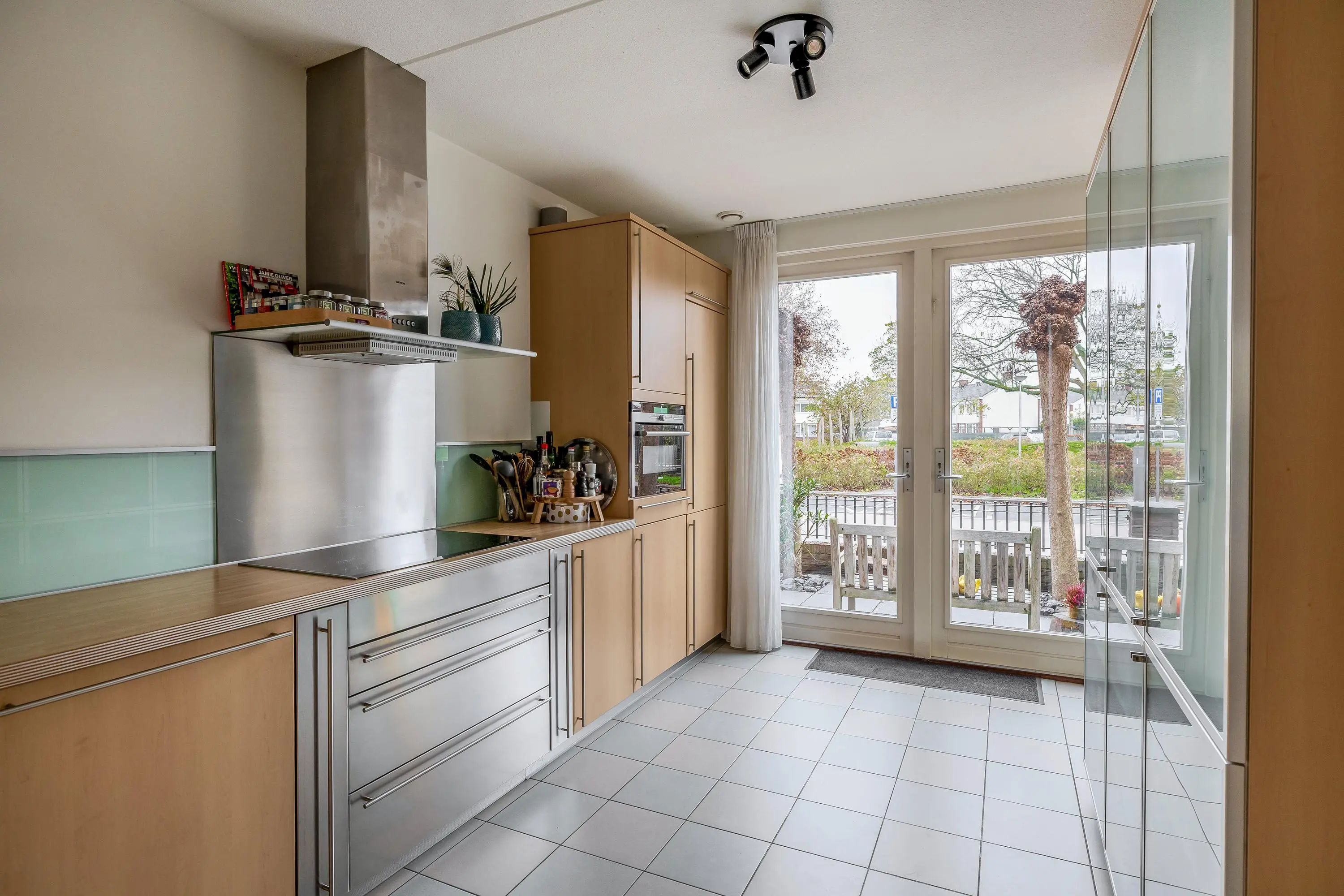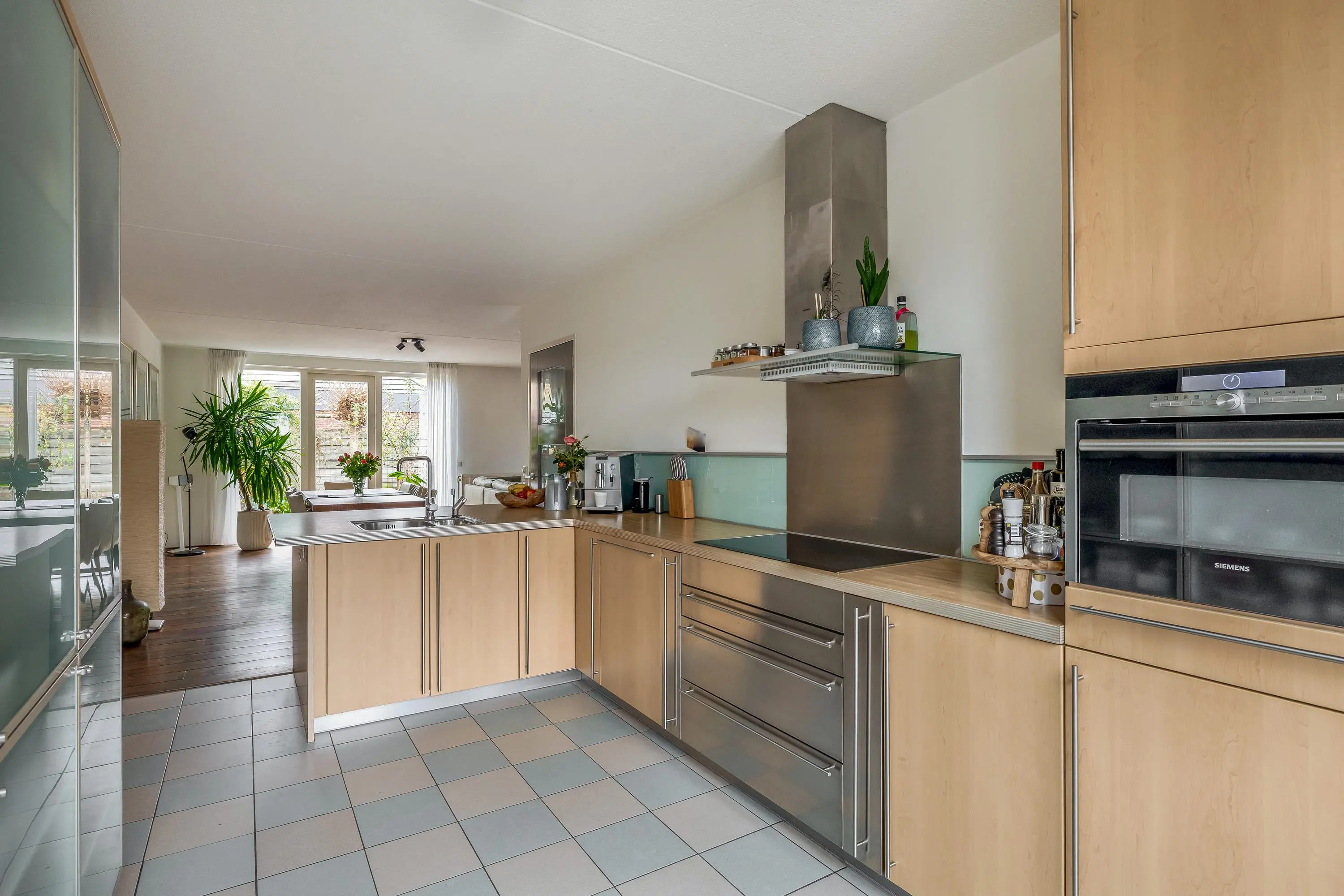 De keuken bevindt zich aan de voorzijde van de woning en is opgesteld in een L-vorm en uitgevoerd met een houten aanrechtblad, elektrische kookplaat met een halogeen zone, combimagnetron, koel-/vriescombinatie, Quooker en meer dan voldoende kastruimte in de separate wandopstelling. De plavuizenvloer is voorzien van vloerverwarming en via openslaande deuren is de voortuin bereikbaar.