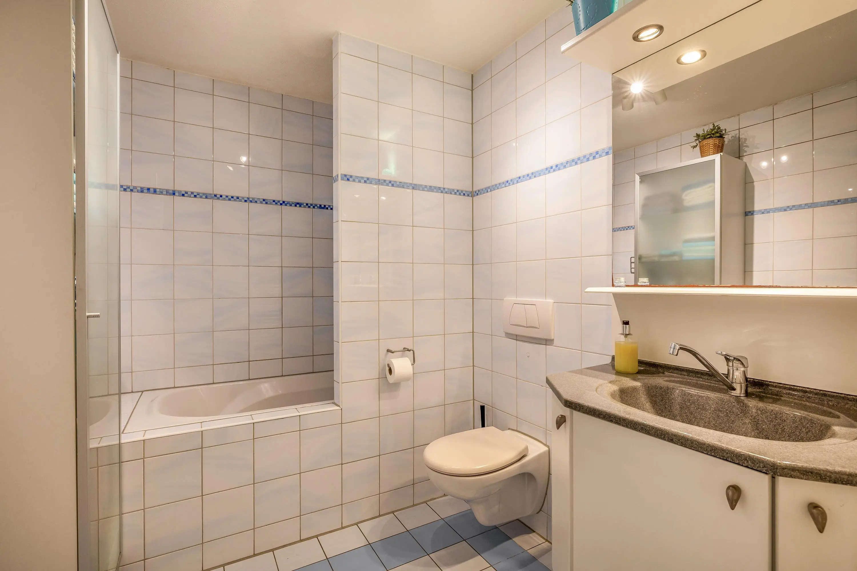 De badkamer is volledig betegeld en uitgevoerd met een wastafelmeubel, hangend toilet, ligbad met douchegarnituur en mechanische ventilatie.