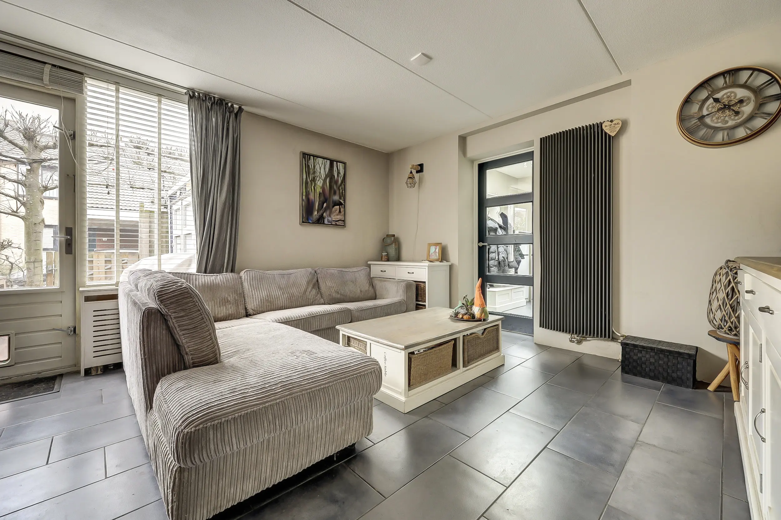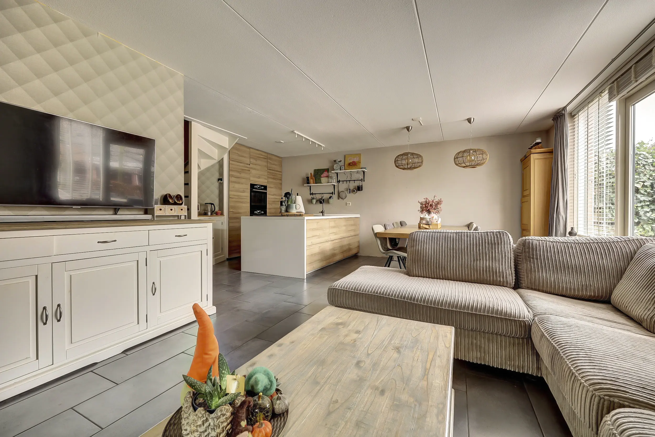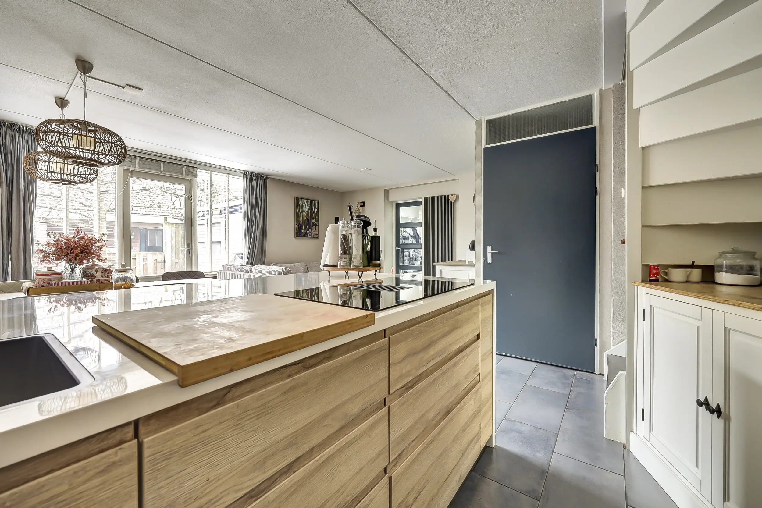 Entree/hal in de nieuw aanbouw met aldaar de slaapkamer met wastafel. Vanuit deze slaapkamer is de inpandige wasruimte te bereiken alsmede de meterkast. Terug gekomen in de gang kan men aan de andere zijde de inpandige berging vinden. Woonkamer welke licht is van opzet en voorzien van een plavuizen vloer welke over de gehele begane grond is gelegd, beschikt over een nieuwe keuken met kookeiland. De keuken is voorzien van inbouwapparatuur zoals inductiekookplaat met afzuiging (4 pits), grote spoelbak, vriezer, koelkast, twee ovens en vaatwasser. Naast de keuken is een leuke koffie corner gecreëerd onder de bergruimte van de trap. In de woonkamer tref je de deur aan naar de zij tuin met aldaar een blokhutberging. In de woonkamer is toegang naar een halletje met het toilet voorzien van een hangend closet en een fontein, alsmede een verlaagd plafond met spotjes.