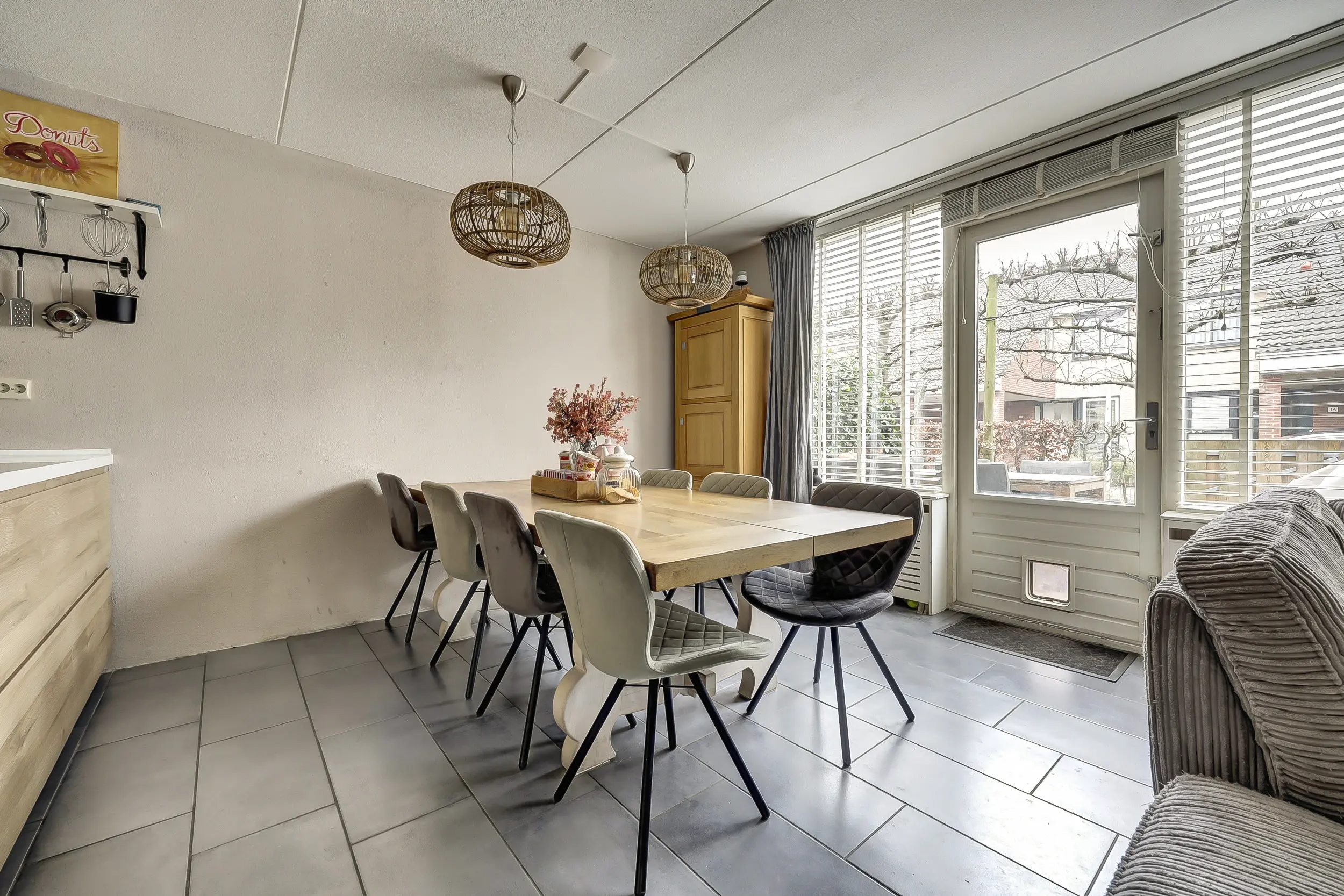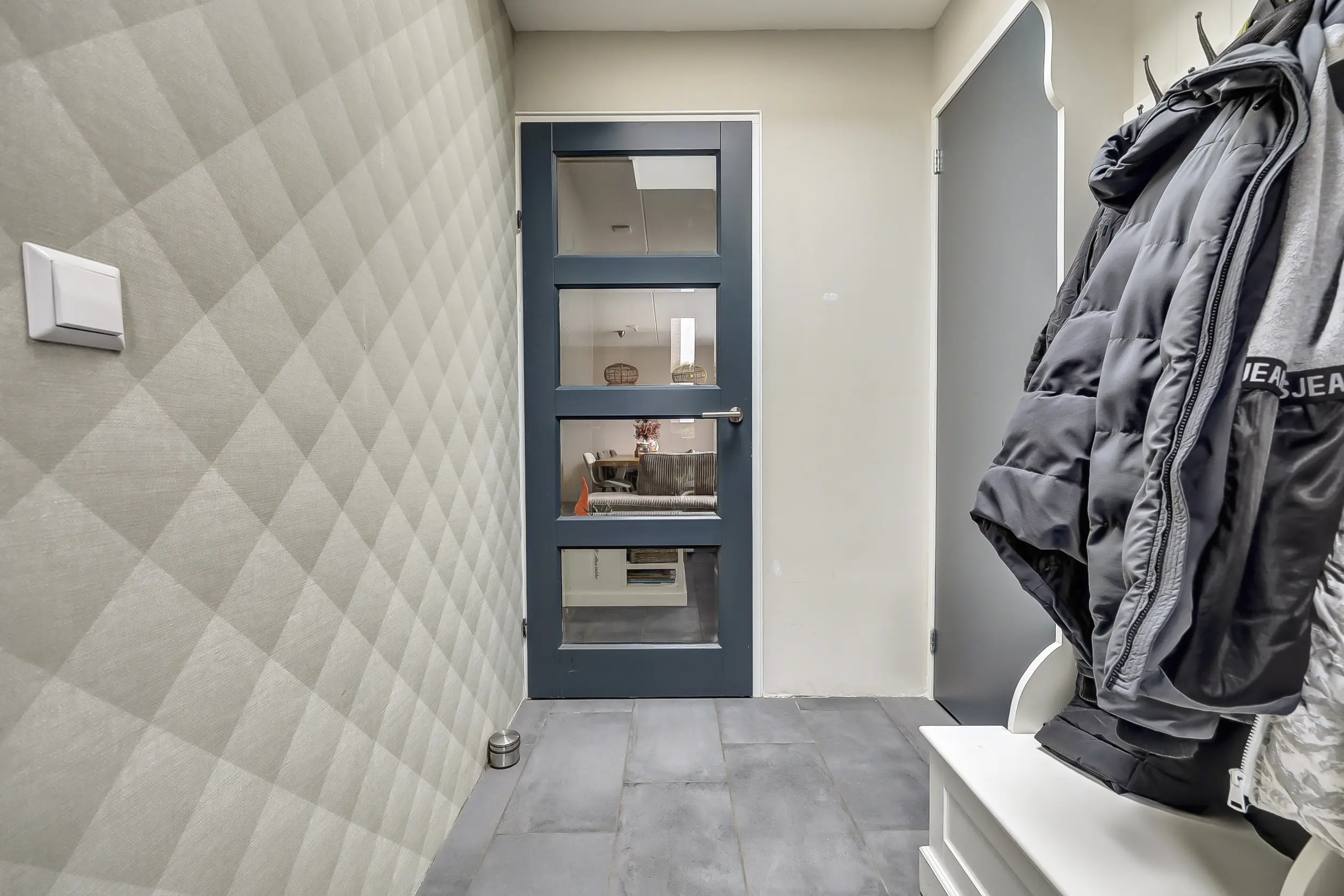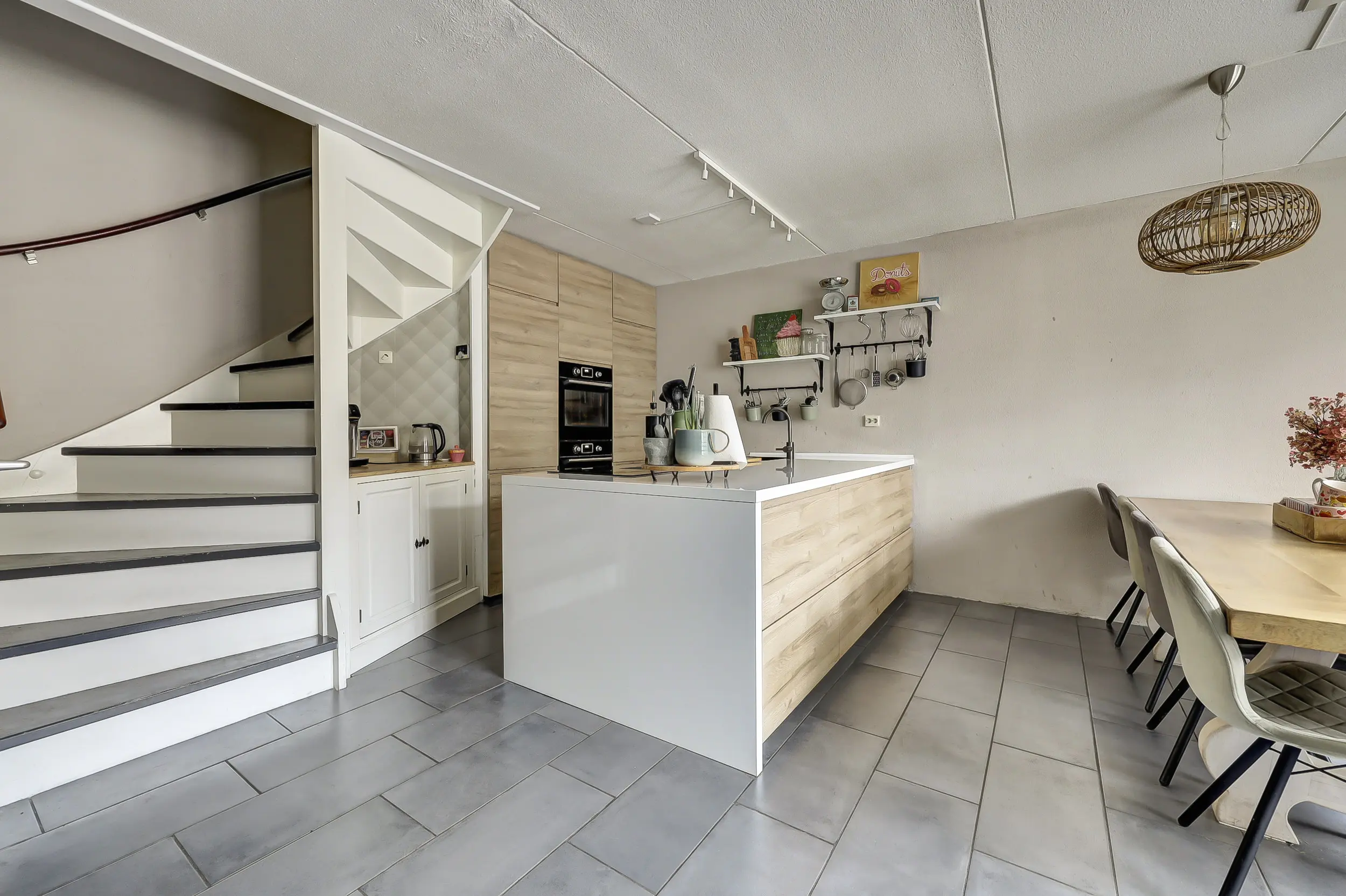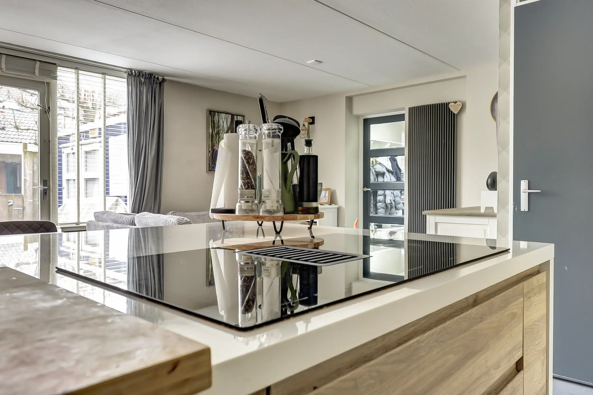 Entree/hal in de nieuw aanbouw met aldaar de slaapkamer met wastafel. Vanuit deze slaapkamer is de inpandige wasruimte te bereiken alsmede de meterkast. Terug gekomen in de gang kan men aan de andere zijde de inpandige berging vinden. Woonkamer welke licht is van opzet en voorzien van een plavuizen vloer welke over de gehele begane grond is gelegd, beschikt over een nieuwe keuken met kookeiland. De keuken is voorzien van inbouwapparatuur zoals inductiekookplaat met afzuiging (4 pits), grote spoelbak, vriezer, koelkast, twee ovens en vaatwasser. Naast de keuken is een leuke koffie corner gecreëerd onder de bergruimte van de trap. In de woonkamer tref je de deur aan naar de zij tuin met aldaar een blokhutberging. In de woonkamer is toegang naar een halletje met het toilet voorzien van een hangend closet en een fontein, alsmede een verlaagd plafond met spotjes.