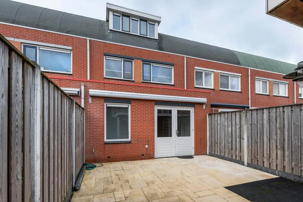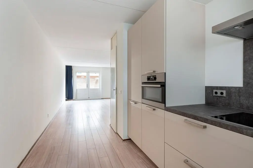 Zeer royale (vergrote) woonkamer met een laminaatvloer, convectorput en dubbele deuren naar de nette zonnige achtertuin op het zuid-oosten. Deze is voorzien van een zonnescherm, sierbestrating, buitenkraan, berging en een achterom. De open keuken in L-opstelling beschikt over diverse inbouwapparatuur.