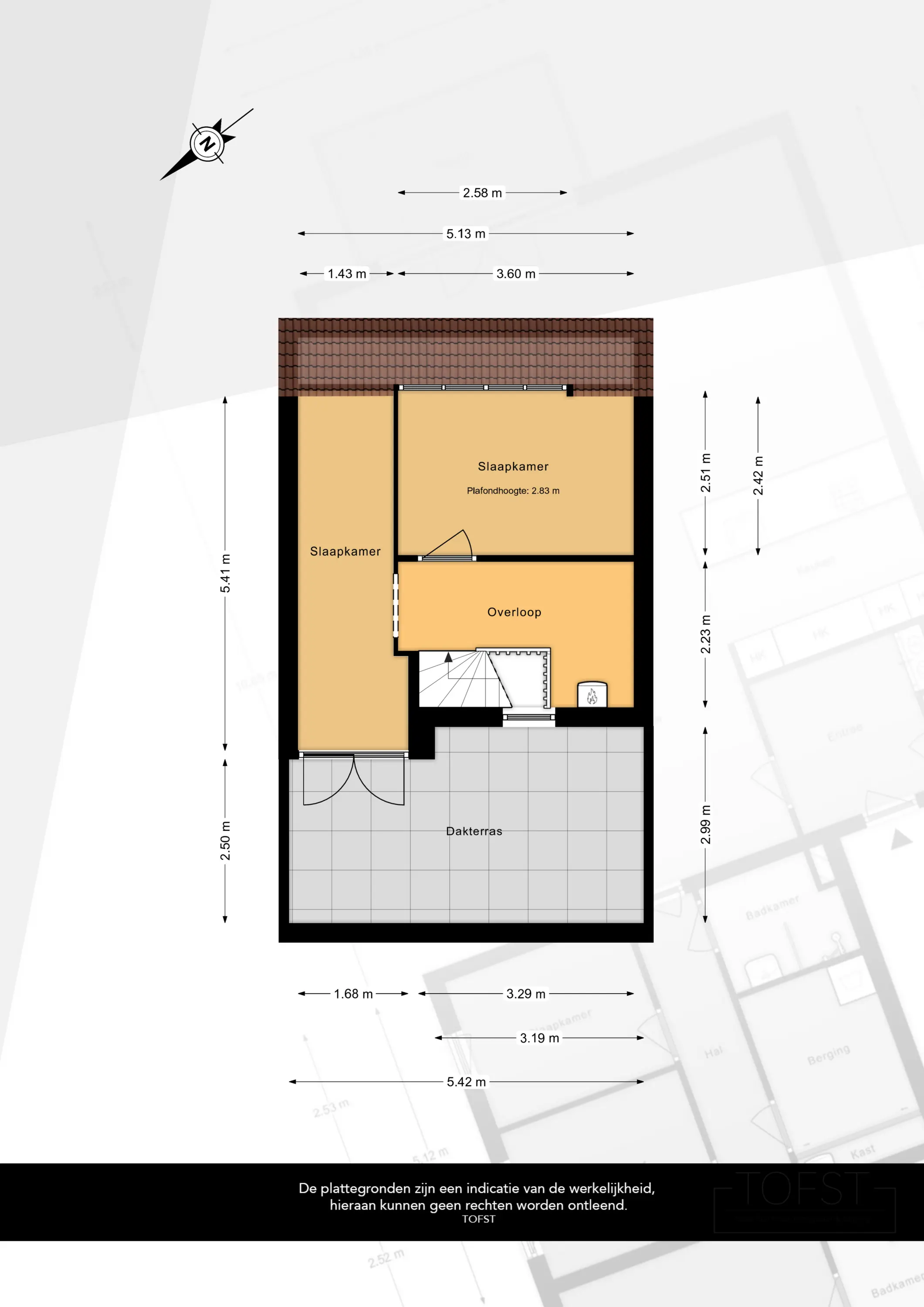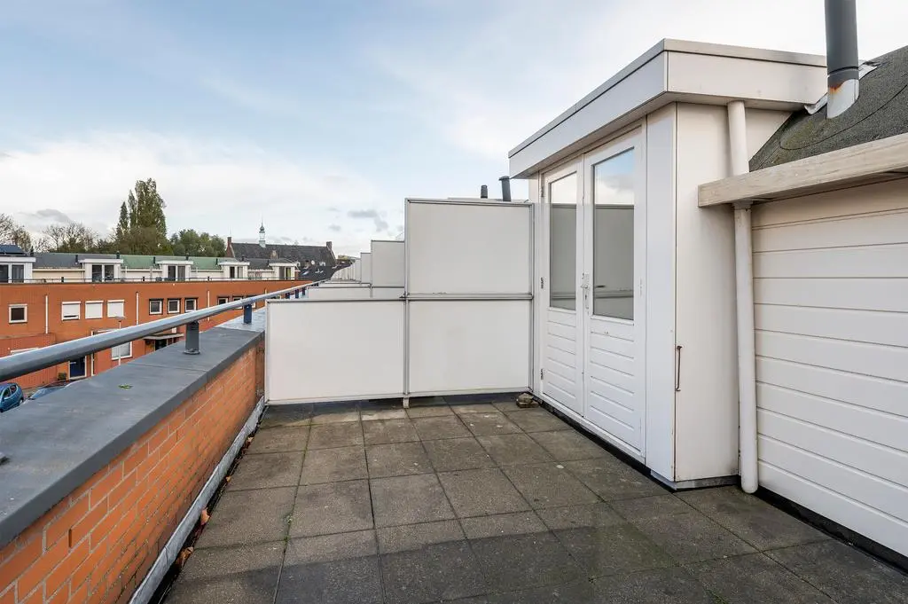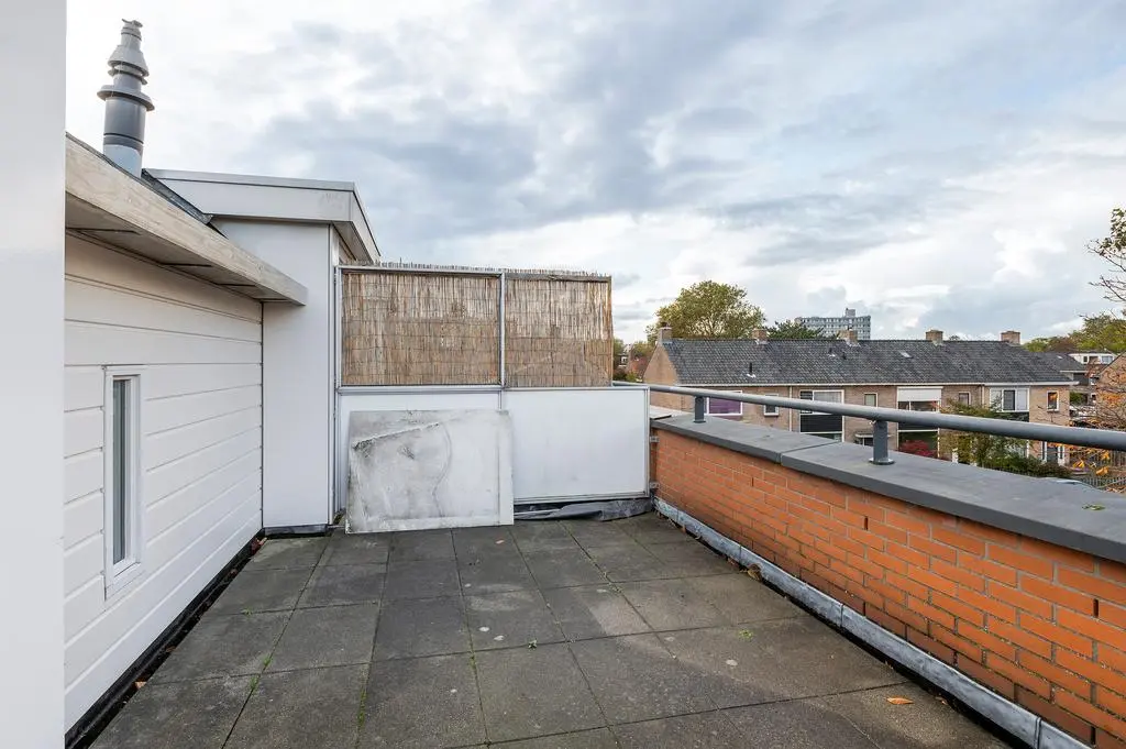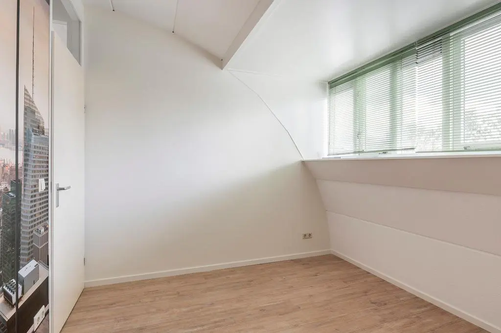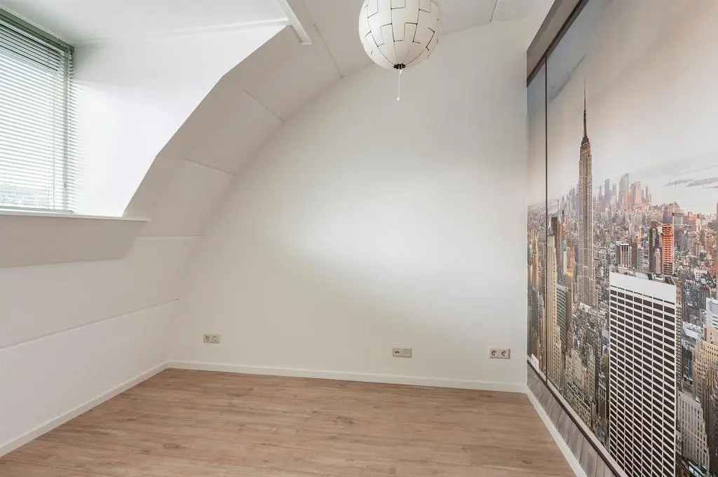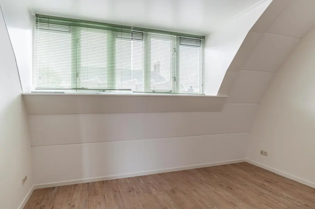 Overloop met opstelplaats voor de CV combiketel en wasmachine/droger aansluiting. Derde slaapkamer met speelse ronde dakvorm. Berg/studeerkamer met openslaande deuren naar het zonnige dakterras.