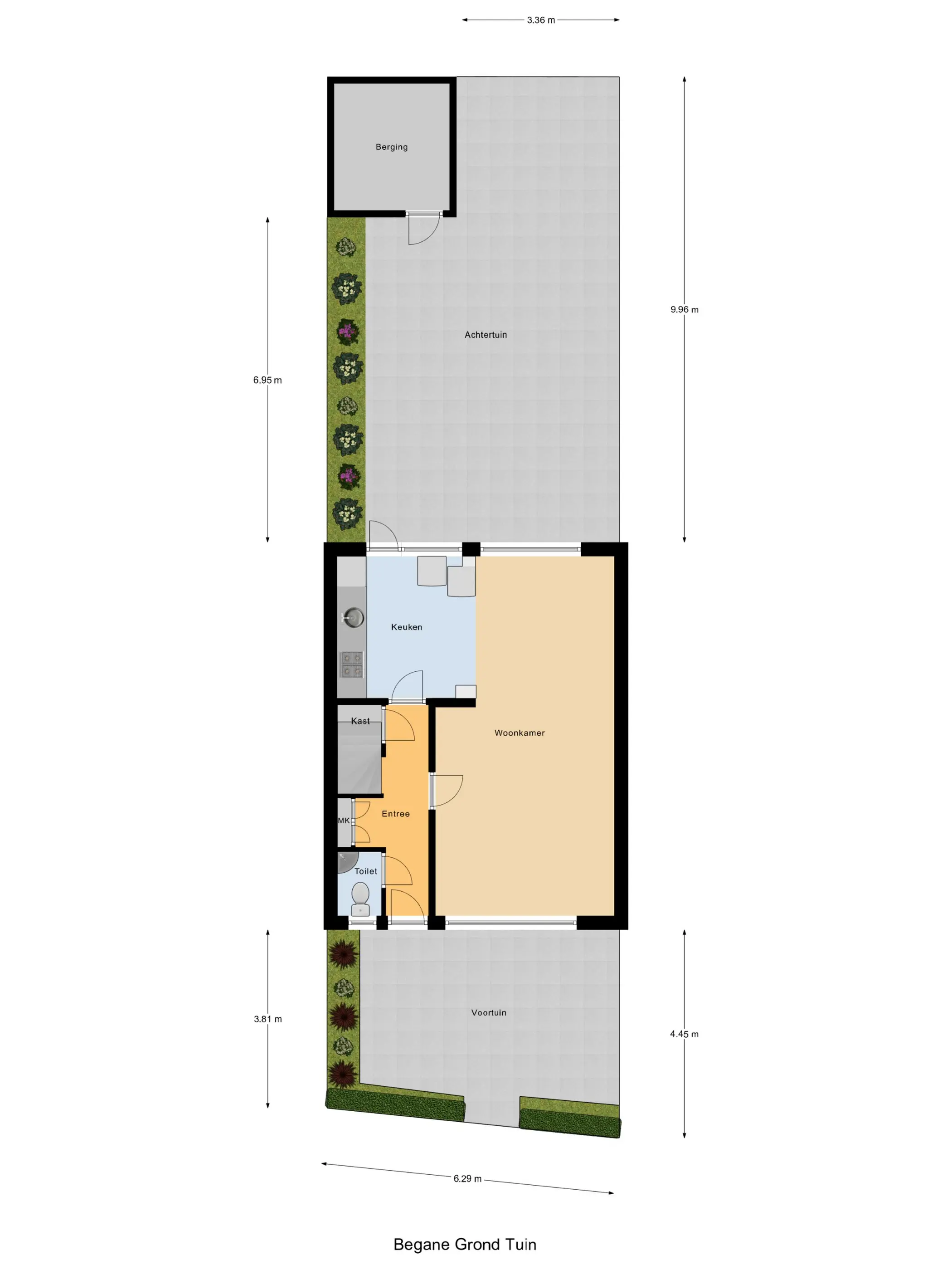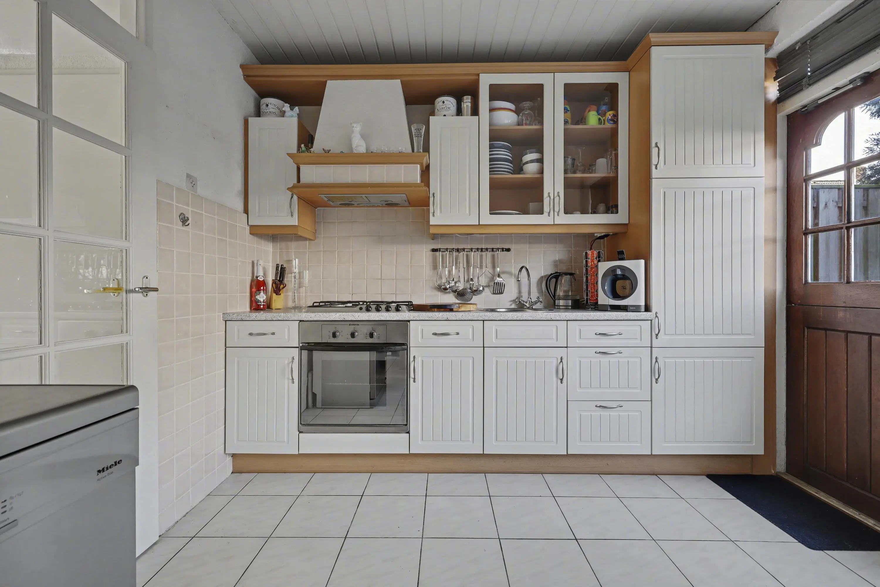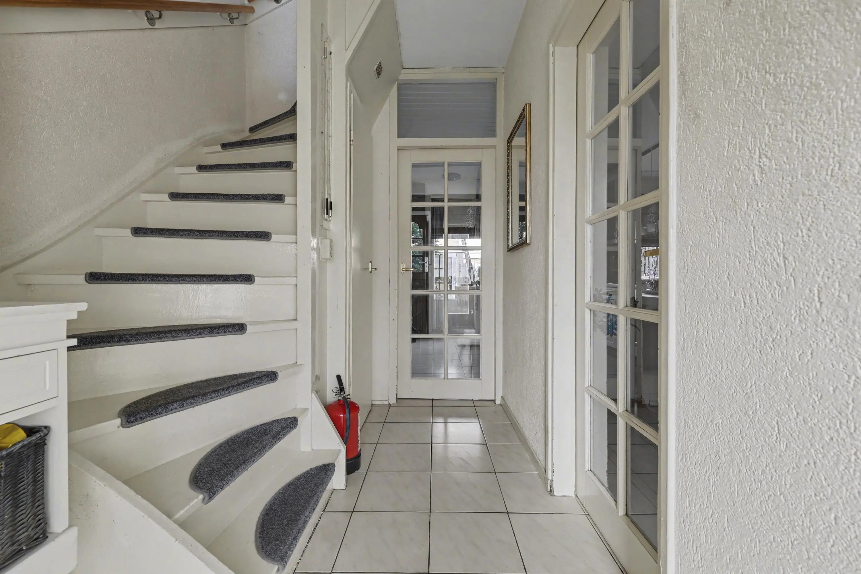 Hal met de toiletruimte, meterkast, trapopgang en een praktische trapkast. Toegang naar zowel de keuken als de woonkamer. De doorzonwoonkamer is een fijne leefruimte met grote raampartijen die zorgen voor veel natuurlijk daglicht. De vloer is afgewerkt met plavuizen voorzien van vloerverwarming (gehele begane grond). De open keuken beschikt over een rechte wandopstelling met een 4-pits gaskookplaat met afzuiging, oven en koelkast. Vanuit de keuken toegang naar de achtertuin.