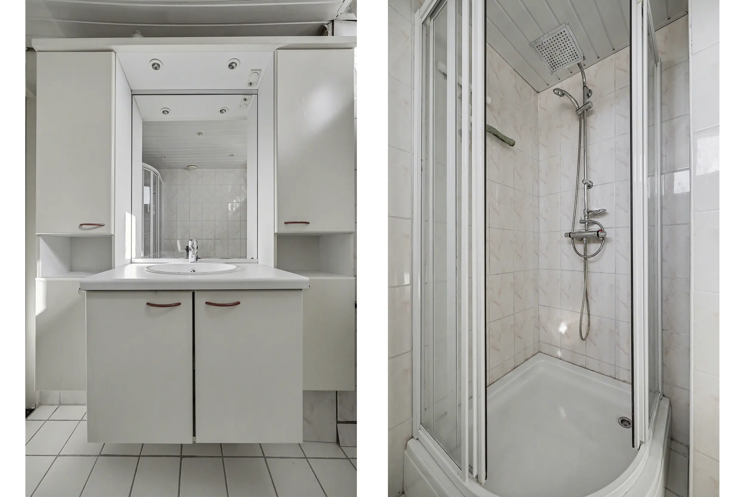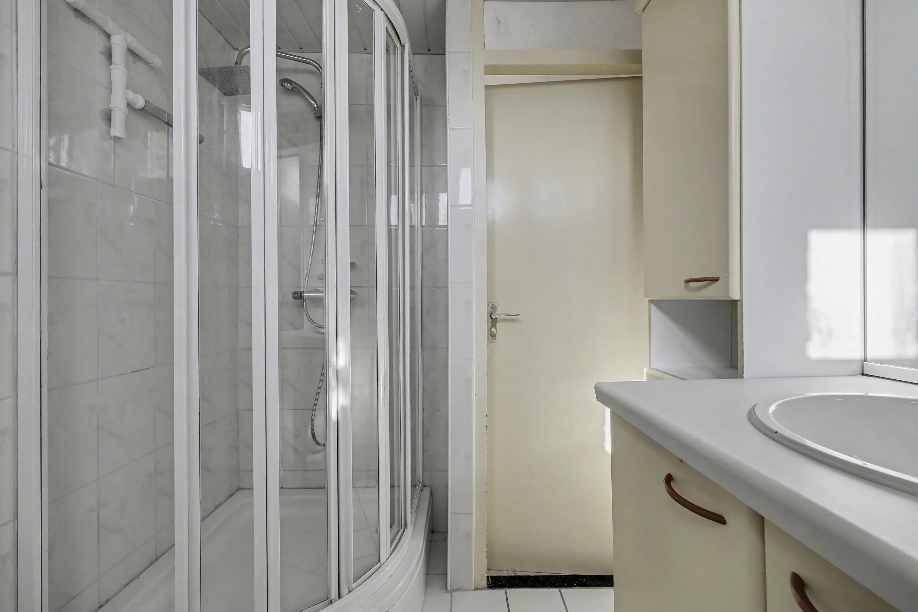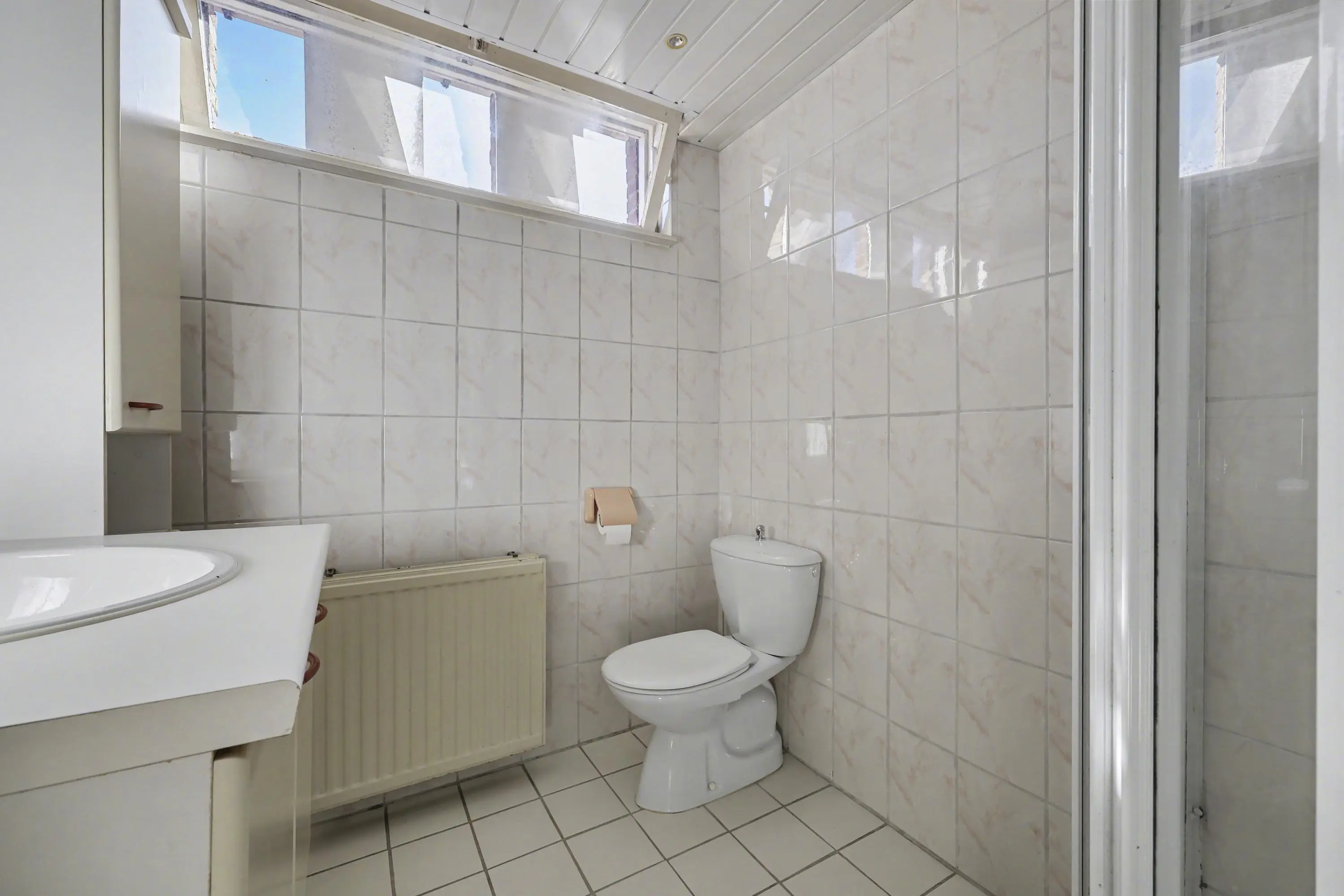 Overloopruimte met toegang tot de drie ruime slaapkamers en de badkamer. Volledig betegelde badkamer met wastafel, douchecabine en toilet.