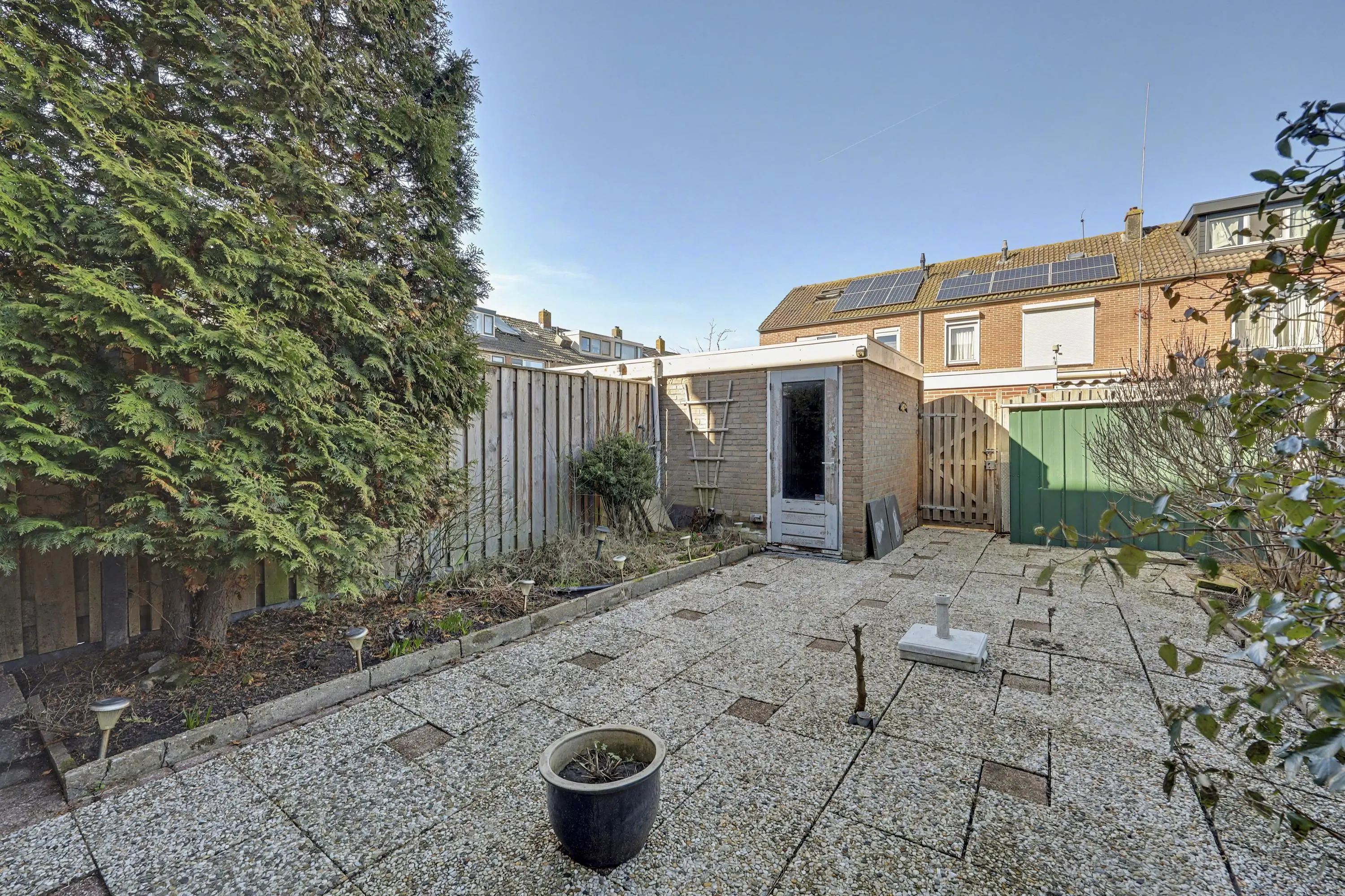 Voor- en achtertuin. Achtertuin met achterom, bestraat met stenen berging en gelegen op het noordwesten.