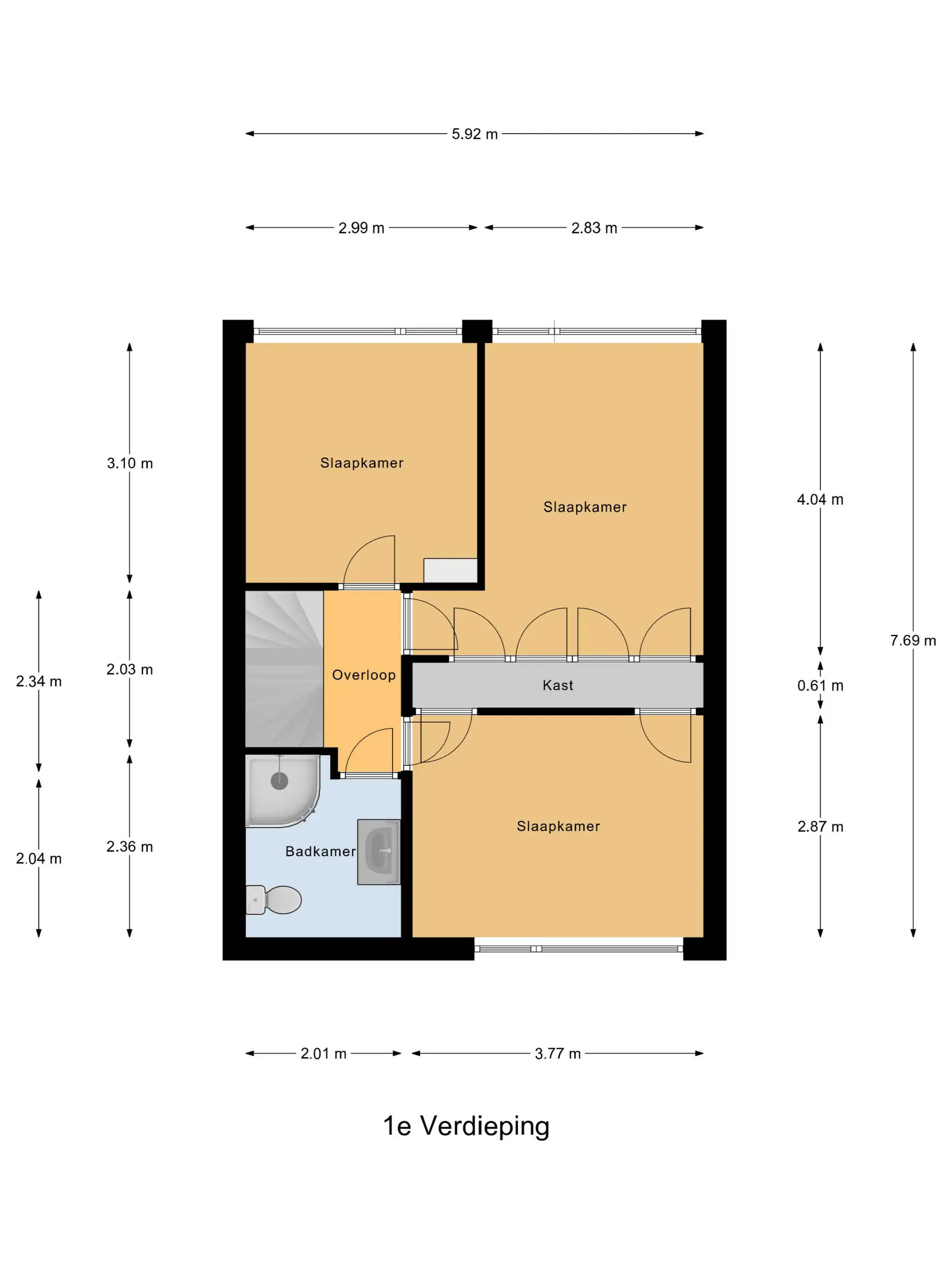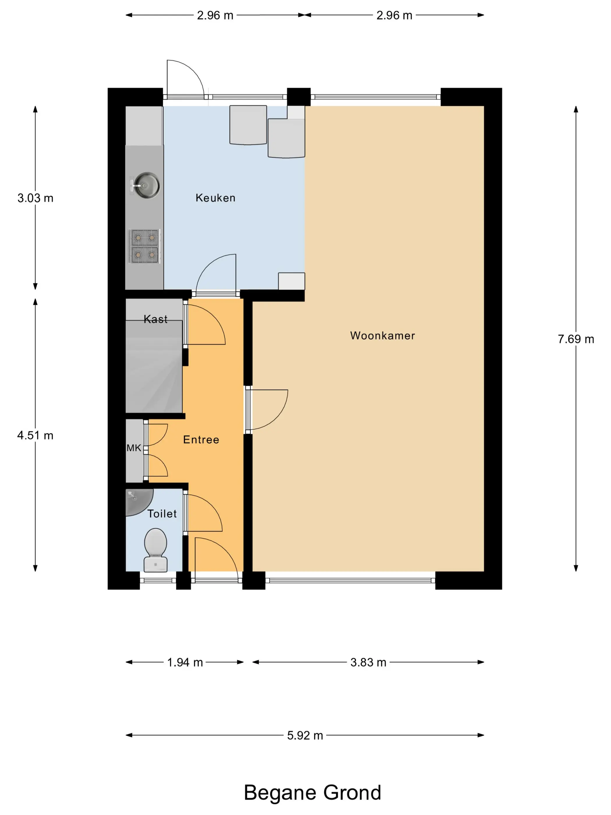 Woonkamer: 7,69 x 3,83/2,96 m.