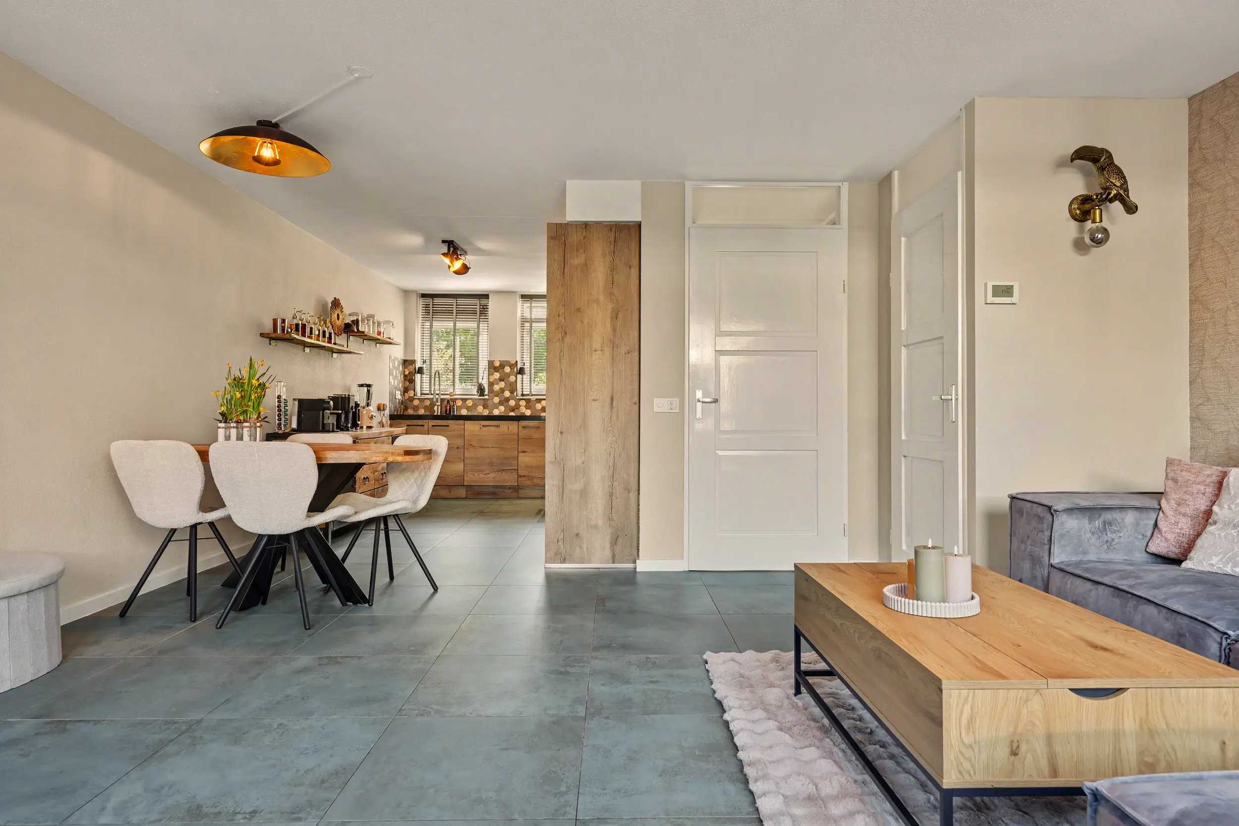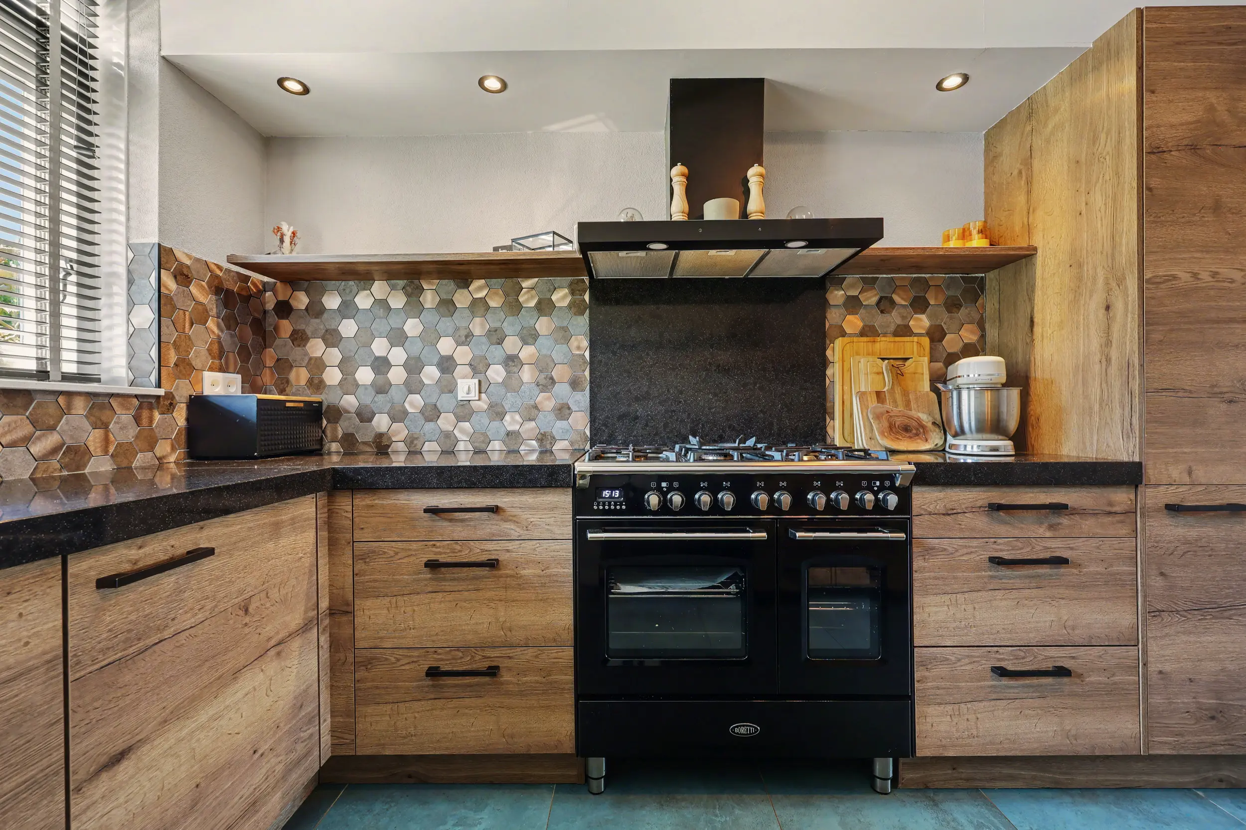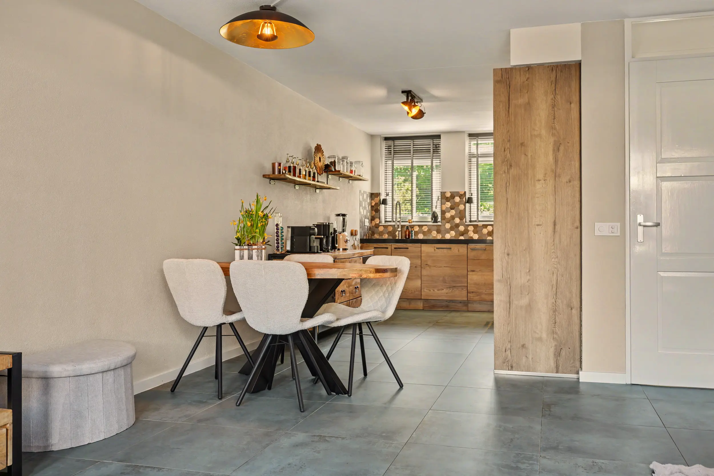 Entree/hal met aldaar de meterkast en het toilet. De gehele begane grond is voorzien van een plavuizen vloer met vloerverwarming. De zonnige woonkamer heeft een open keuken uitgevoerd in een L-opstelling. De keuken is voorzien van een mooi Boretti fornuis met 5 pitten, afzuigkap, vaatwasser, combi-oven, koelkast en vriezer. Verder heeft de keuken een close in boiler. Vanuit de woonkamer toegang tot de diepe achtertuin met achterom.