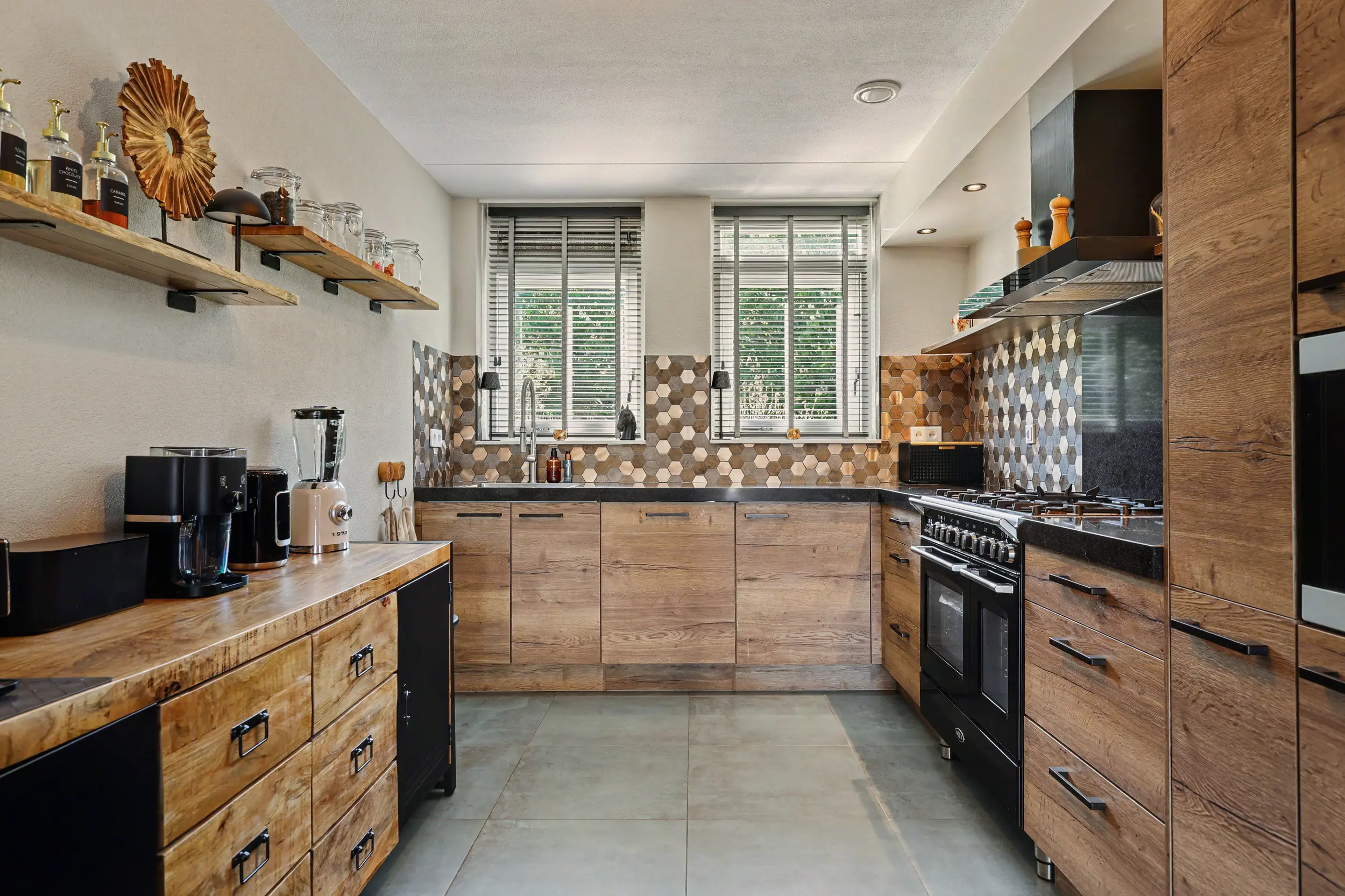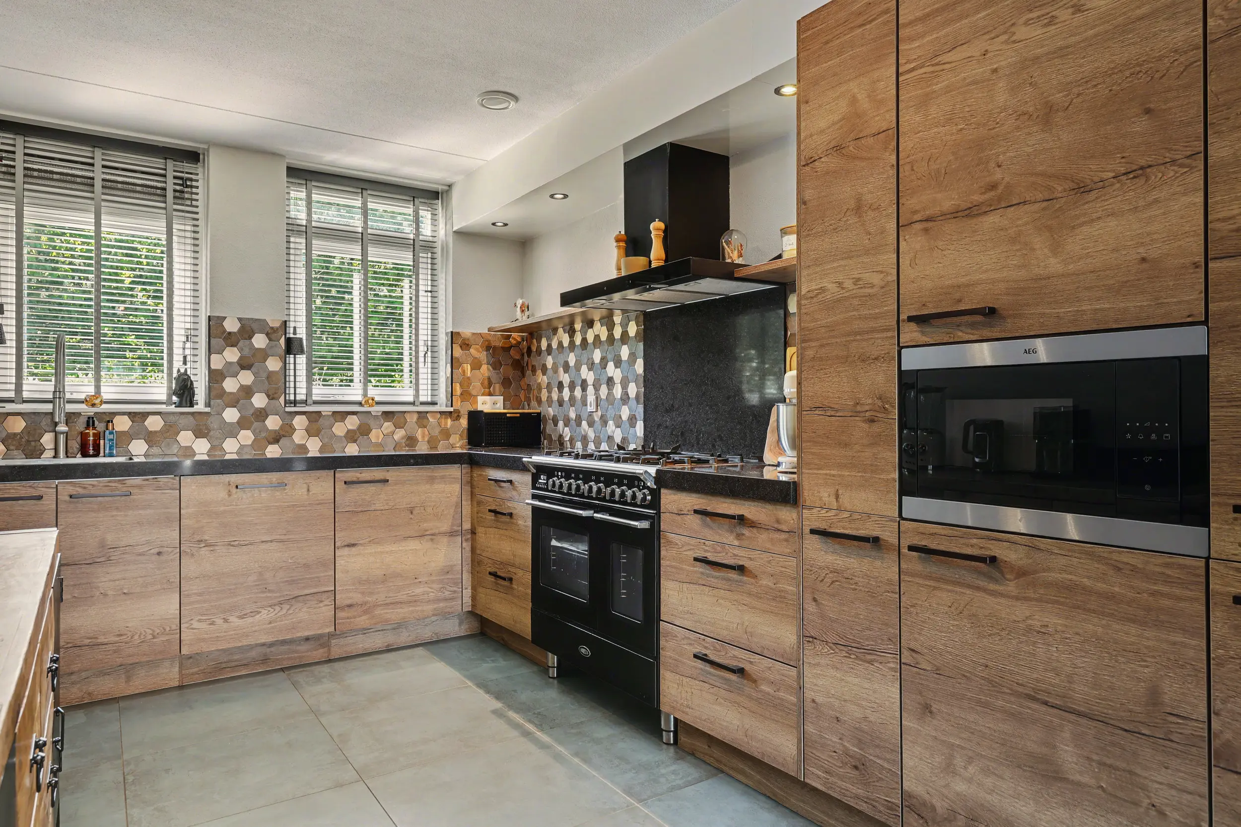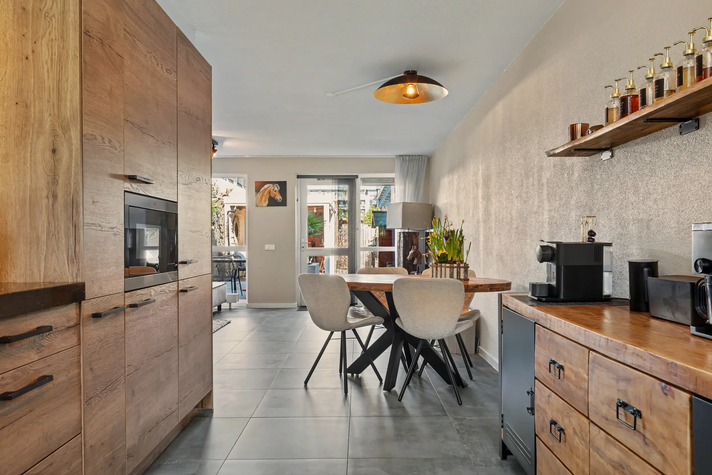 Entree/hal met aldaar de meterkast en het toilet. De gehele begane grond is voorzien van een plavuizen vloer met vloerverwarming. De zonnige woonkamer heeft een open keuken uitgevoerd in een L-opstelling. De keuken is voorzien van een mooi Boretti fornuis met 5 pitten, afzuigkap, vaatwasser, combi-oven, koelkast en vriezer. Verder heeft de keuken een close in boiler. Vanuit de woonkamer toegang tot de diepe achtertuin met achterom.