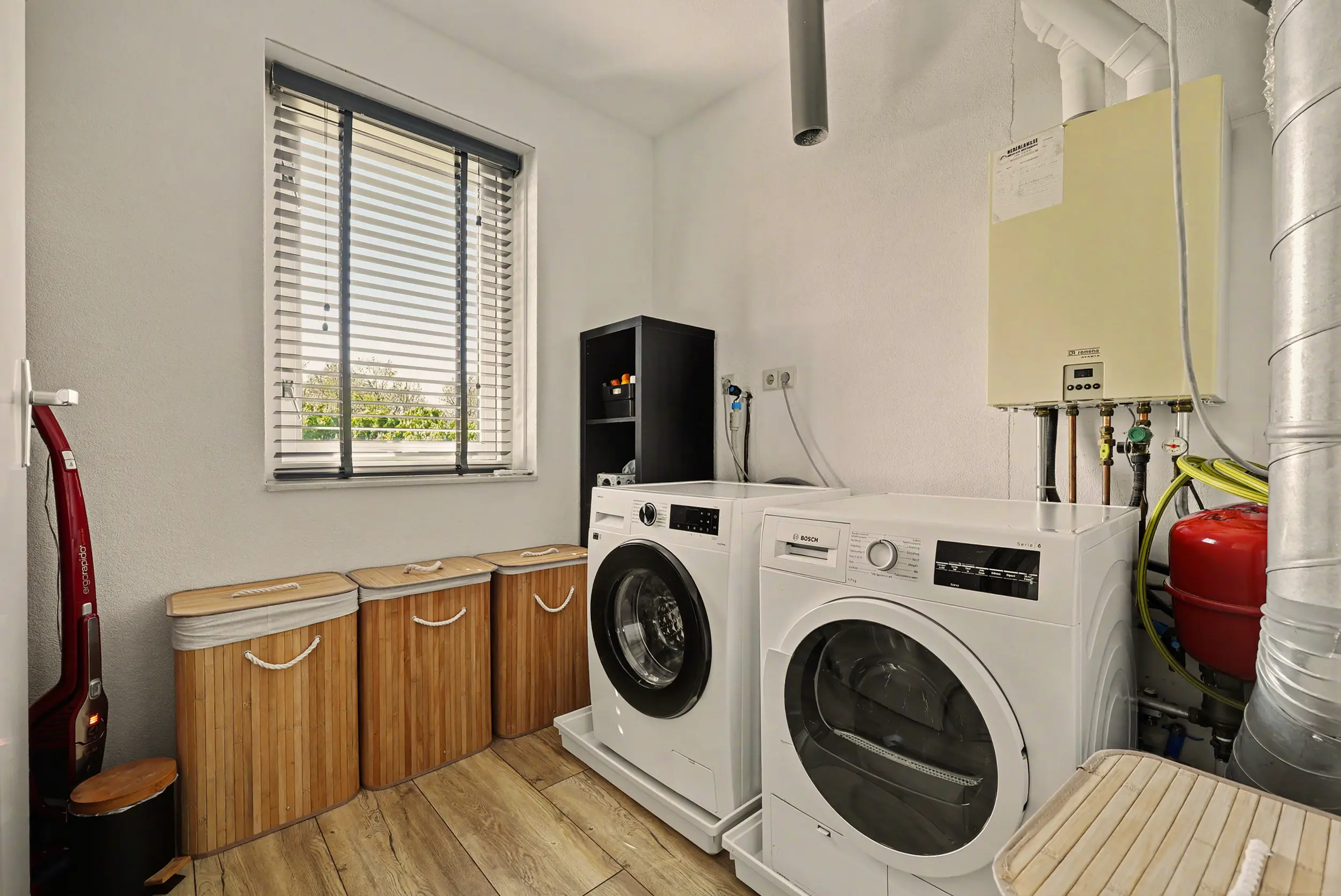 Overloop met toegang tot een inpandige berging/kamer welke ook prima kan dienen als kantoor bijvoorbeeld. De wasruimte met aldaar de opstelling van de wasmachine, droger, cv ketel (Remeha Avanta 2011) en de mechanische ventilatie unit. Verder heeft deze verdieping twee heerlijke slaapkamers waarvan één slaapkamer elektrisch word verwarmd.
