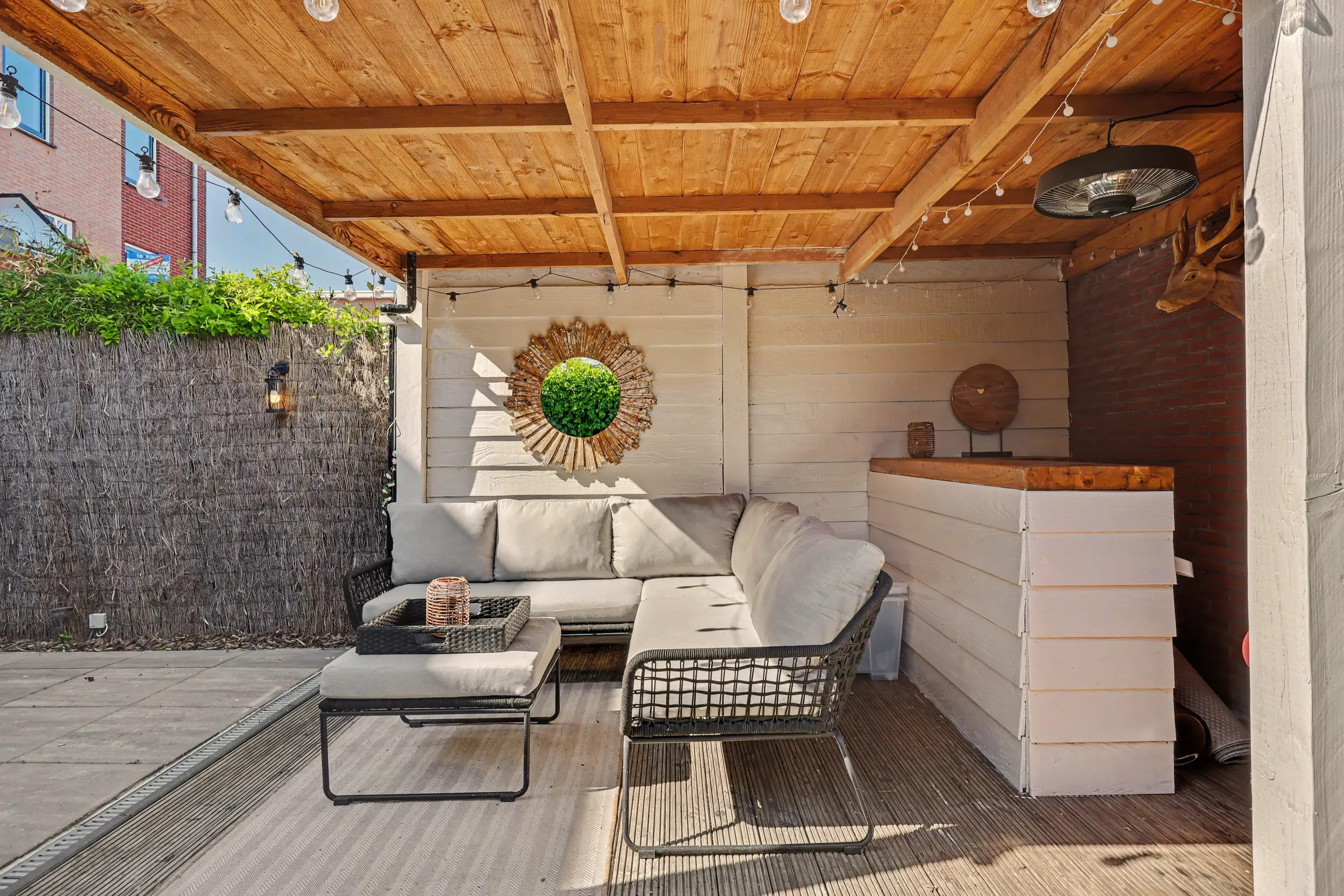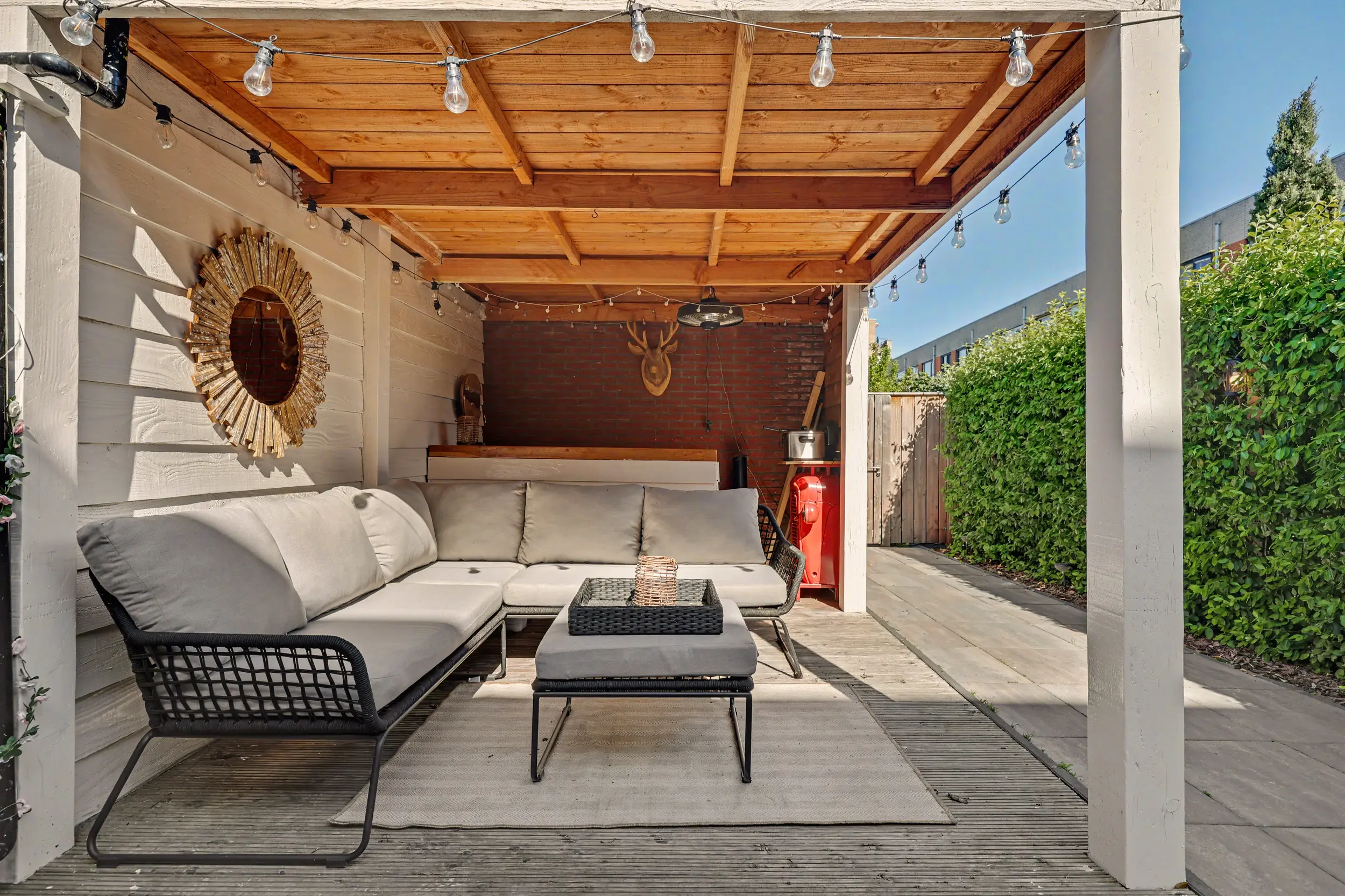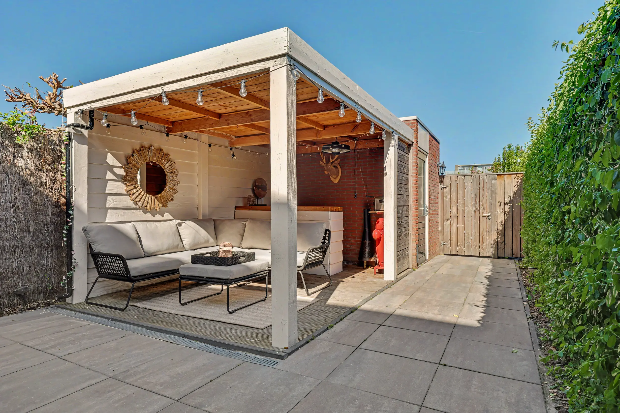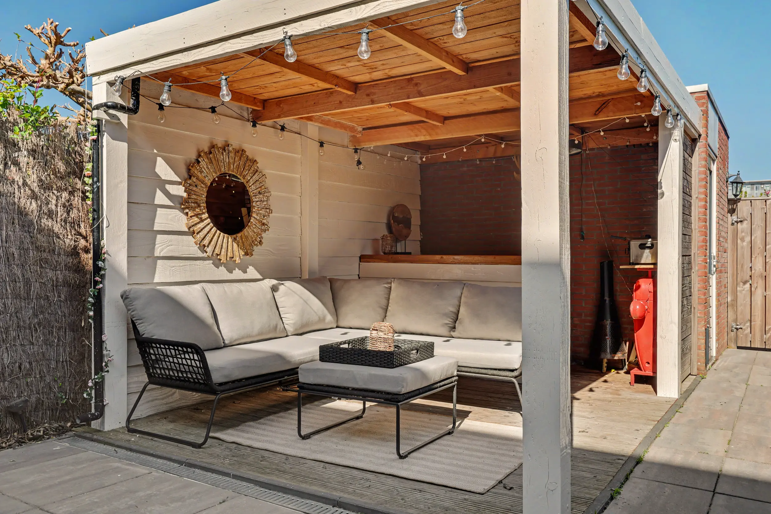 Genieten kan volop in deze achtertuin, deze is bestraat, maar ook voorzien van groen/beplanting. Verder heeft het een heerlijke overkapping met bar (3,87 x 2,78m) en een stenen berging (3,17 x 2,36m) met elektra en verlichting. De tuin is tevens te bereiken middels een achterom.
