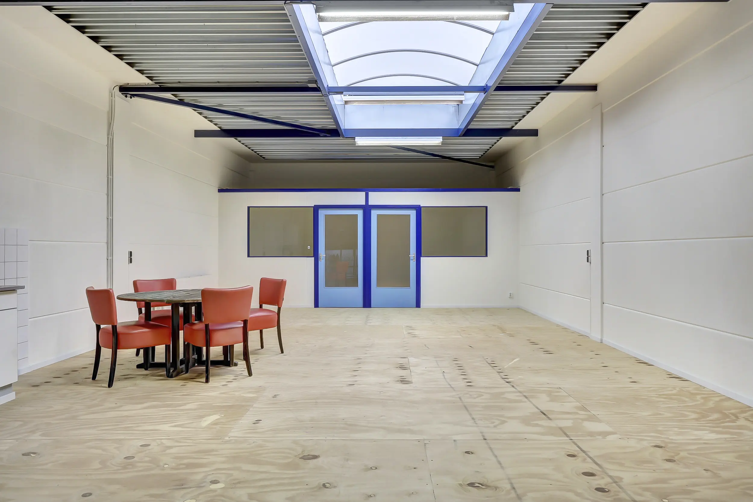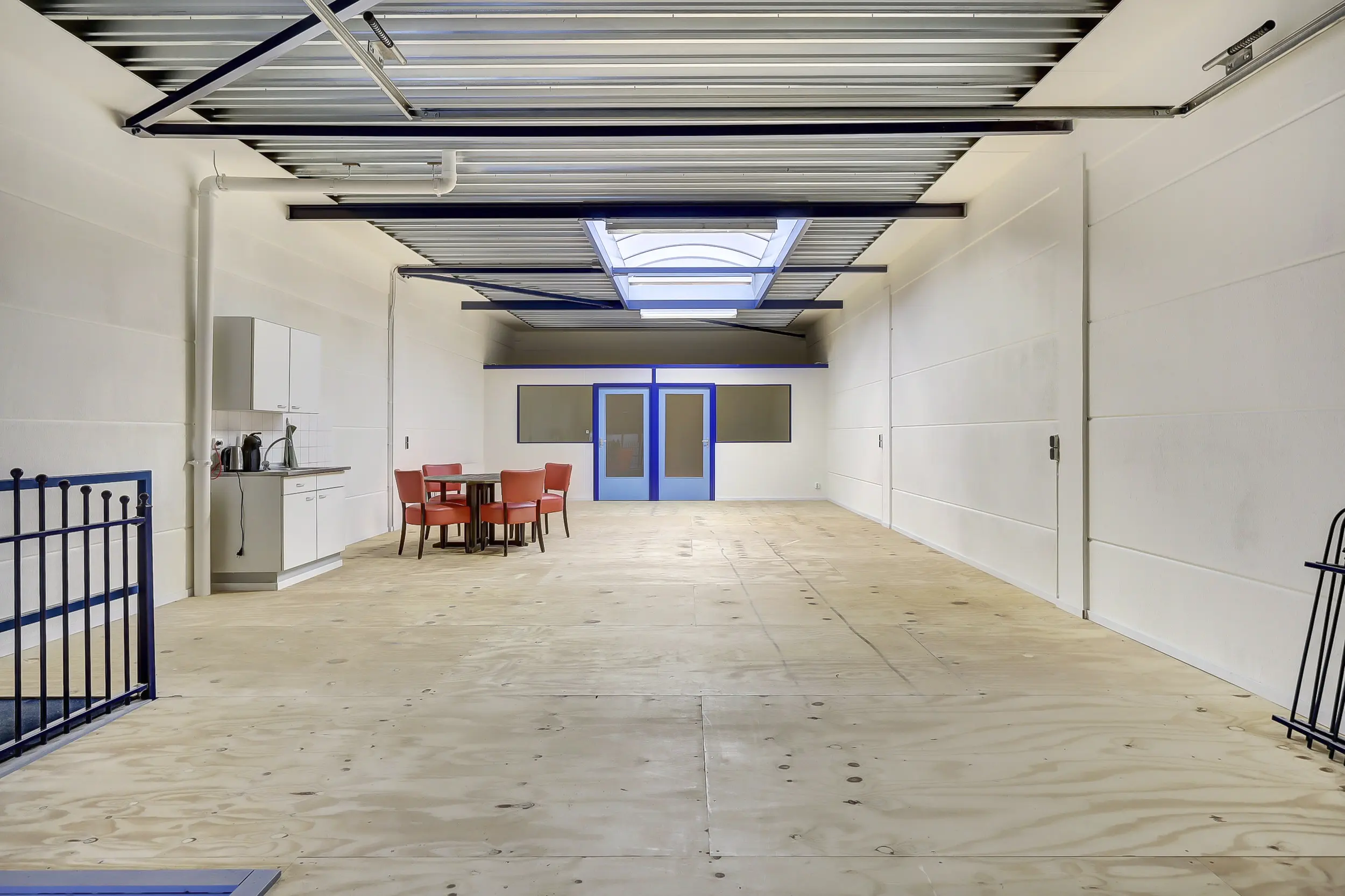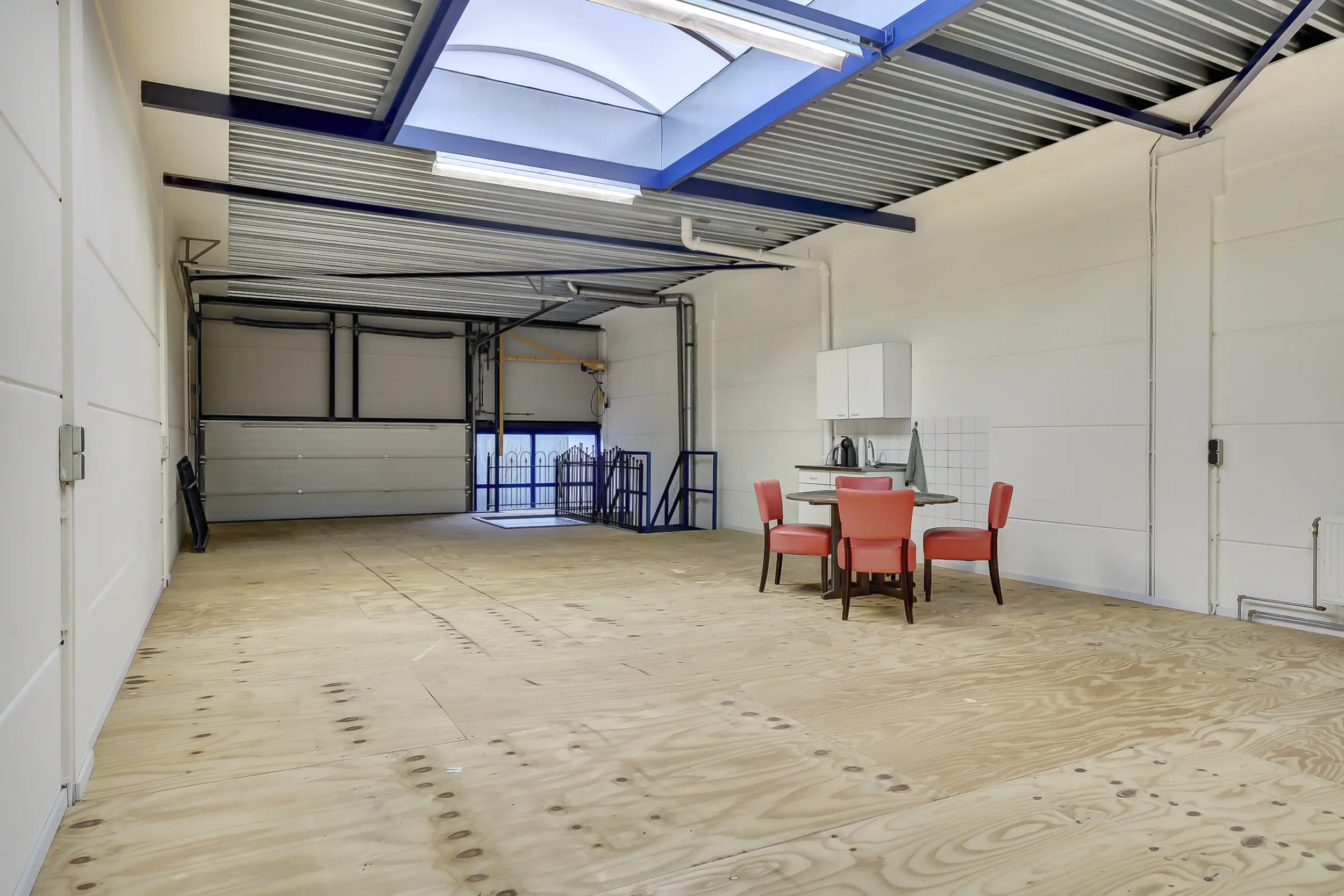 De 1e verdieping is een open ruimte voorzien van een hijsluik en elektrische lier alsmede voorzien van een grote lichtkoepel voor extra daglicht. Er is hier tevens een kitchenette geplaatst en verder zijn er twee separate (kantoor)ruimtes voorzien van elektra en data-aansluitingen.