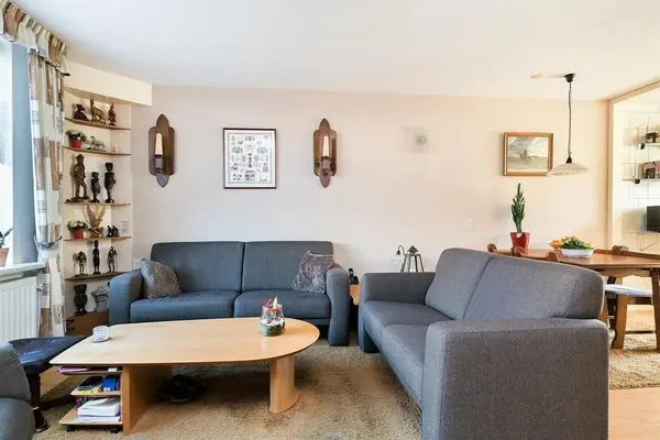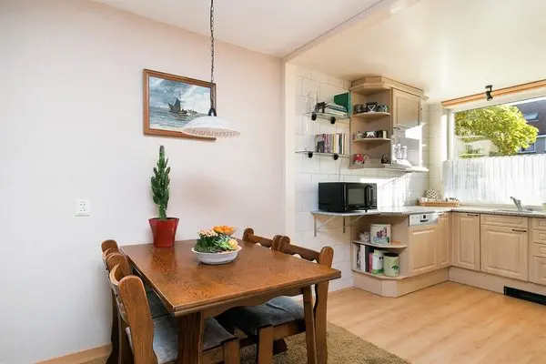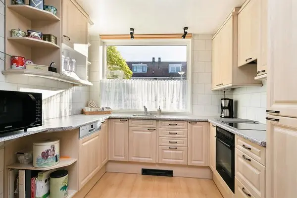 Ruime lichte woonkamer met open keuken voorzien van inbouwapparatuur zoals: keramische kookplaat, afzuigkap, elektrische oven, koel-/vriescombinatie en vaatwasser.