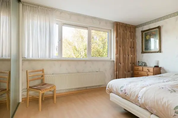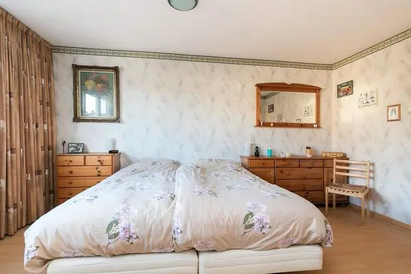 Slaapkamer aan de achterzijde met een tweepersoonsbed.