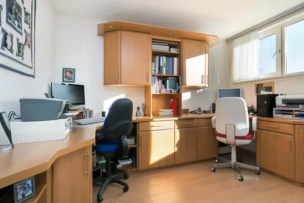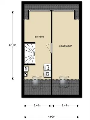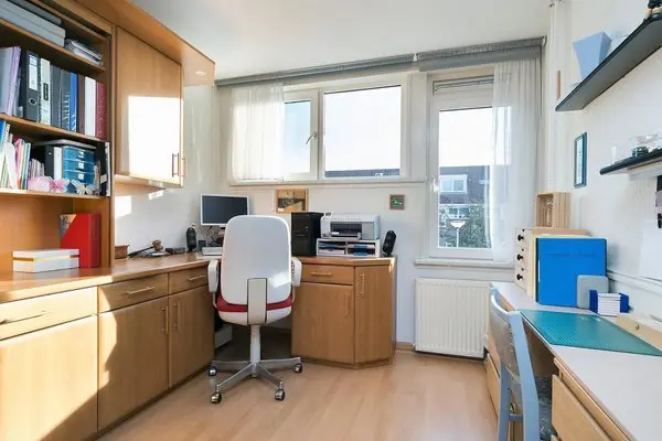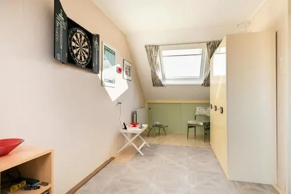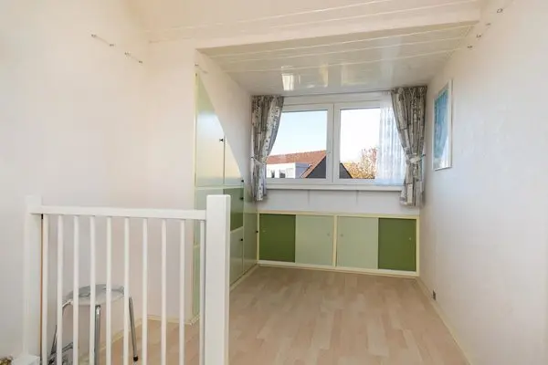 Overloop met gangkast. Slaapkamer aan de voorzijde met wandkast en bureau alsmede een eenpersoonsbed.