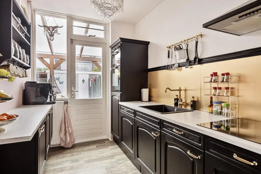 Entree van de woning via de hal met meterkast, trapopgang, trapkast en toilet. Toegang naar de keuken welke is voorzien van een dubbele wandopstelling met diverse inbouwapparatuur waaronder een inductie kookplaat en afzuigkap, vaatwasser, koelkast, oven en magnetron. Deur naar de tuin. De lichte en diepe (7,5 meter) woonkamer is sfeervol, de muren en plafond zijn gestuct en de vloer is afgewerkt met laminaat. Via de openslaande deuren kunt u naar de tuin met overkapping.
