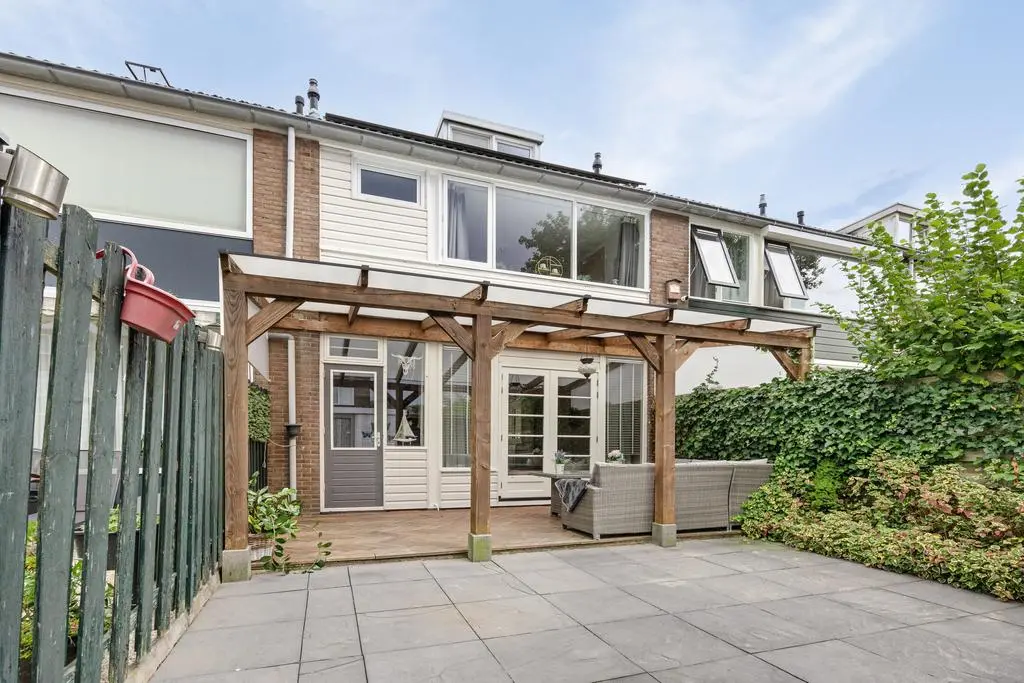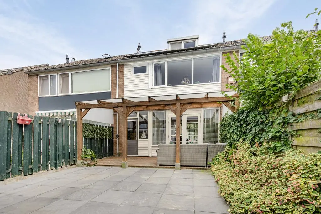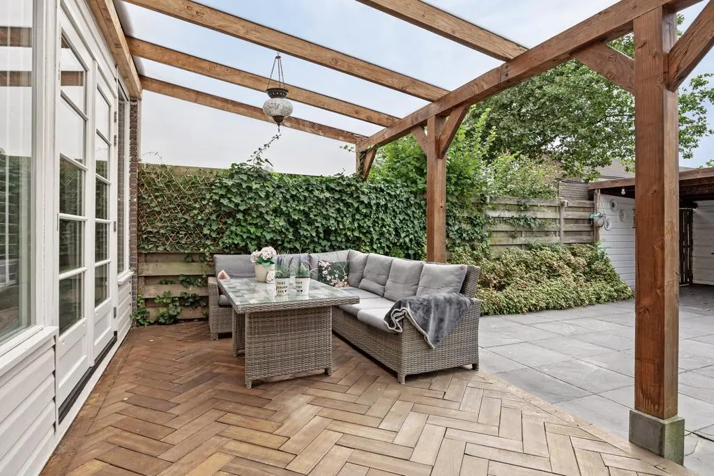 De tuin is verrassend met een over de gehele breedte een overkapping met houten vlonder terras, een stenen berging voorzien van elektra en aangebouwde overkapping. Er liggen grote onderhoudsvriendelijke tegels en er is een achterom. De tuin is gelegen op het westen.