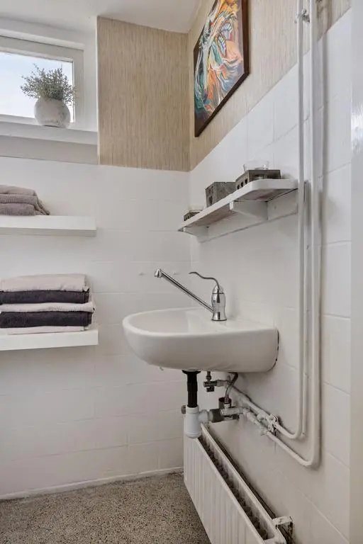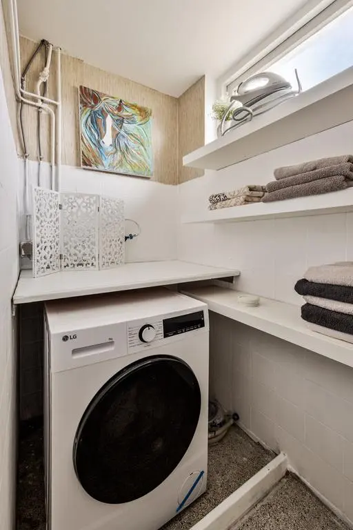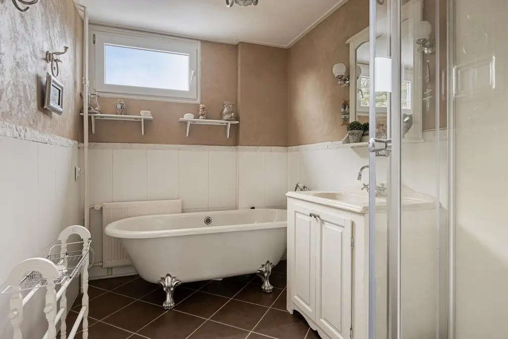Overloopruimte met trapopgang naar de zolder en toegang naar de 2 ruime slaapkamers met laminaatvloer. De badkamer is voorzien van een ligbad op pootjes, wastafelmeubel en een douchecabine. Naast de badkamer ligt een separate toiletruimte en in de voormalige badkamer is nu een wasruimte gecreëerd. Deze beschikt nog een wastafel en aansluiting voor de wasmachine.