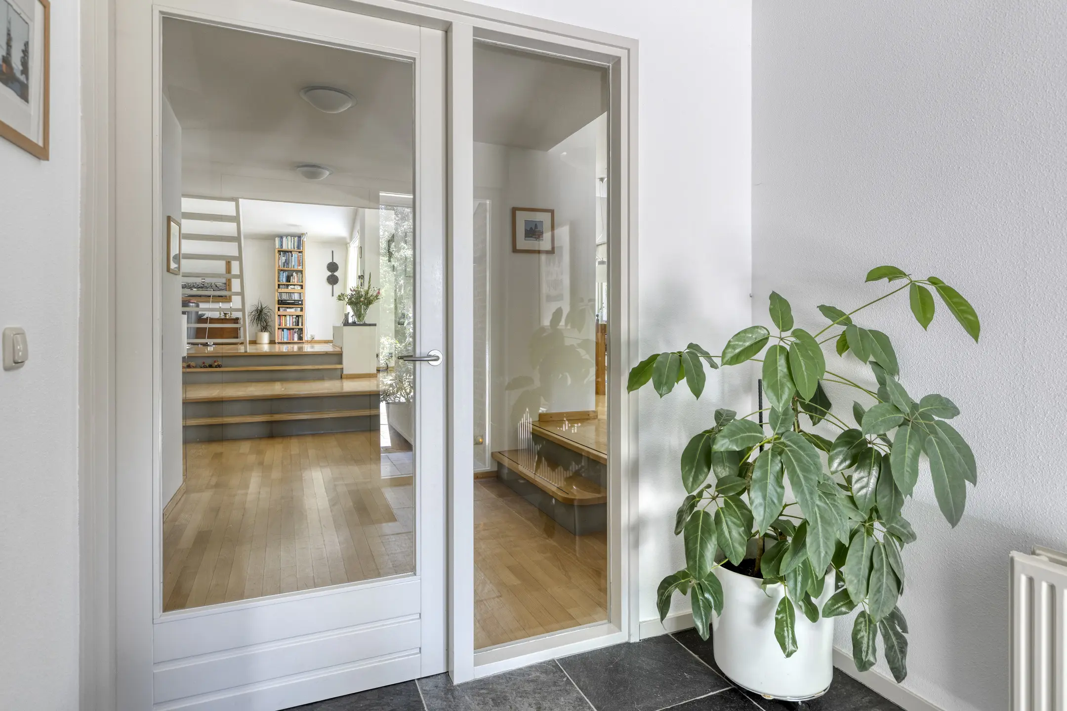 U betreedt de woning via een verzorgd (tocht)portaal met doorgang naar de centrale hal. Hier valt direct de hoogwaardige beukenhouten vloer op die grotendeels over de begane grond is door gelegd. In de hal bevinden zich de meterkast, garderobe nis en toegang tot de study/bibliotheek aan de tuinzijde. Deze lichte ruimte beschikt over een dubbele tuindeur naar buiten en is uitermate geschikt als thuiswerkplek, leesruimte of muziek-/hobbykamer.