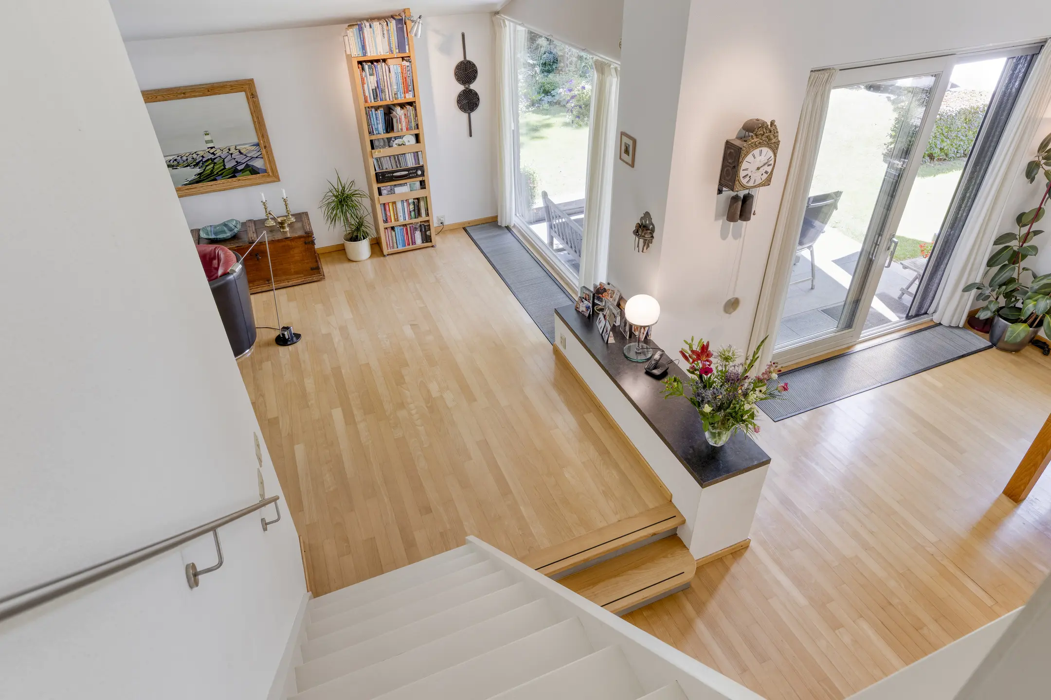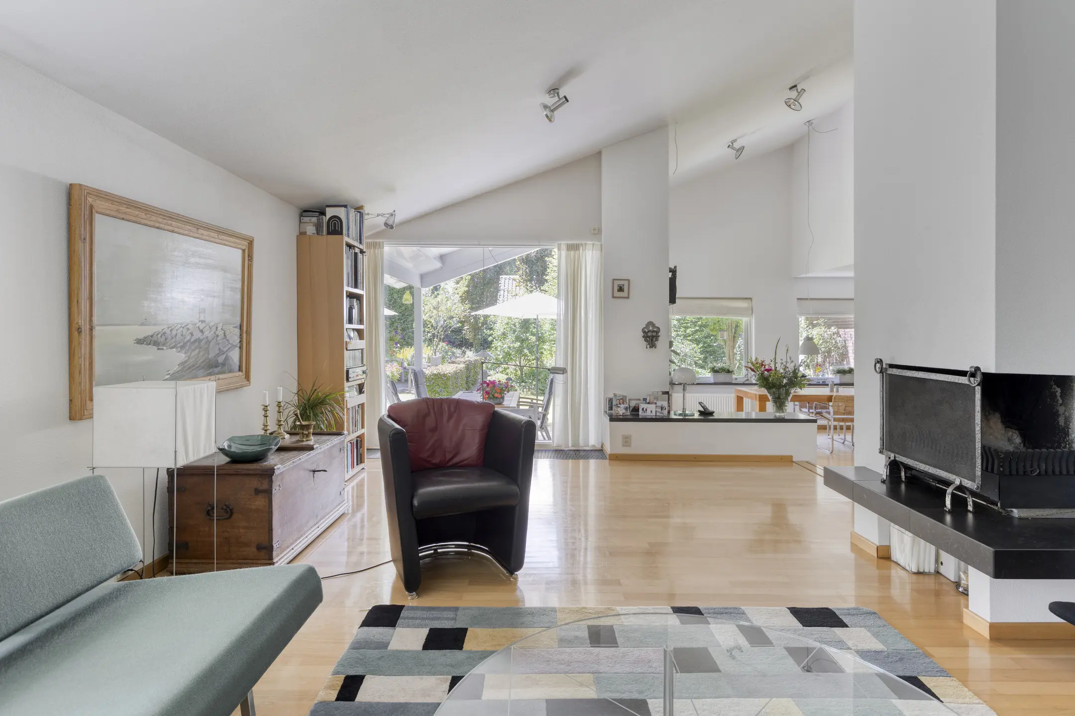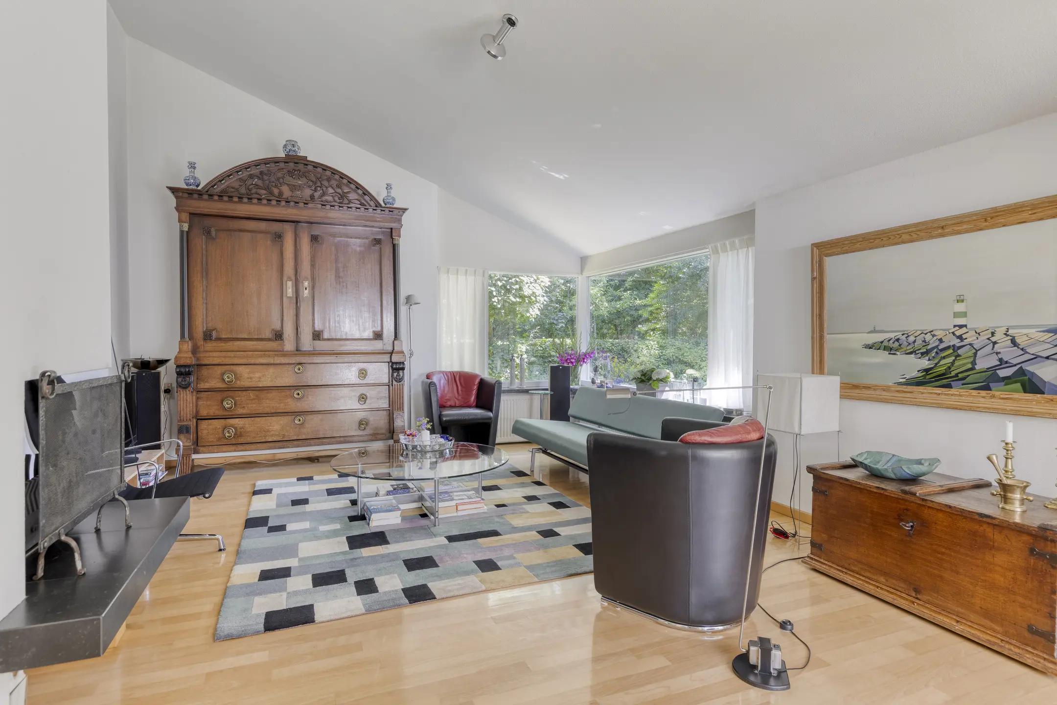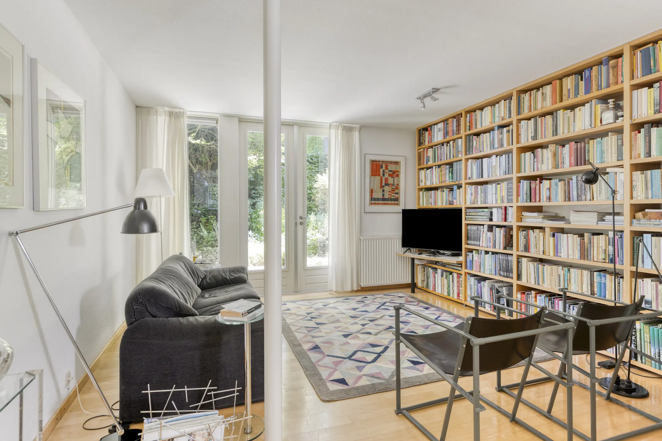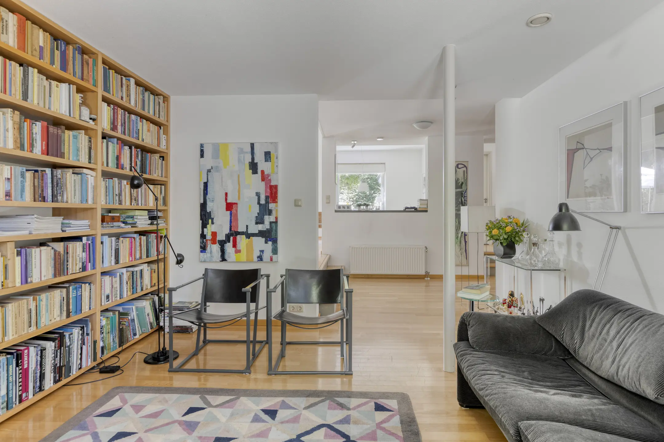 De leefruimtes zijn royaal en fraai met elkaar verbonden. De eetkamer, met een grote hardhouten schuifpui naar het zonneterras, vormt het centrale punt tussen keuken en zitkamer. De gezellige zithoek is ruim en licht, ideaal voor ontspannen avonden of het ontvangen van gasten.