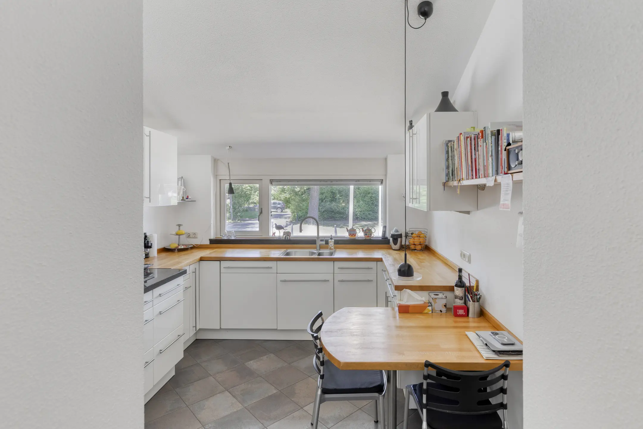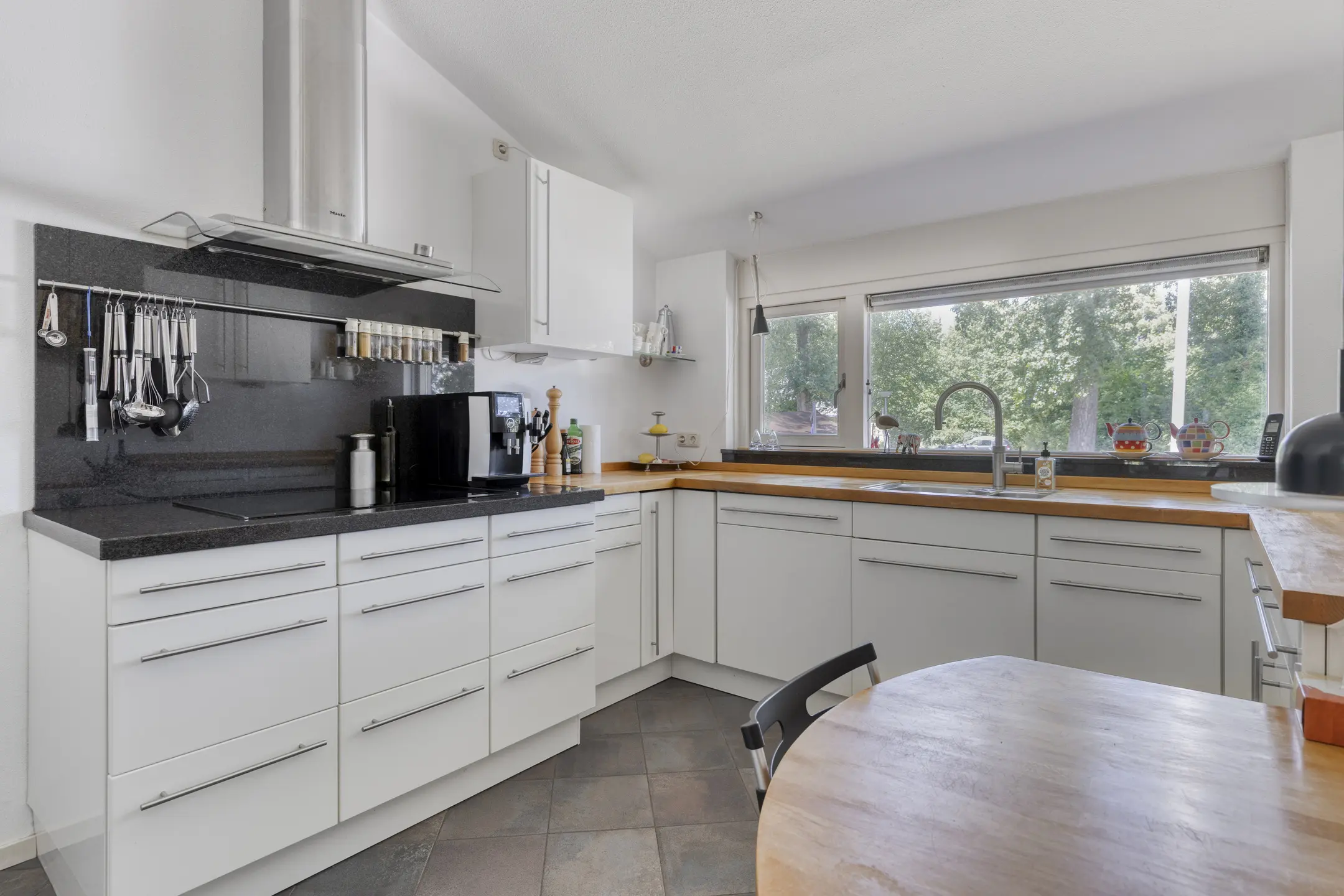De keuken staat in een praktische U-opstelling en is afgewerkt met een massief beuken houten aanrechtblad. De inbouwapparatuur bestaat uit een keramische kookplaat, afzuigkap, oven, magnetron, koel-/vriescombinatie, vaatwasser en Quooker kraan.