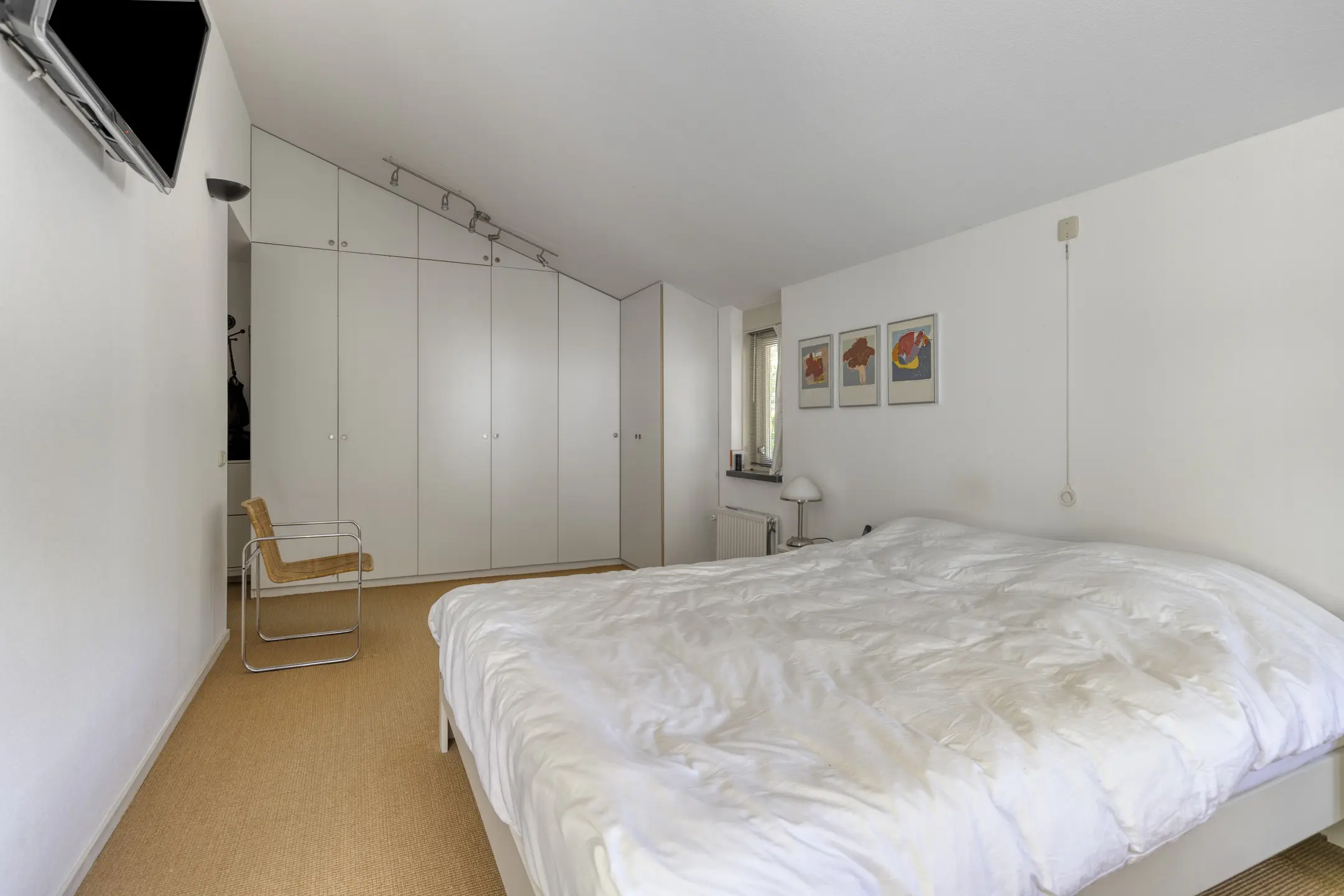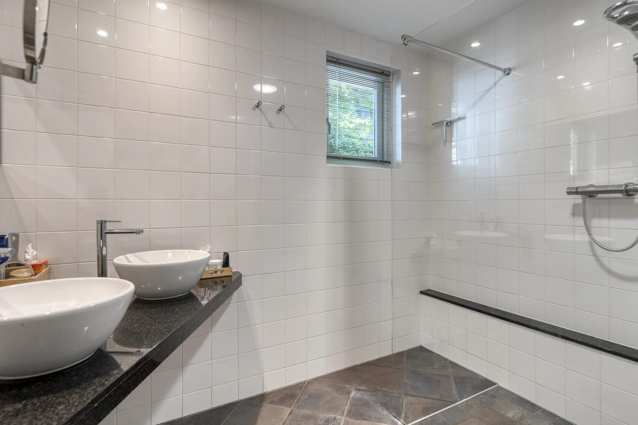 De toiletruimte is volledig betegeld en uitgerust met een fonteintje en hangend closet. Vanuit de hal bereikt u tevens de royale slaapkamer op de begane grond, voorzien van tapijt, vaste (garderobe)kasten en openslaande deuren naar de tuin. De aangrenzende badkamer is volledig betegeld en beschikt over een ruime inloopdouche, dubbele wastafel met meubel, handdoekradiator, mechanische ventilatie en ingebouwde LED-verlichting.