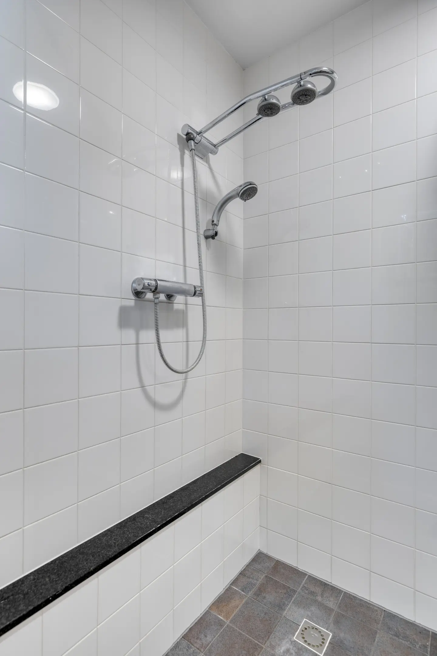 Ook op deze verdieping bevindt zich een moderne badkamer, betegeld en uitgerust met een inloopdouche, wastafelmeubel, hangend toilet, inbouw LED-verlichting, mechanische ventilatie en elektrische vloerverwarming.