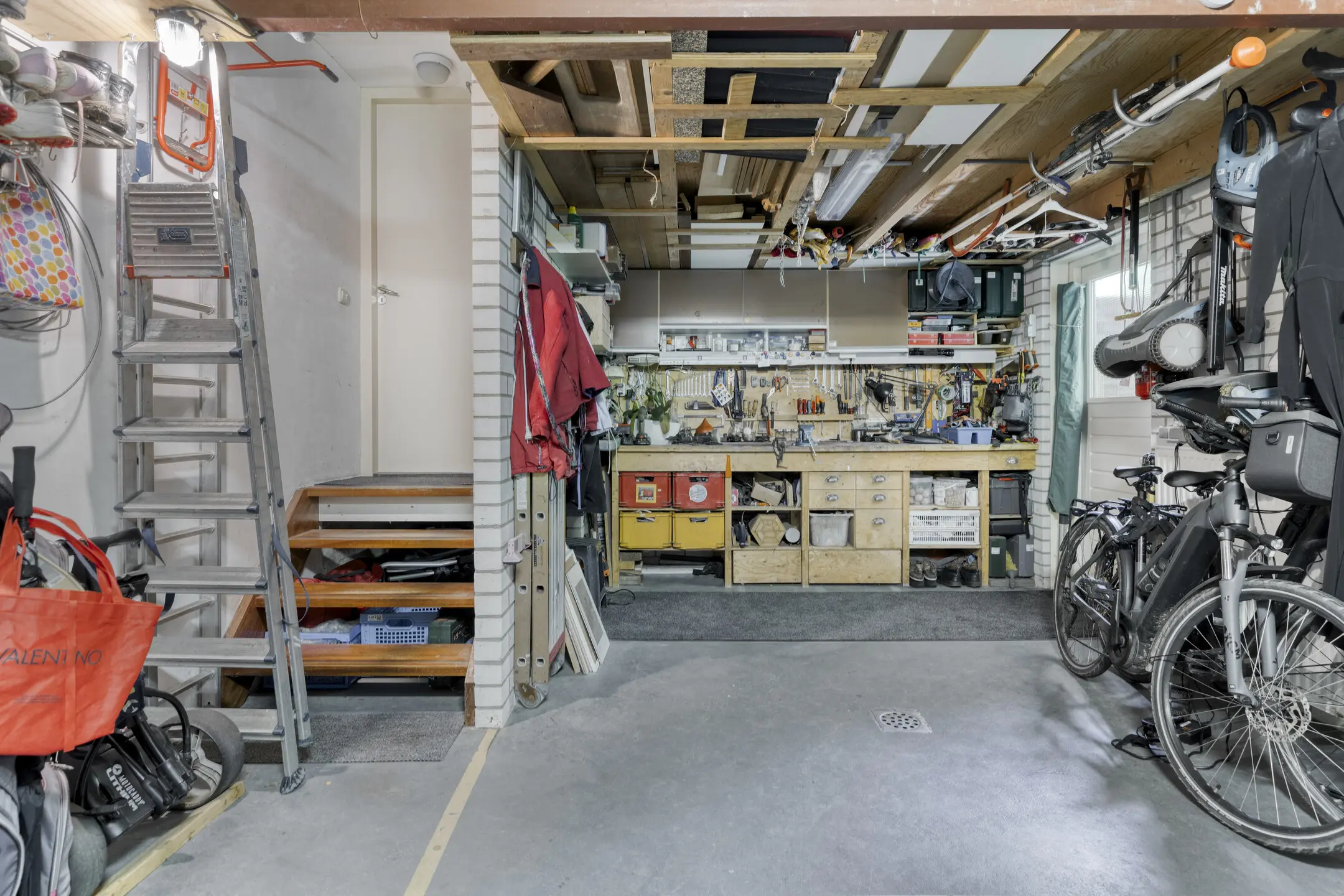 Grenzend aan de keuken ligt de praktische bijkeuken met plavuizenvloer, kitchenette welke is voorzien van een aansluiting voor de wasmachine en droger, boiler, tuindeur en toegang tot de garage. De ruime garage beschikt over een sectional deur, entresol (bergzolder), opstelling van de mechanische afzuiging, elektra-aansluitingen, schrobput en tuindeur naar de achtertuin. De carport aan de voorzijde maakt het plaatje compleet.