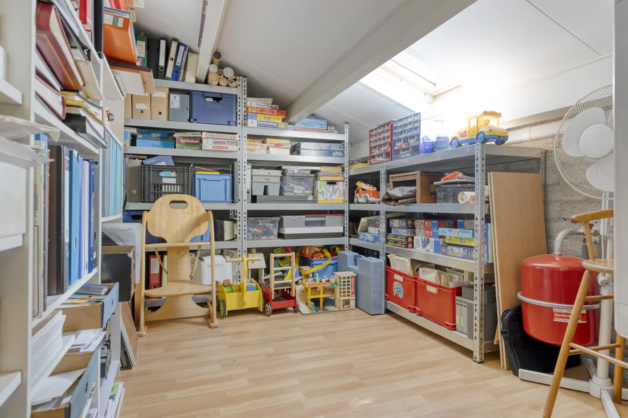 Daarnaast is er een berging/zolderruimte aanwezig met Velux kantelraam en de opstelling van de cv-combiketel en hybride warmtepomp.