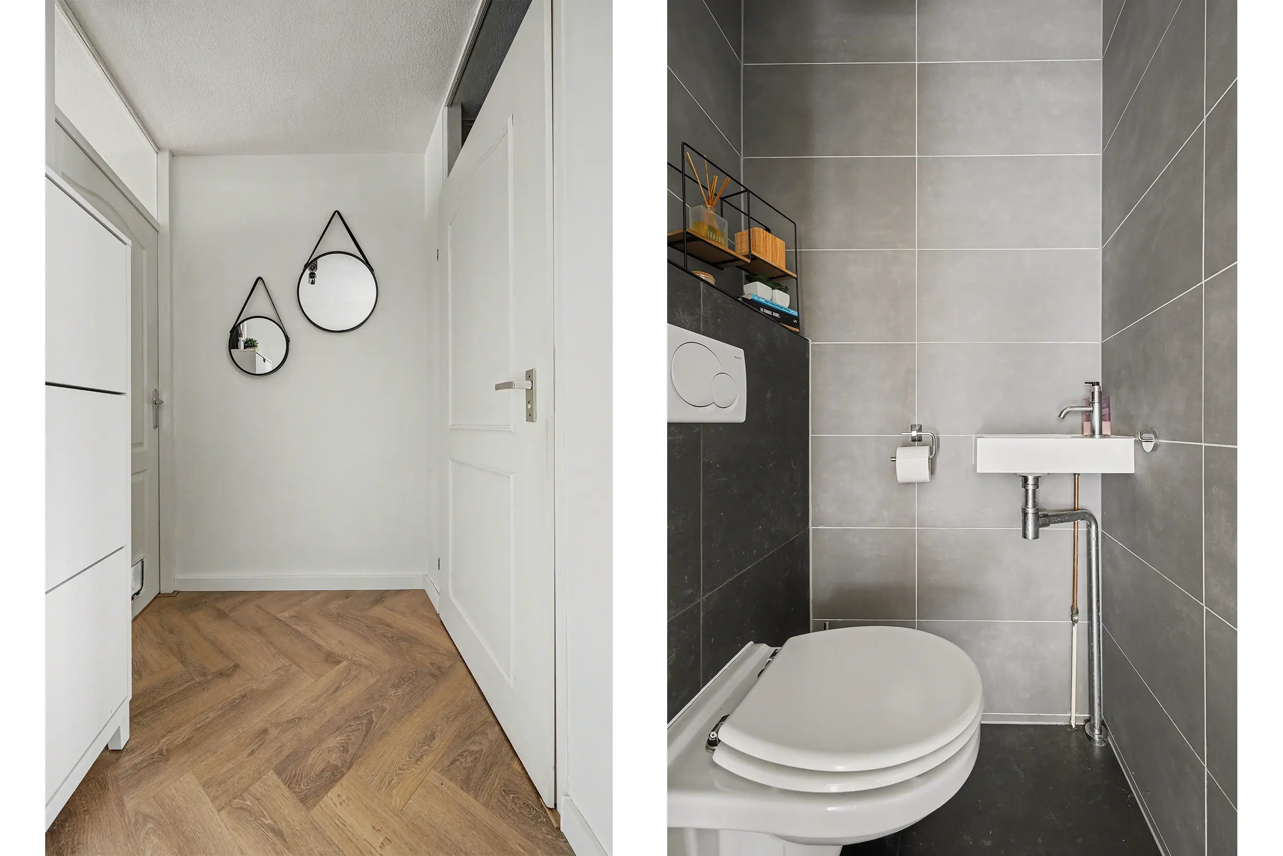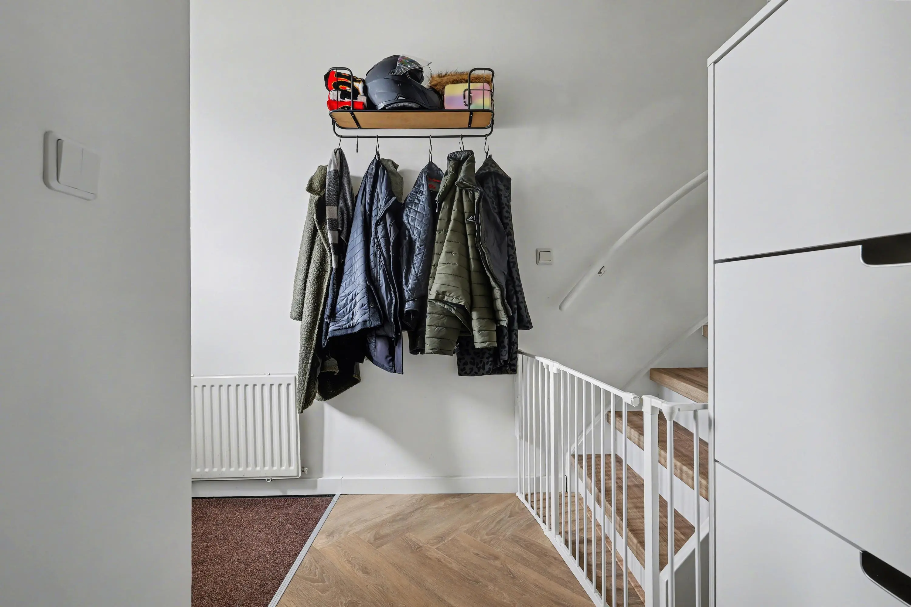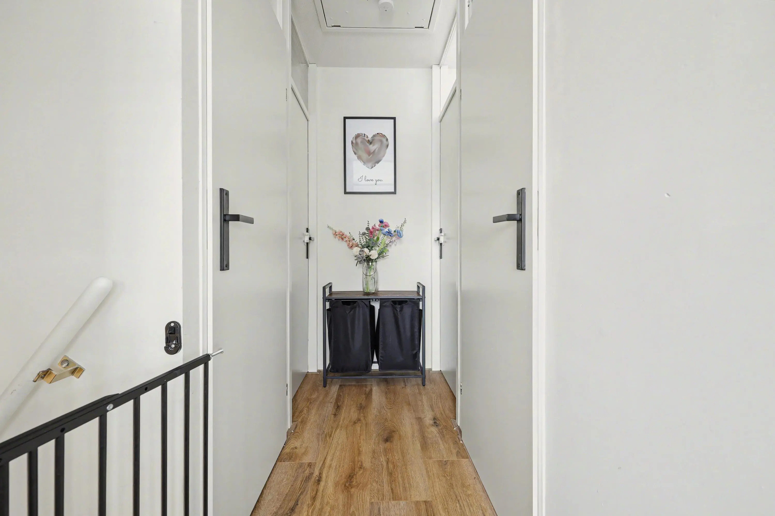 Overloopruimte met recent vervangen laminaatvloer (gehele verdieping). Toegang naar de drie slaapkamers waarvan twee slaapkamers aan de achterzijde voorzien zijn van rolluiken. Volledige betegelde badkamer met wastafelmeubel en hoge kast, wandcloset, inloopdouche met thermostaatkraan voorzien van regen- en handdouche. Separate berging met de aansluiting voor de wasmachine/droger en tevens de opstelling van de CV combiketel.