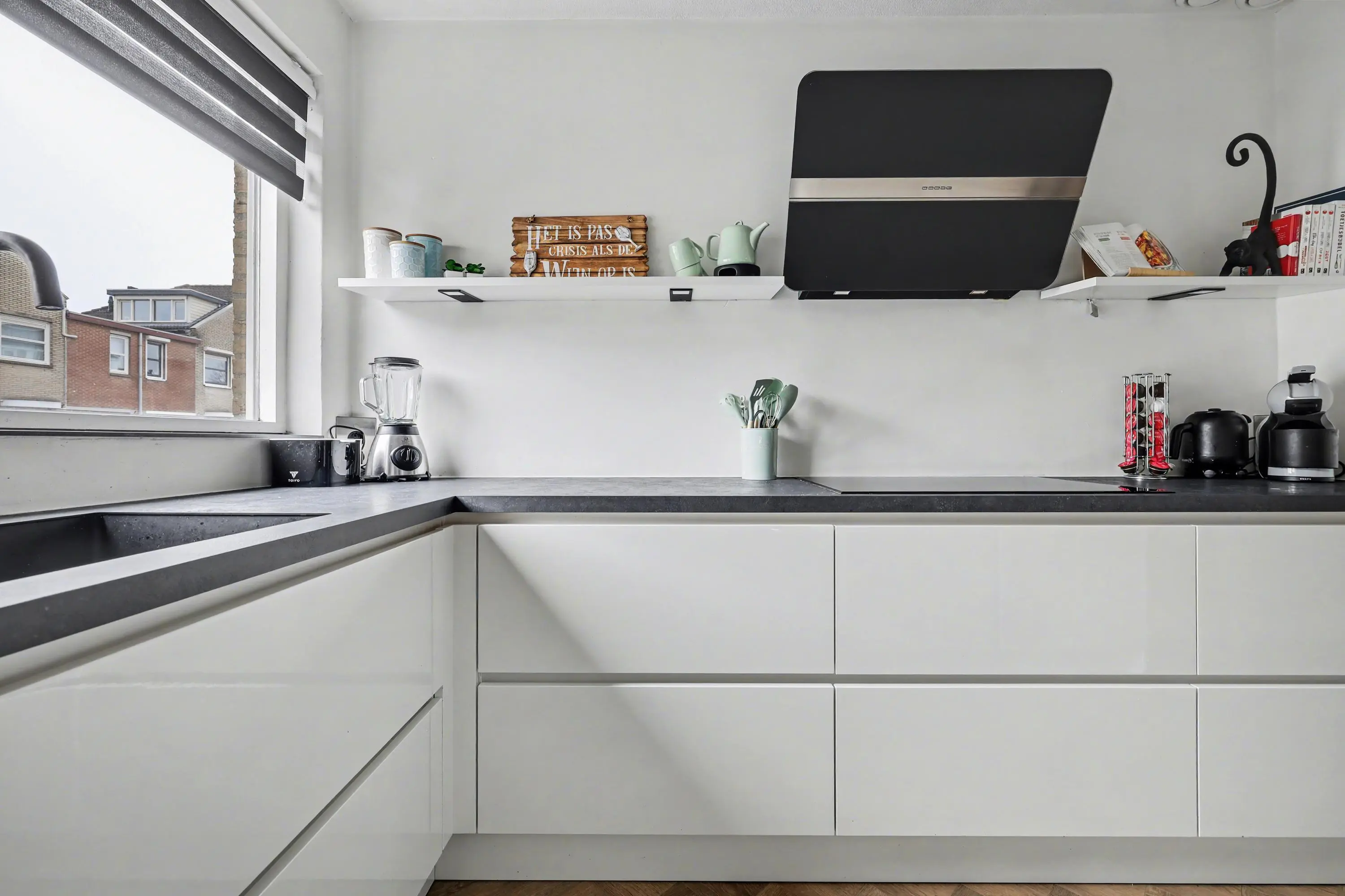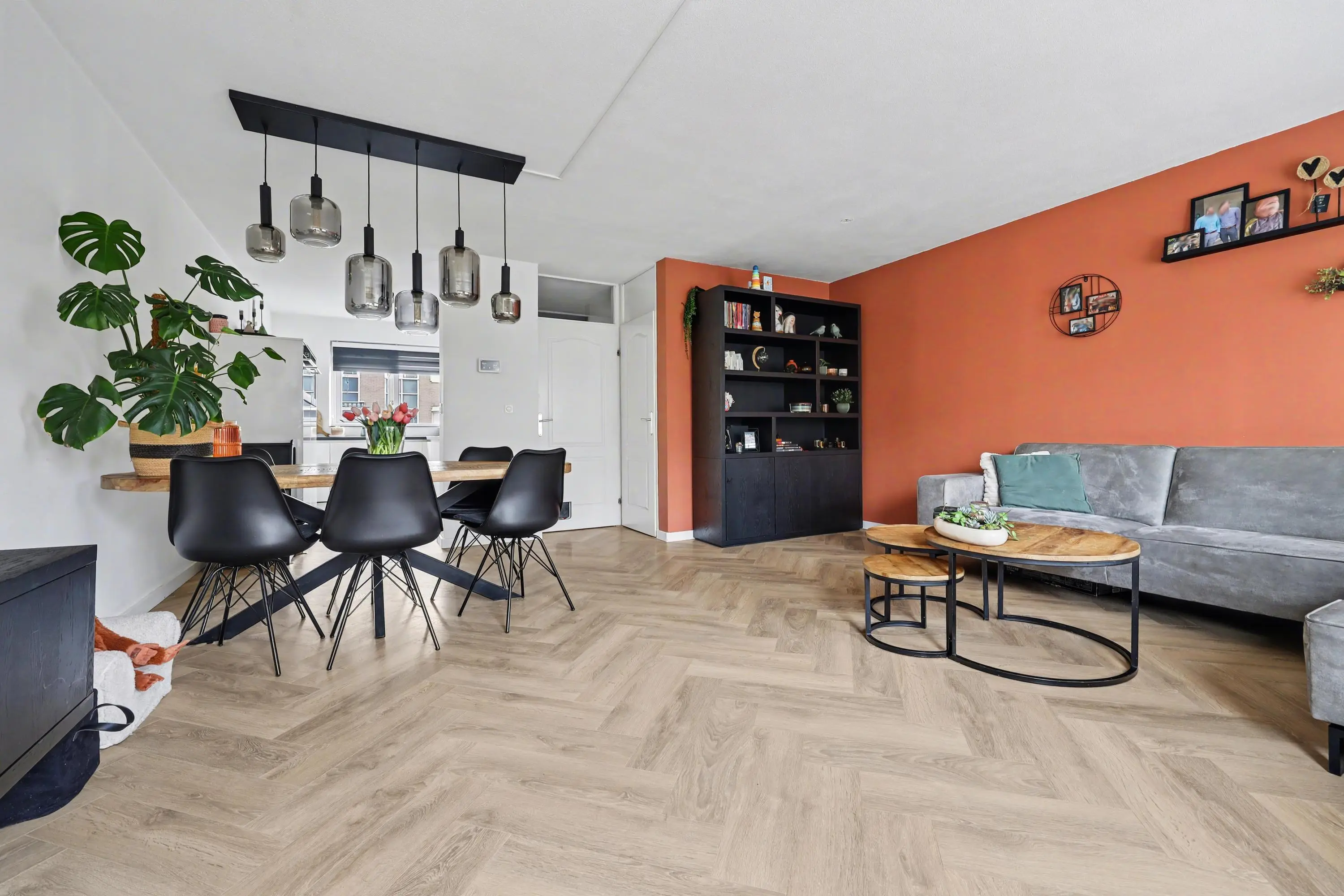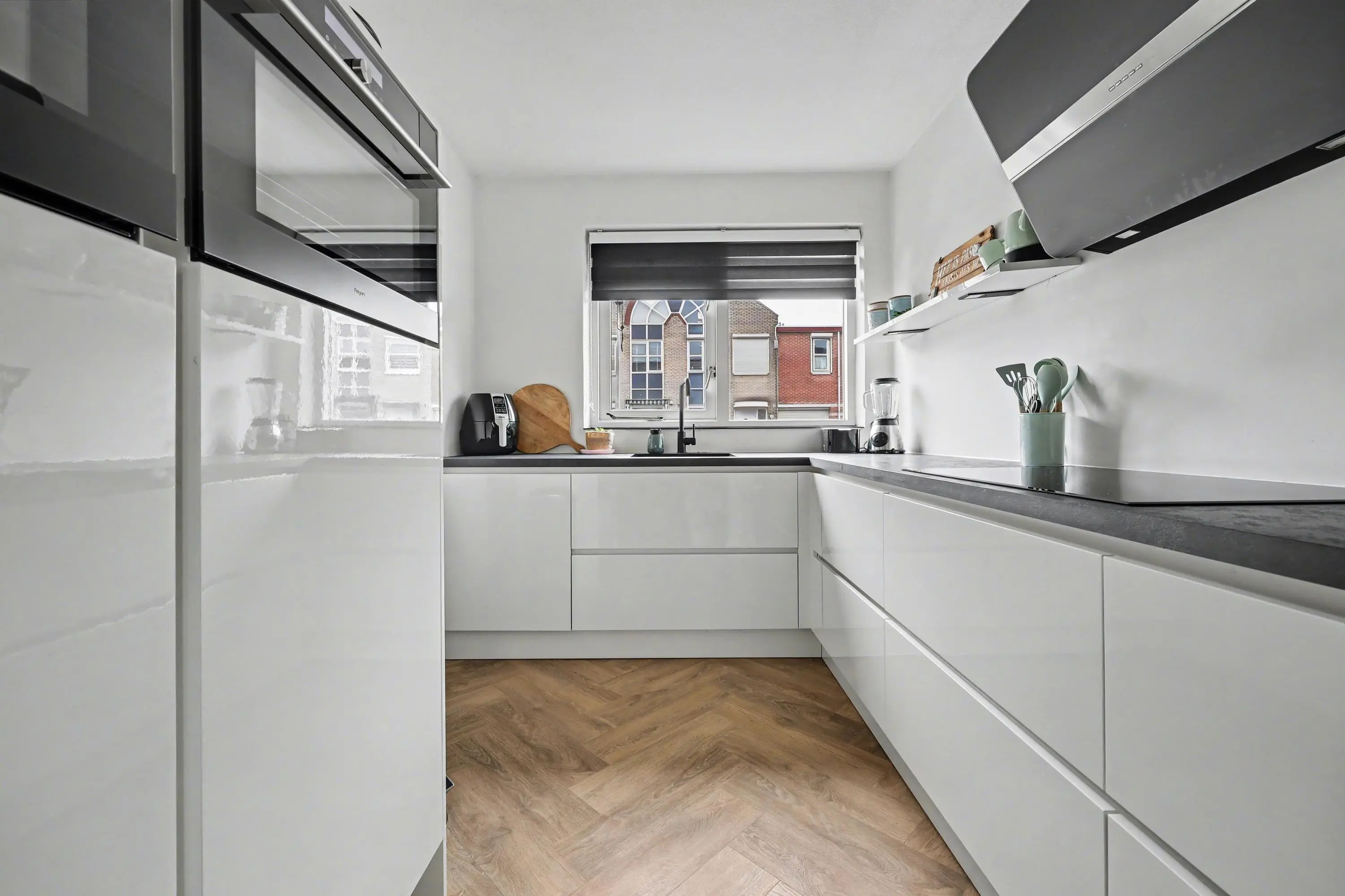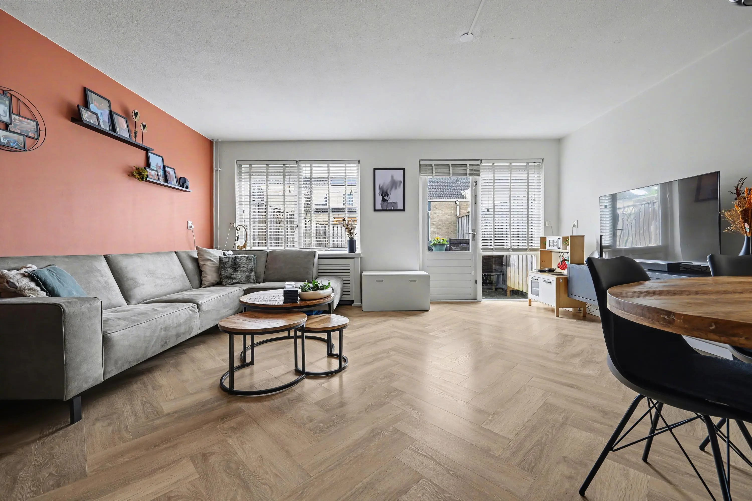 Hal/entree met PVC vloer (gehele begane grond), trapopgang en meterkast. Moderne toiletruimte met wandcloset en fonteintje. Tuingerichte woonkamer met veel lichtinval, trap-/bergkast en deur naar de achtertuin. Open keuken in L-opstelling uitgevoerd met een inductie kookplaat met afzuigkap, vaatwasmachine en meer dan voldoende bergruimte door de vele lades. Tevens een rechte wandopstelling met daarin de koel- vriescombinatie, combi-oven en (magnetron) oven.