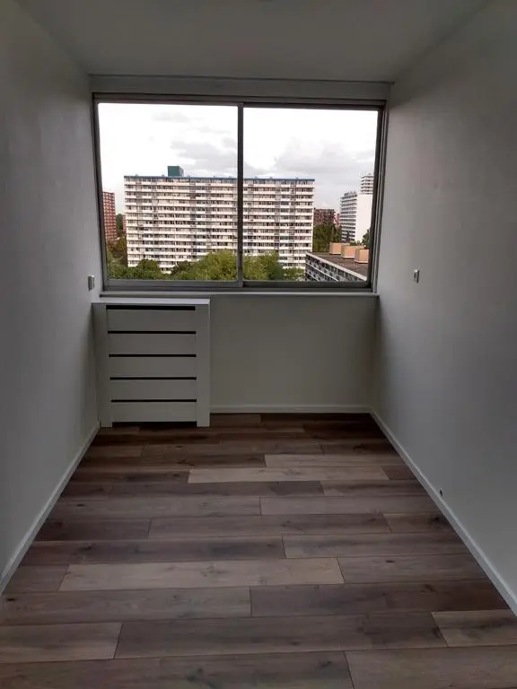 Het appartement met entree/ hal met toegang tot de vier slaapkamers, woonkamer/ keuken, het aparte toilet en badkamer. Het gehele appartement is voorzien van een laminaat vloerafwerking, behoudens het toilet en badkamer. Het toilet is voor de helft betegeld en voorzien van een hangend closet en een fonteintje. De badkamer is volledig betegeld en is voorzien van een inloopdouche, wastafelmeubel en een vaste kast met opstelling van wasmachine en droger. Vanuit de woonkamer is de keuken bereikbaar, de keuken is in een L-opstelling en uitgevoerd met diverse inbouwapparatuur zoals een inductie kookplaat, combi-oven, rvs-afzuigkap, rvs-spoelbak, een inbouwkoelkast met vriezer en onder- en bovenkastjes. Het balkon is vanuit de keuken bereikbaar.