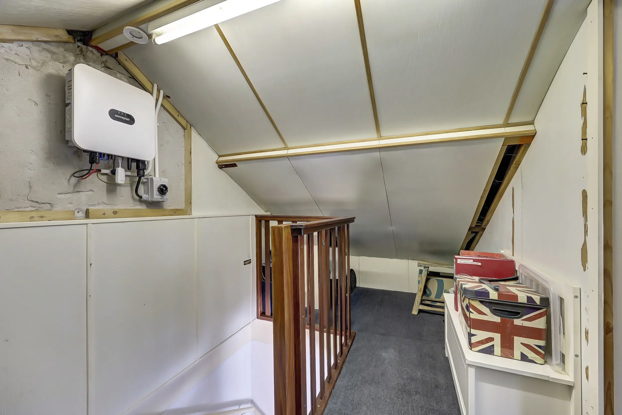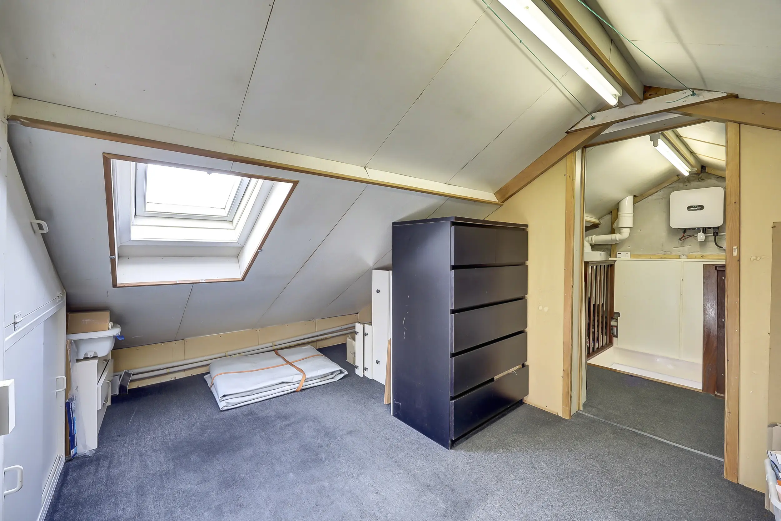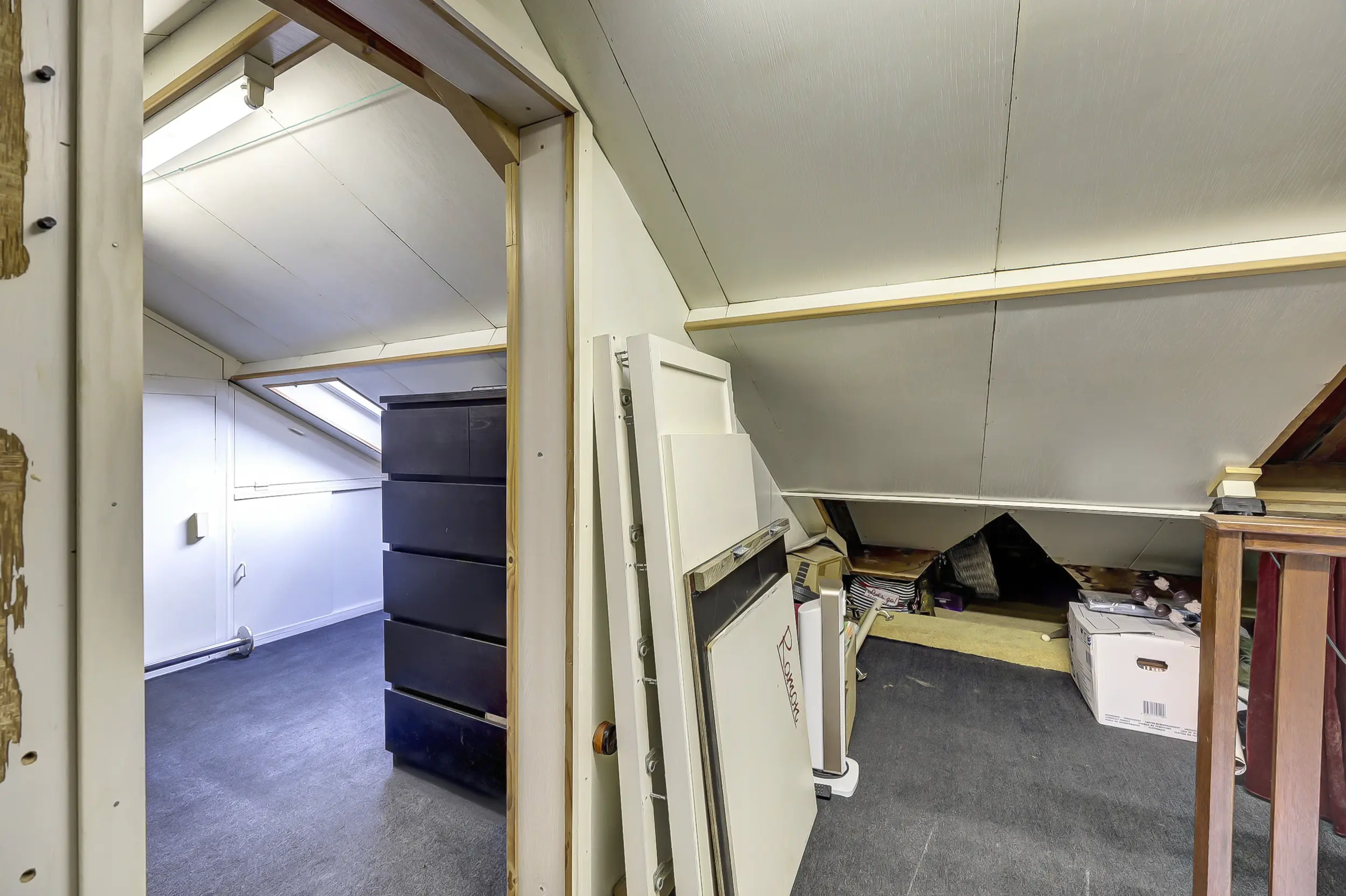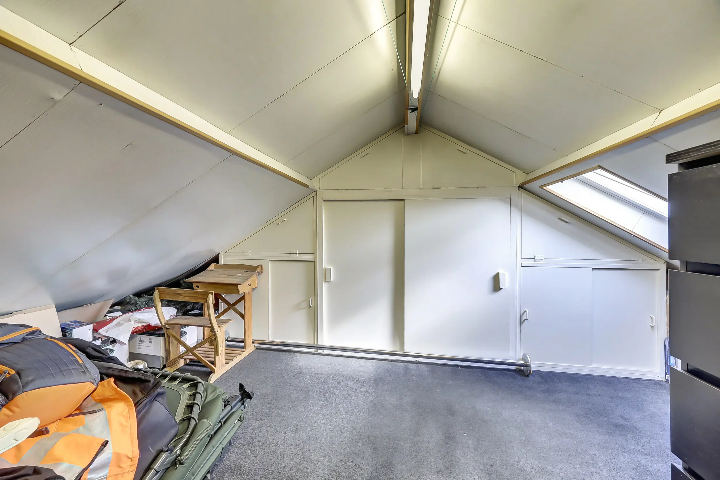 Middels vaste trap te bereiken zolder met enorm veel bergruimte door de opbouw. Verder bij de overloop de opstelling van de cv ketel (Nefit 2012) en de inverter van de zonnepanelen. Ruime zolderkamer met Velux dakraam.