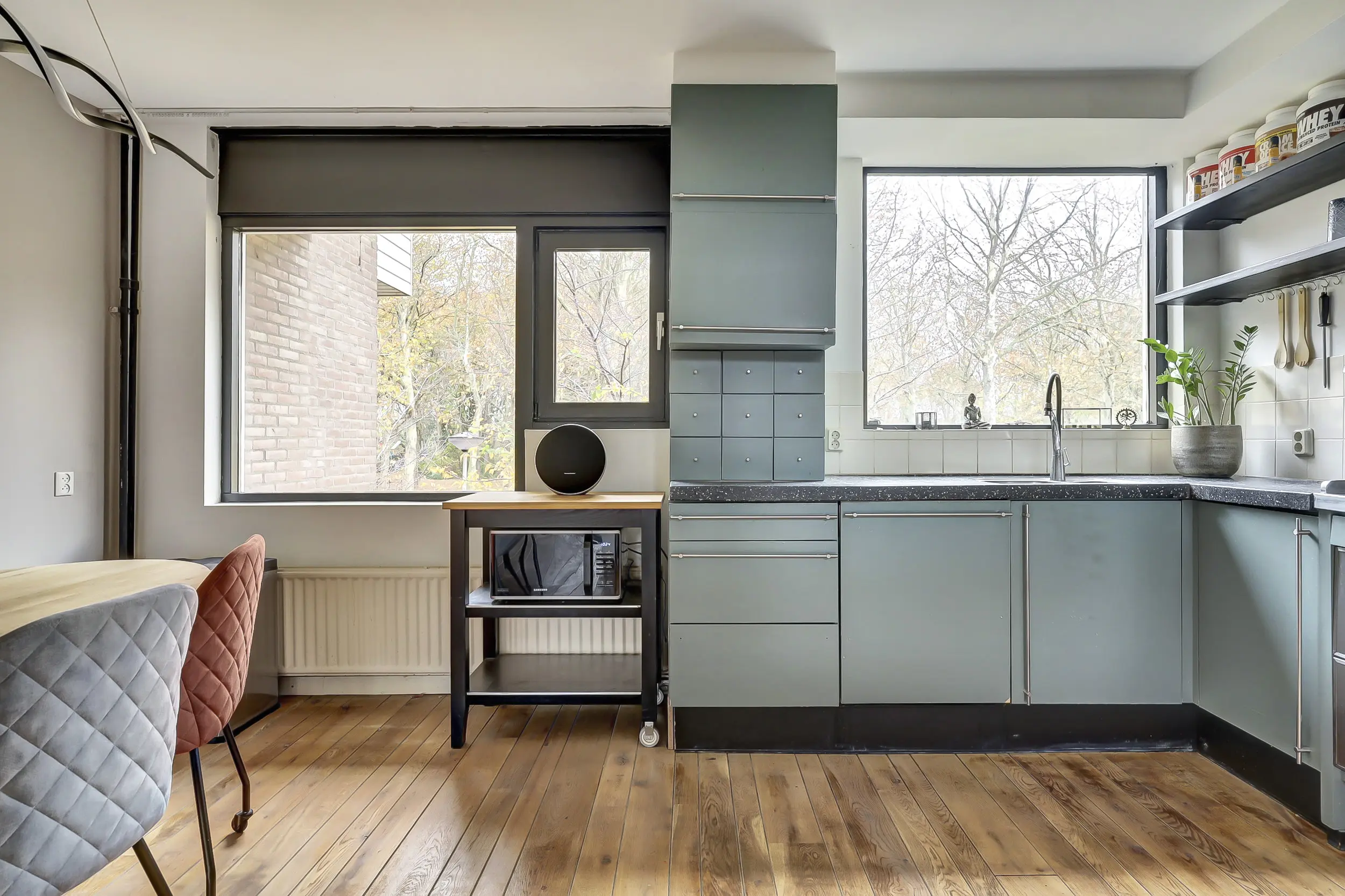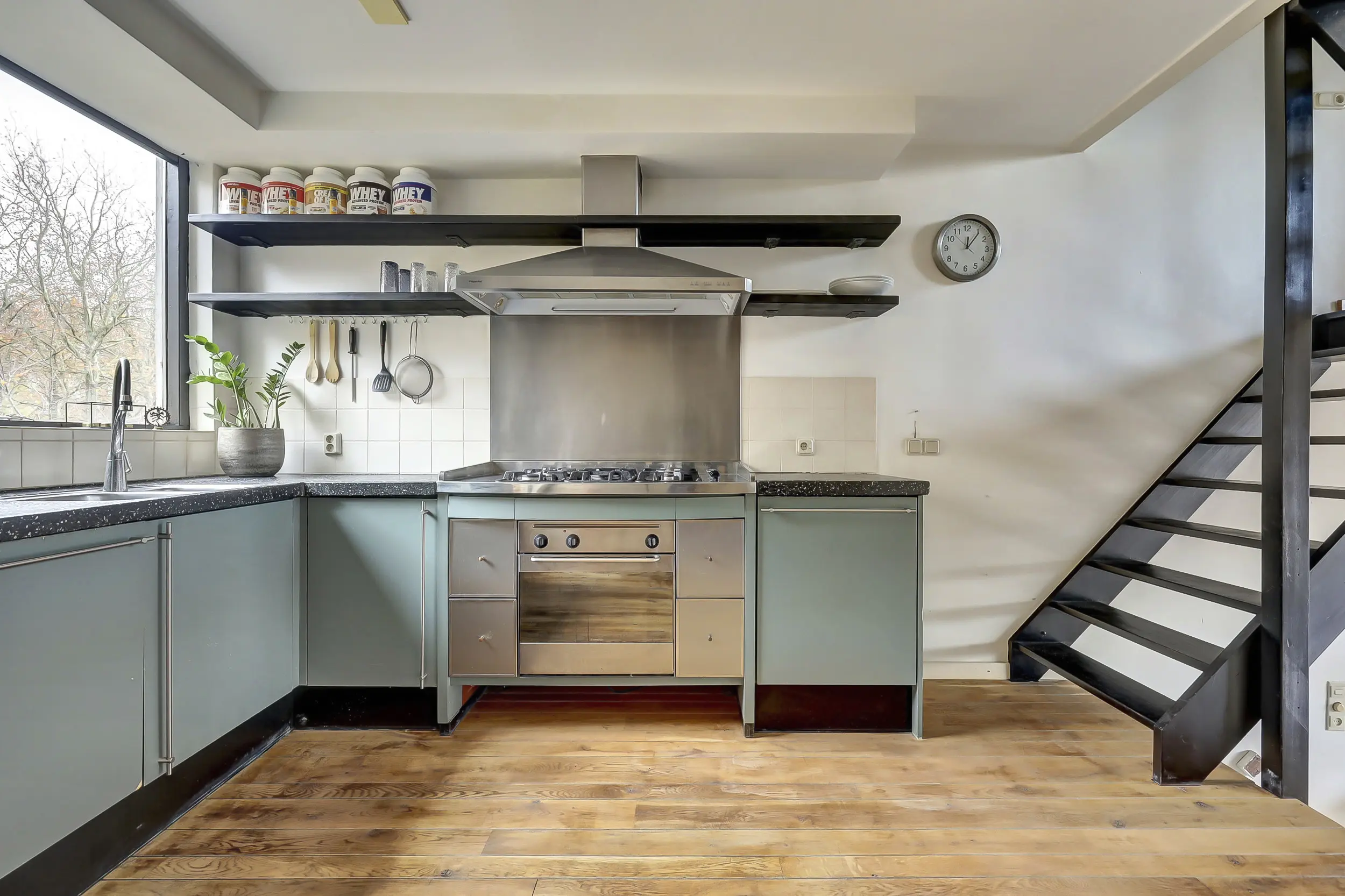Woonverdieping (2 niveau’s): terras gerichte woonkamer met mooie houtenvloer met een schuifpui naar het terras, open haard; korte trap; woon-/eetkeuken met dezelfde vloer (hout) als in de woonkamer welke in een L opstelling is gesitueerd, de keuken is voorzien van inbouwapparatuur zoals: een 5-pits fornuis met afzuigkap en een vaatwasser.