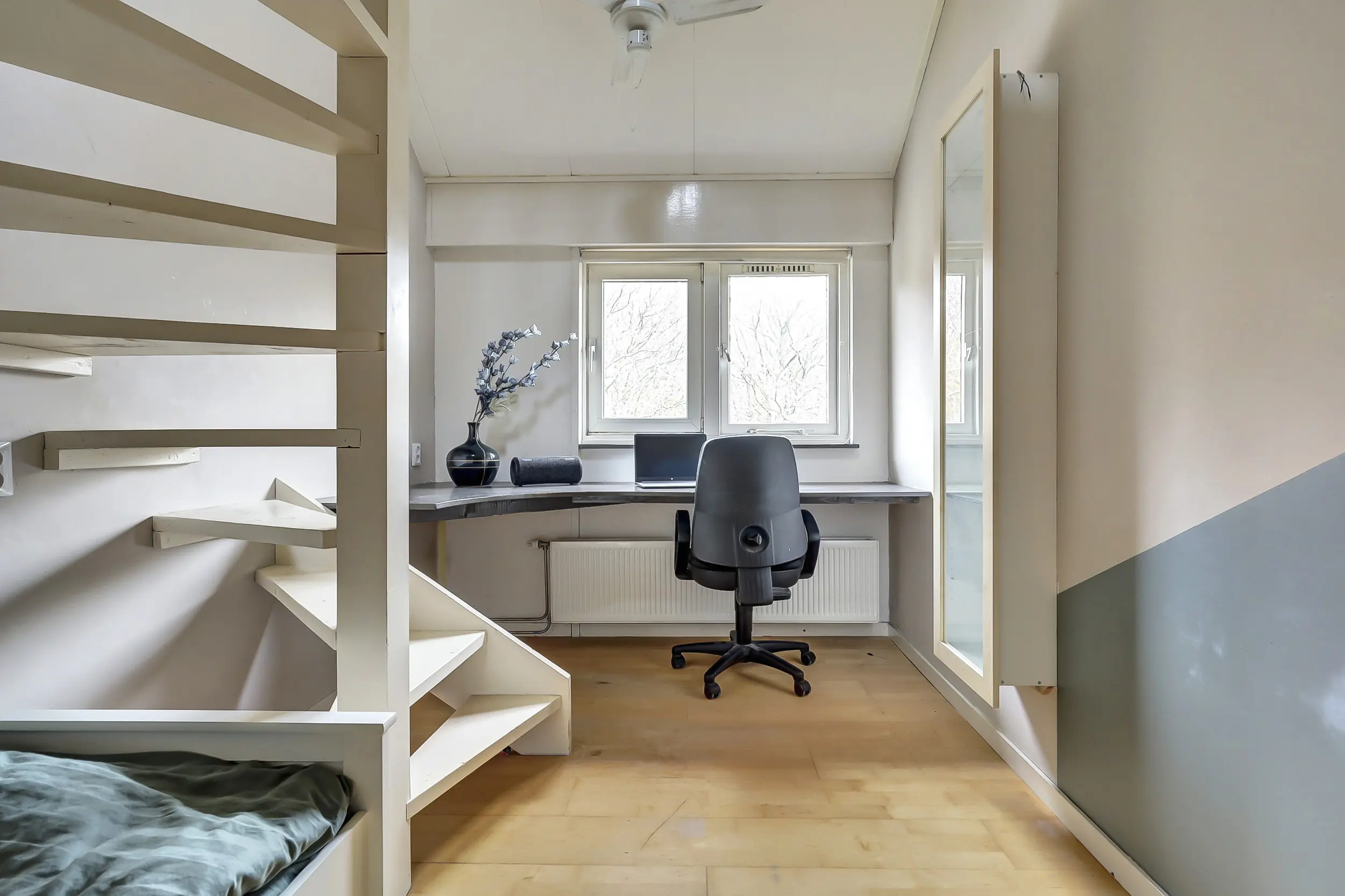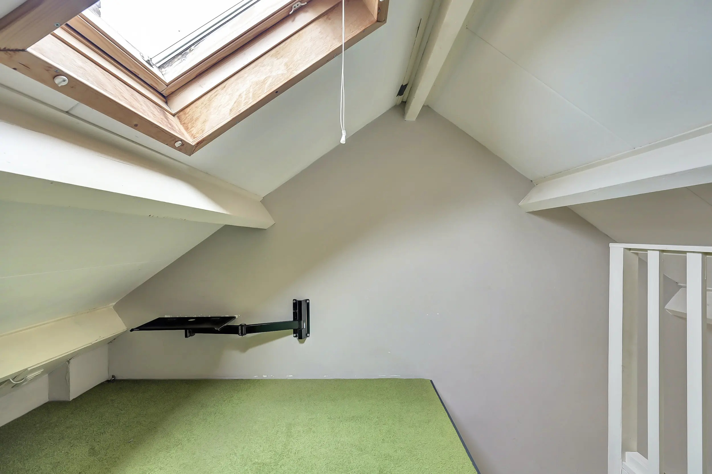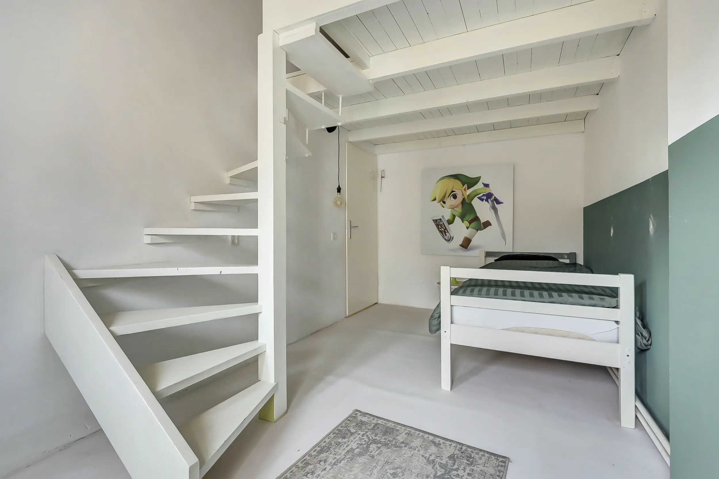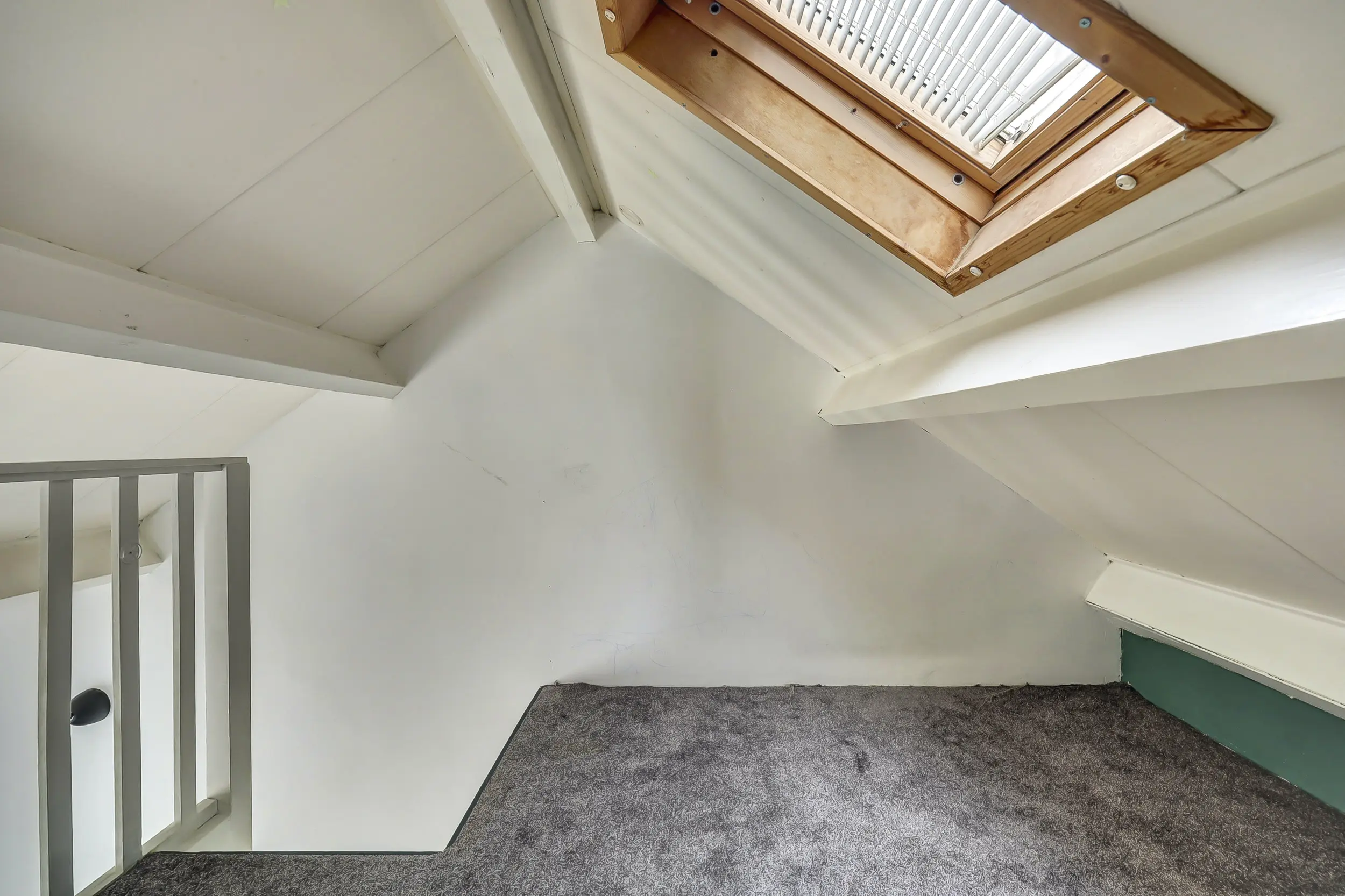 Slaapverdieping (2 niveau’s): overloop met dakafwerking; ruime berging met opstelling van de cv ketel (2009) Remeha Calenta en de opgestelde wasmachine en droger; korte trap; overloop; twee slaapkamers met een trap naar de vide, de droom van elk kind!