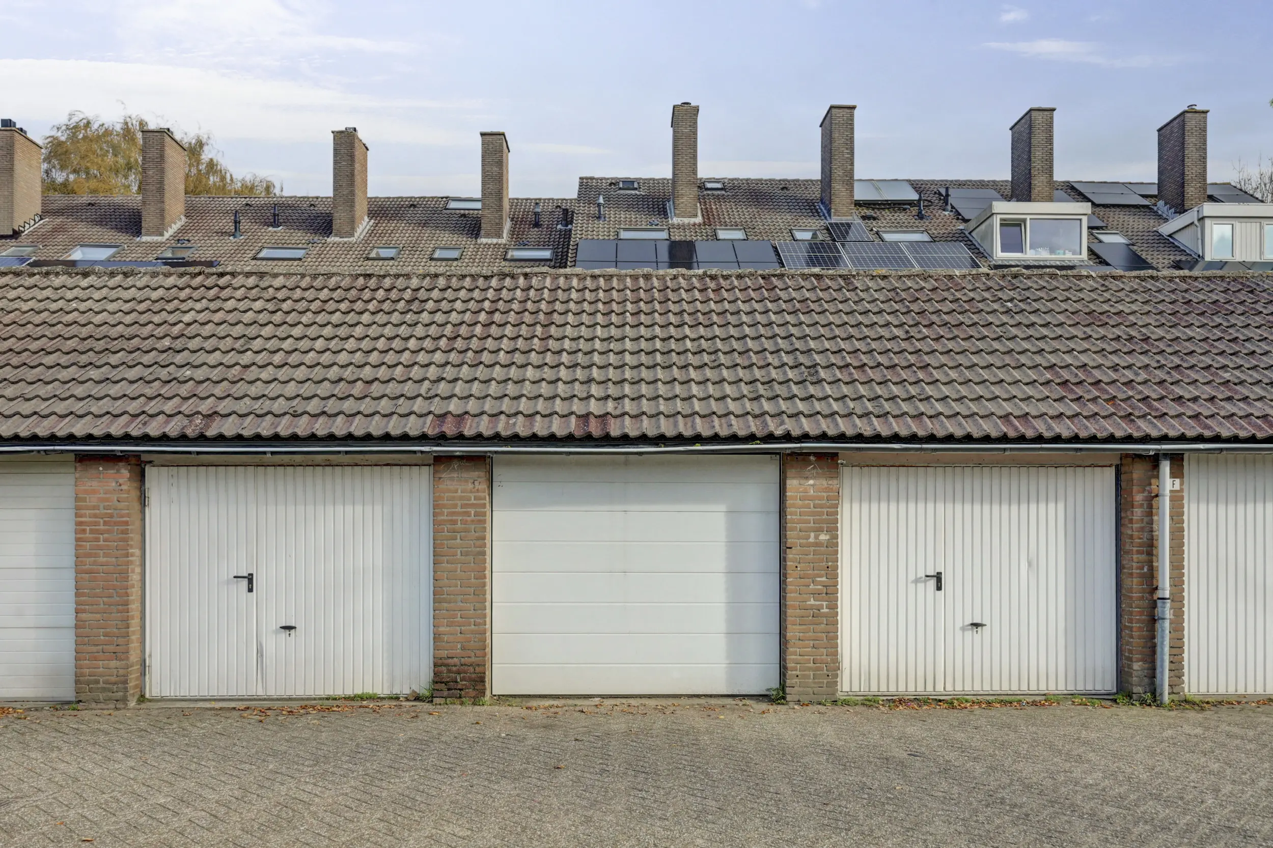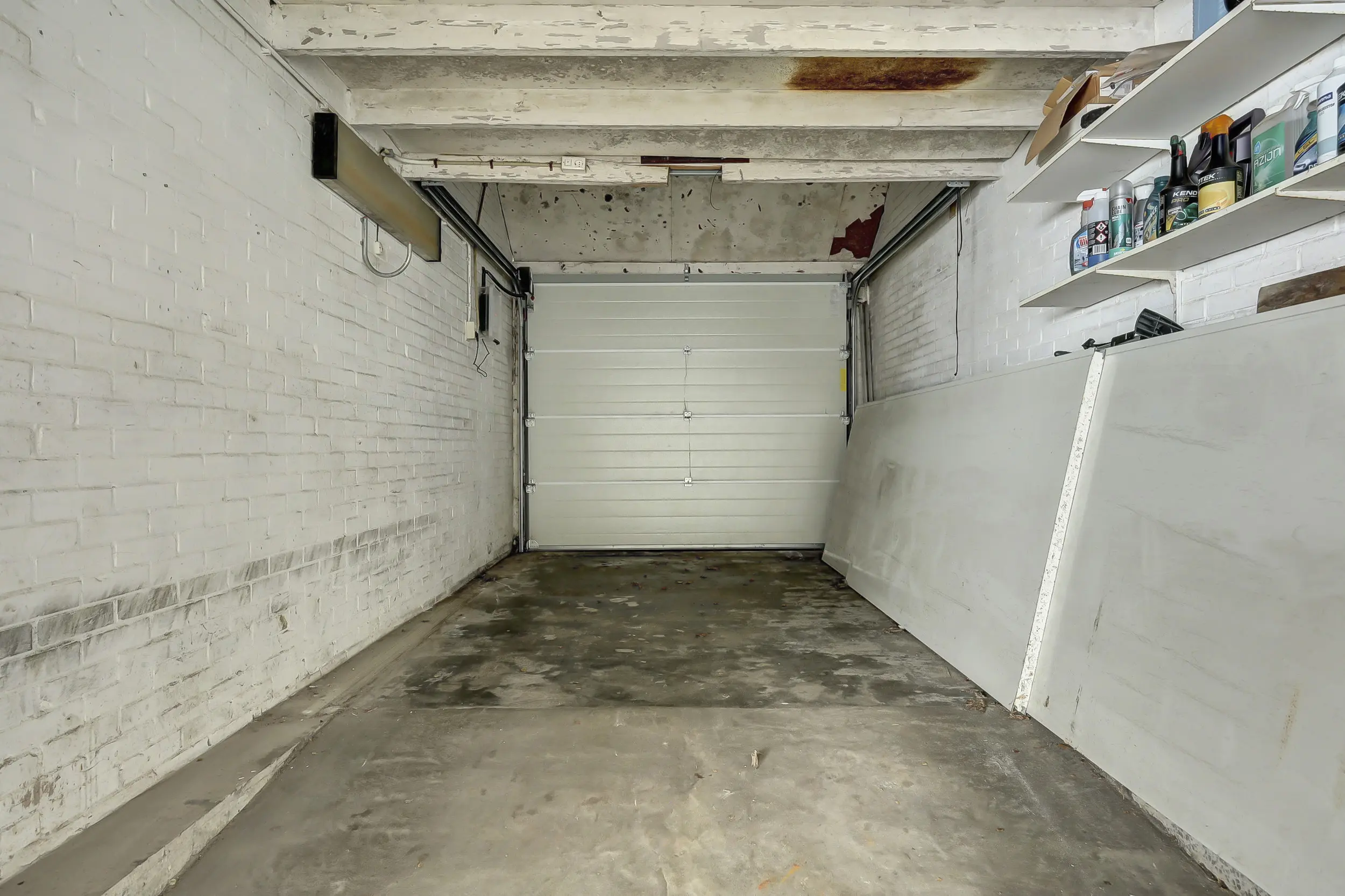 Ruime garage aansluitend aan de achtertuin, met elektrische deur en grote bergvliering.