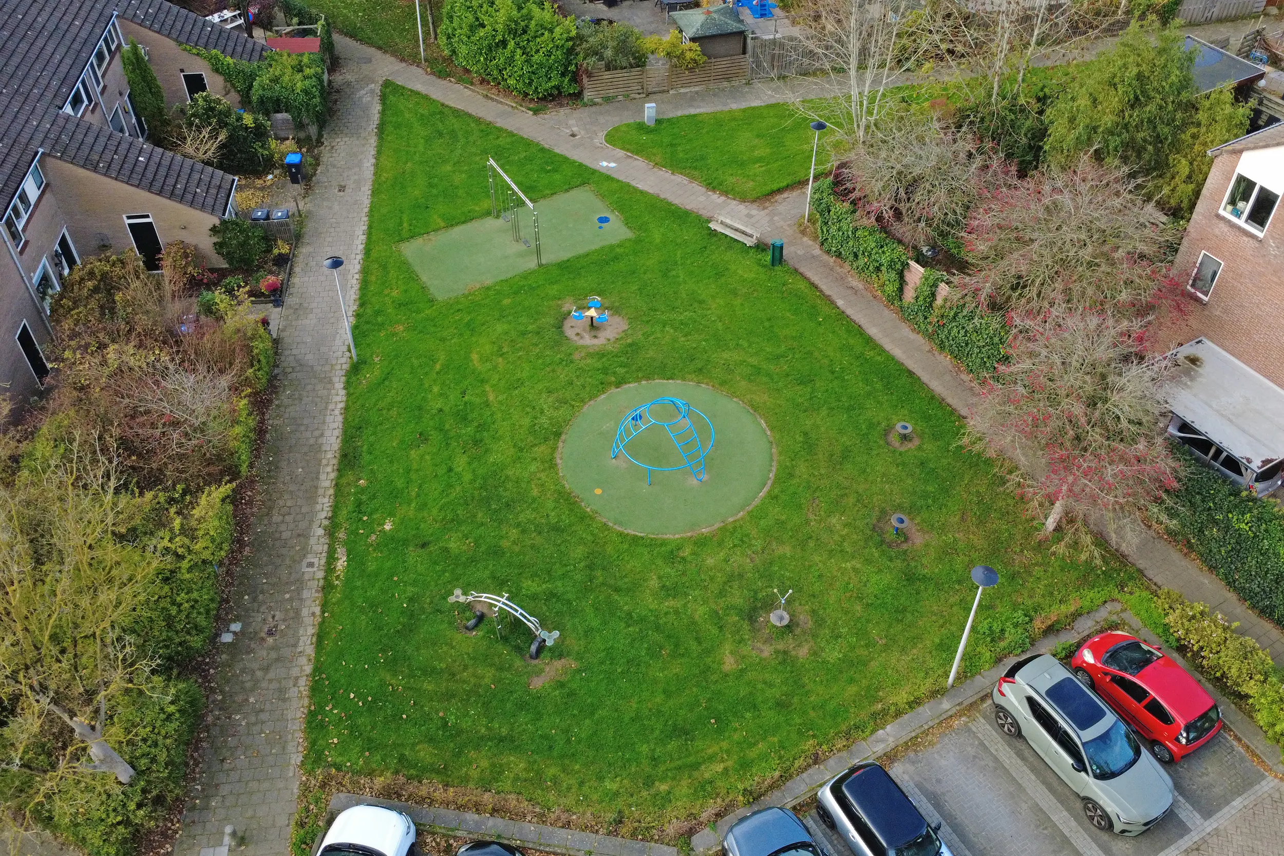 Een voortuin, aan een voetpad met singel. Besloten achtertuin op het zuidwesten, met zonneterras en lager gelegen berging met toegang tot de achtergelegen garage.