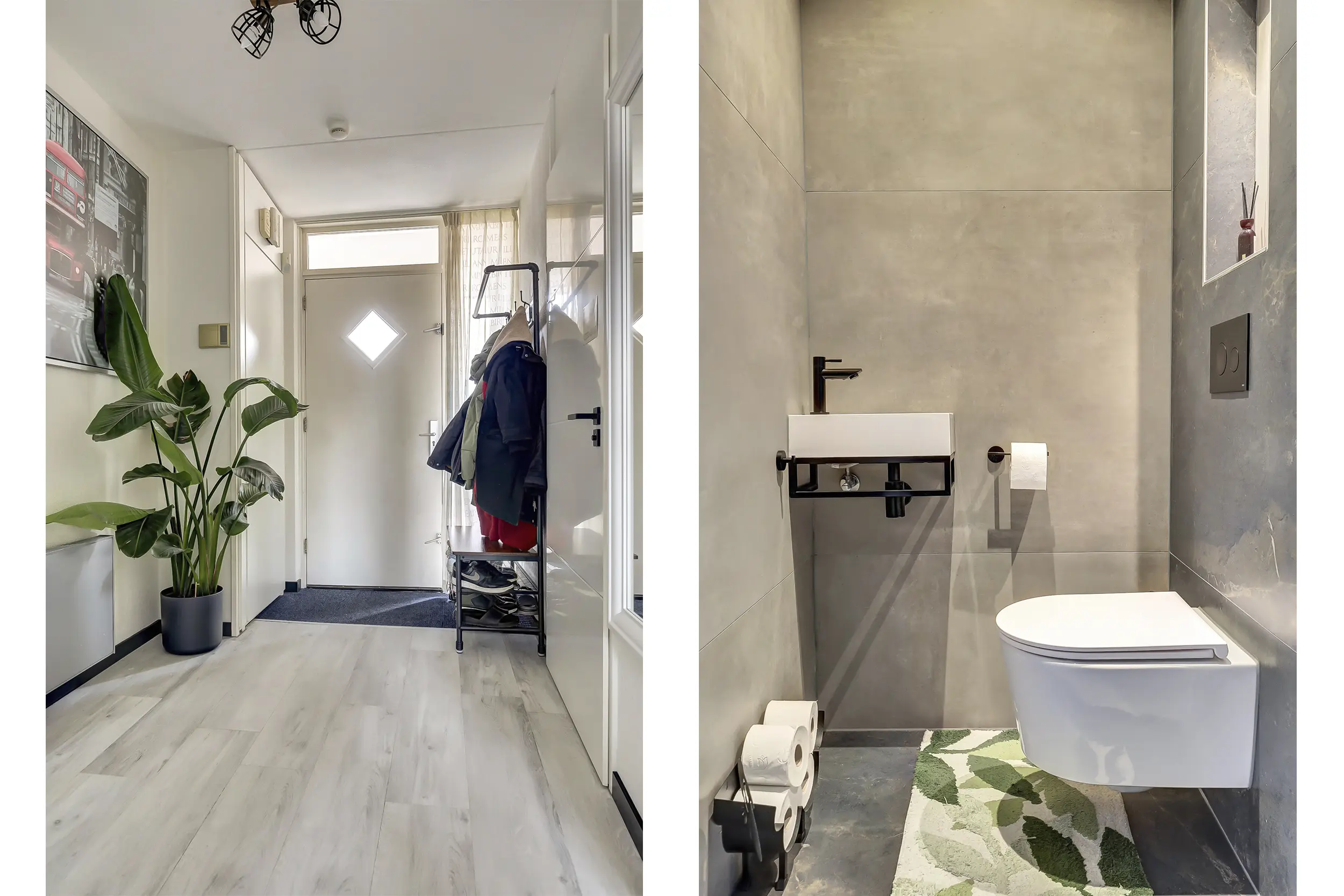 Via galerij de entree met meterkast en toegang naar het toilet met fontein.