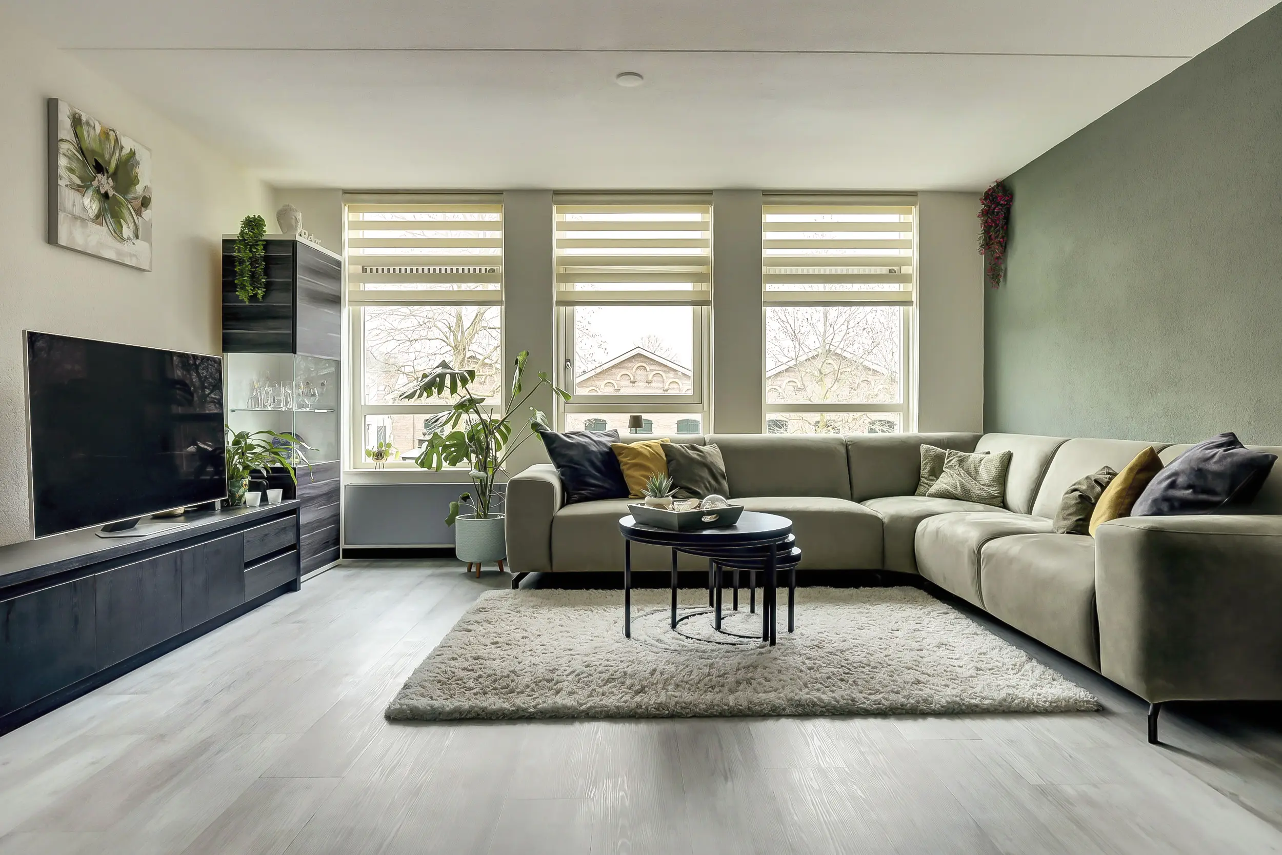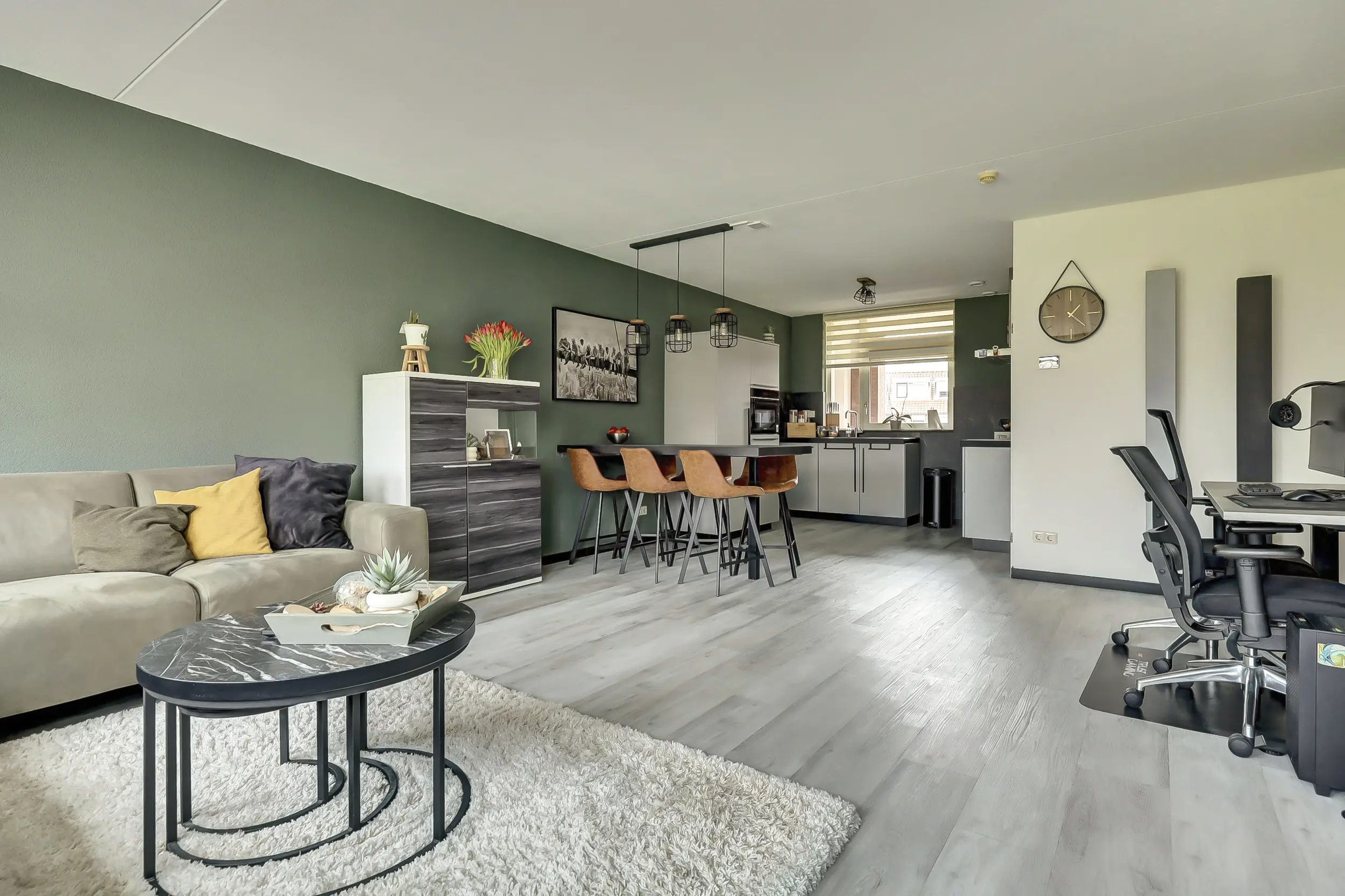 Ruime woonkamer met laminaatvloer (gehele appartement) en uitzicht over de sloepenloods en Brielse wallen.