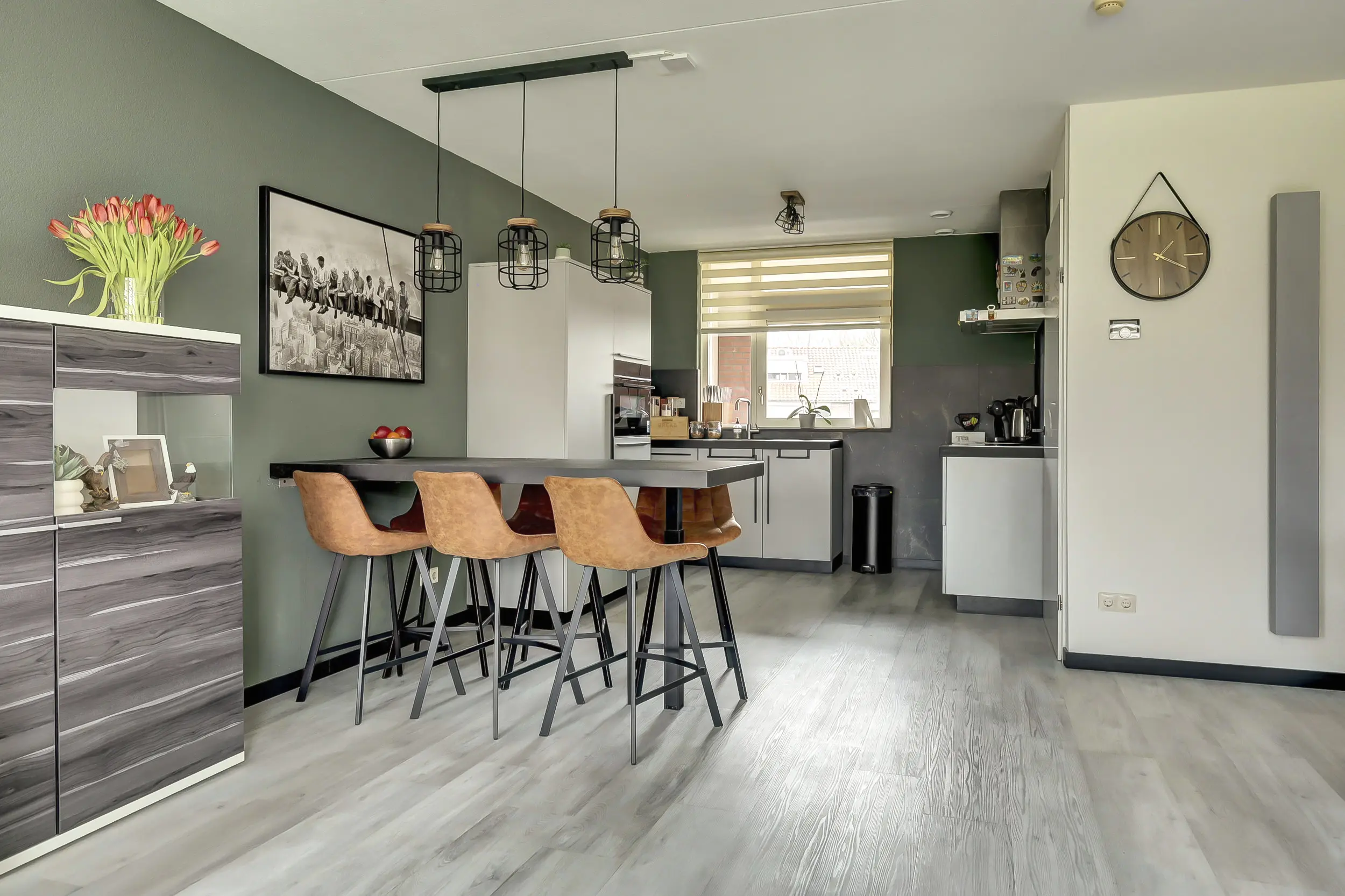 Moderne open keuken in drie wandopstellingen met inbouwapparatuur; koelkast, vaatwasser, combi-magnetron, inductiekookplaat en afzuigschouw.