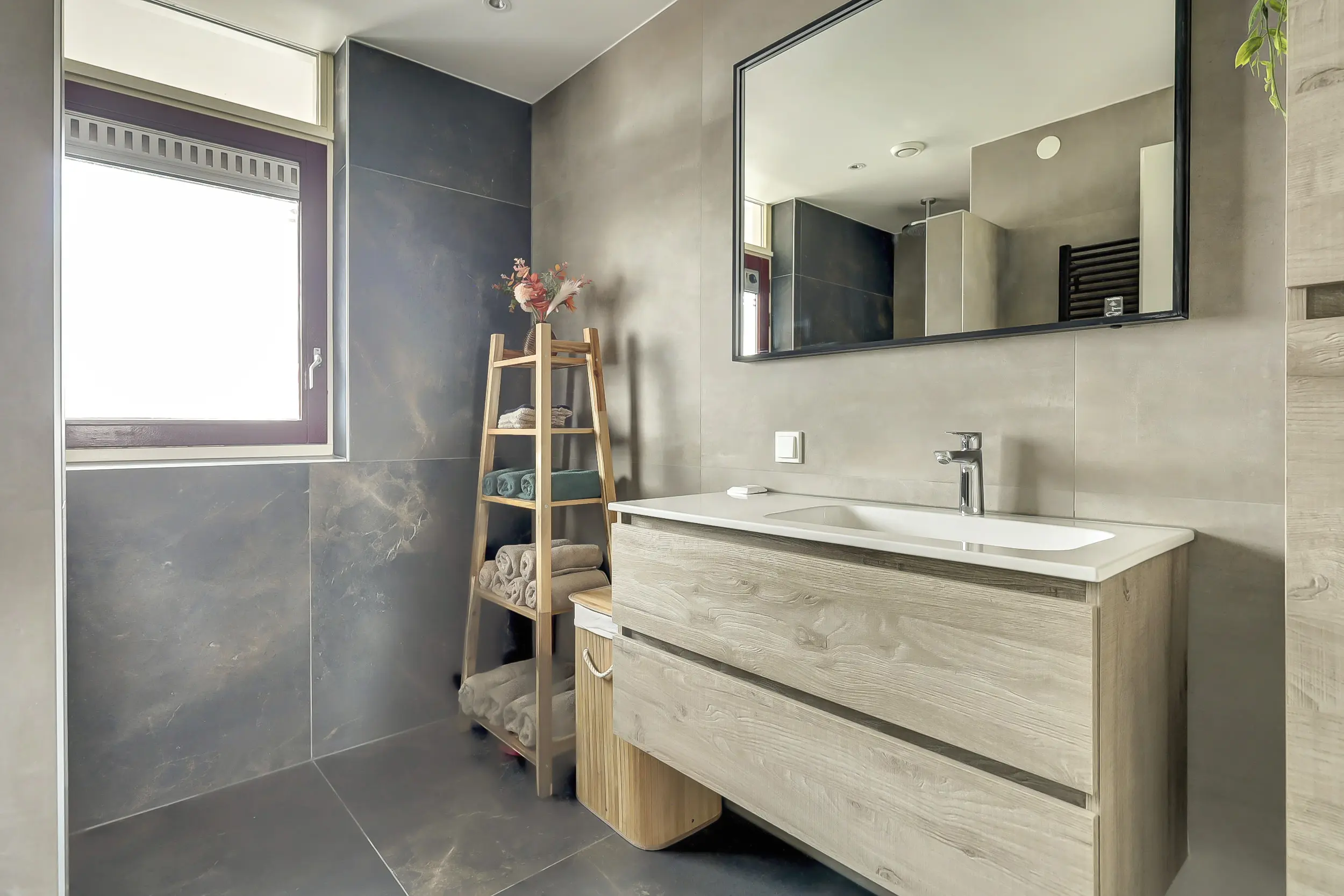 De ruime badkamer is geheel betegeld met een wastafelmeubel en een inloopdouche.